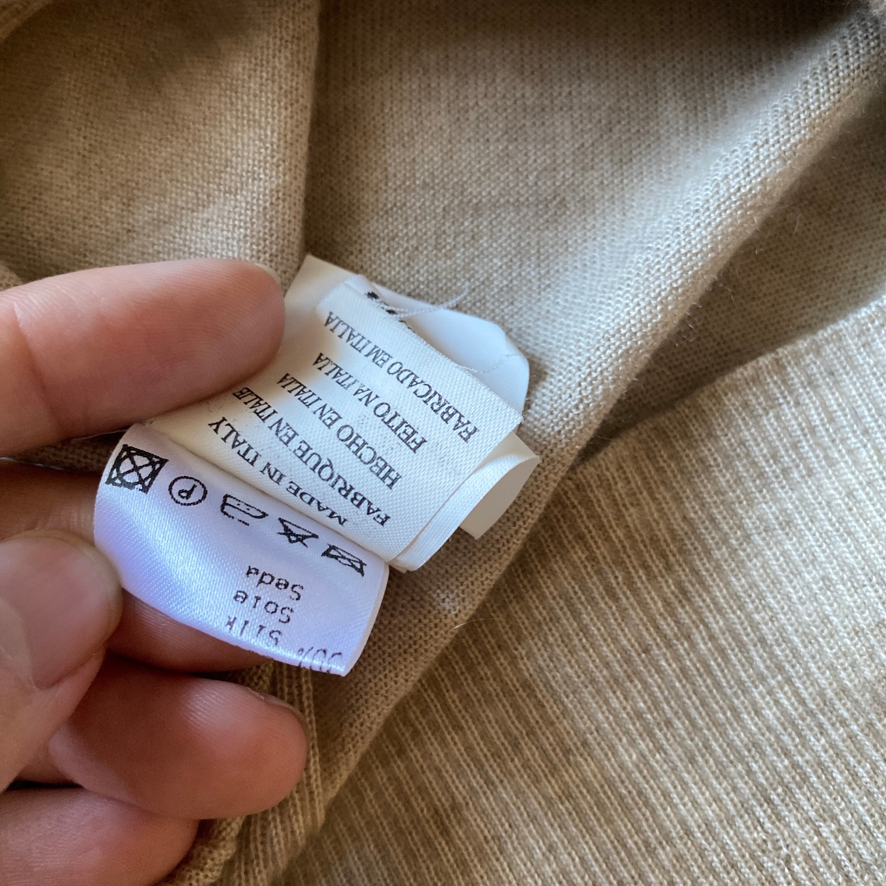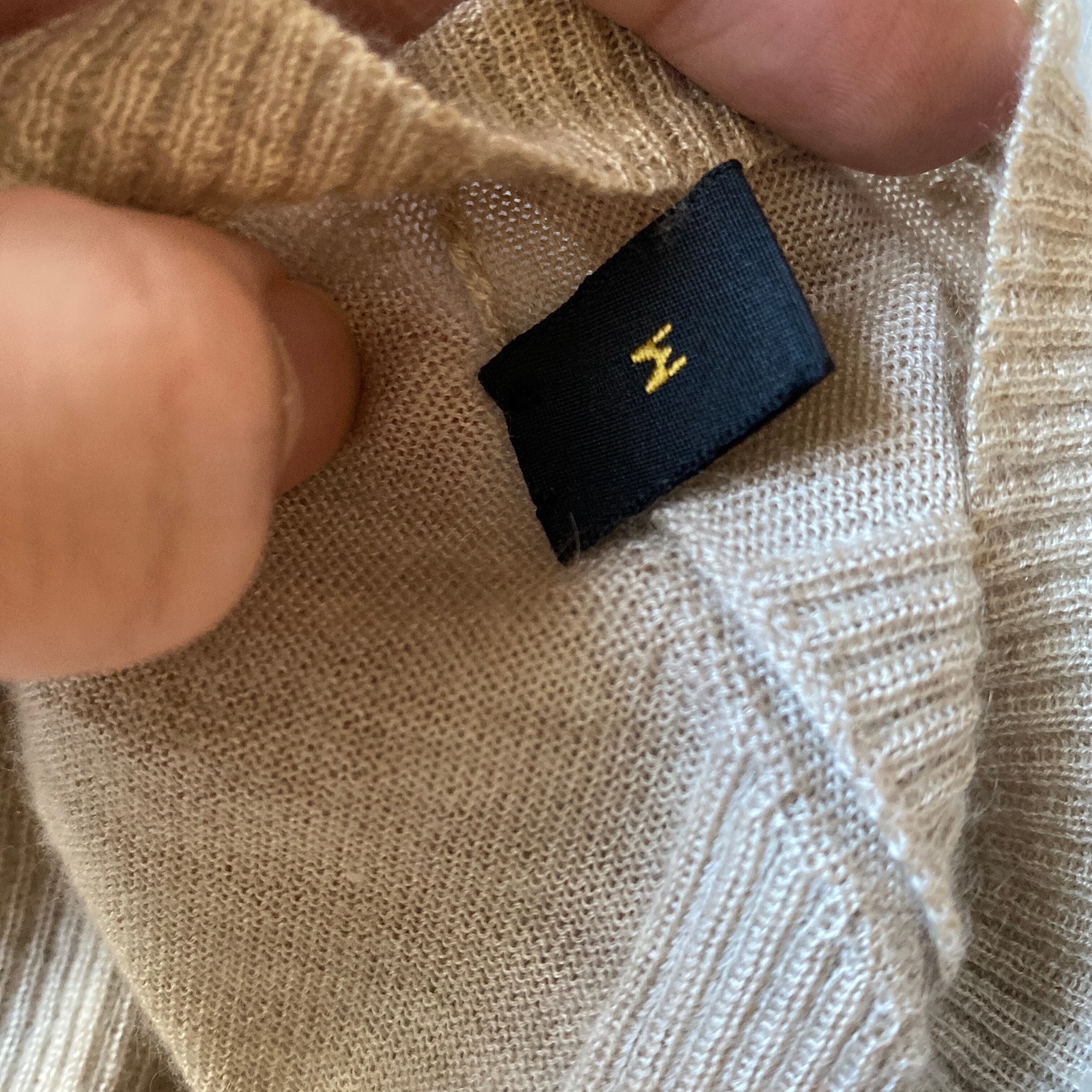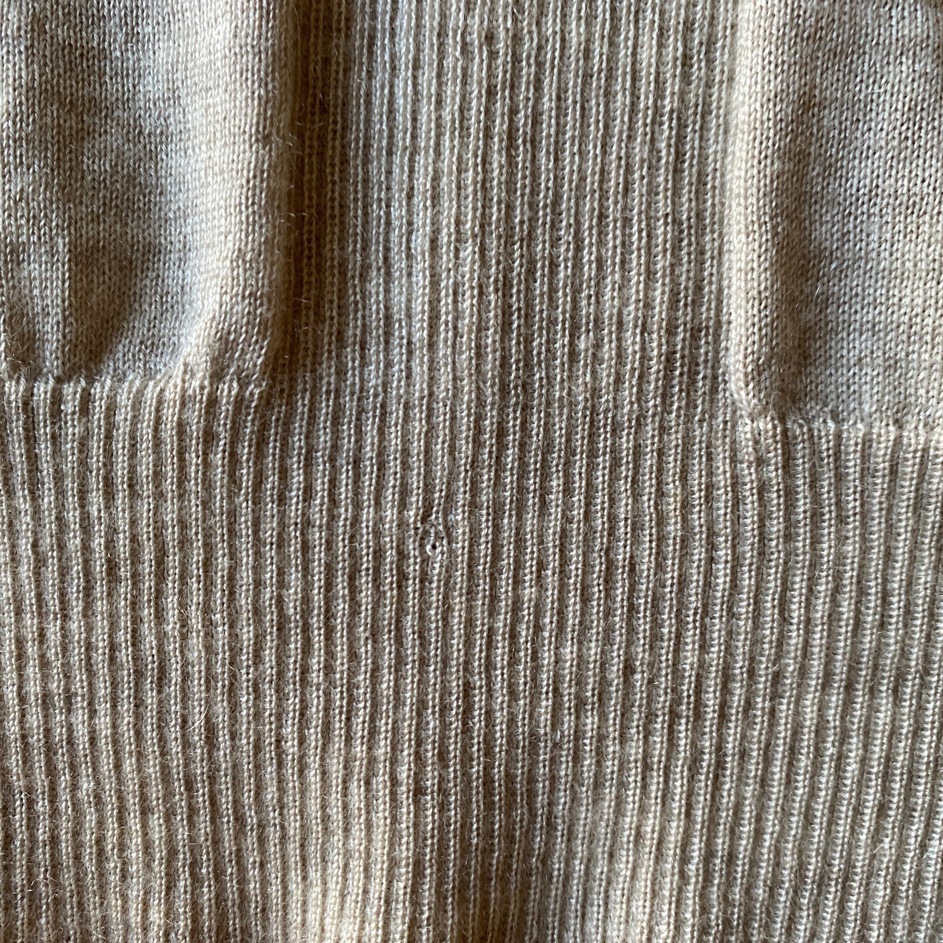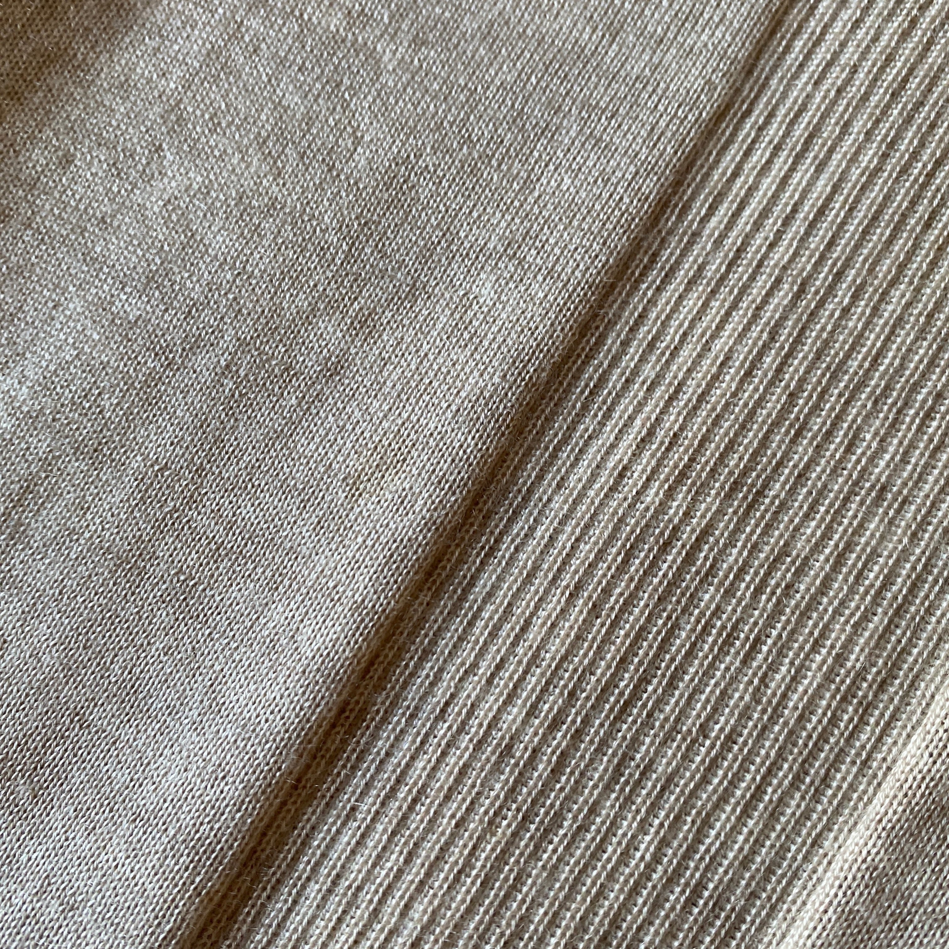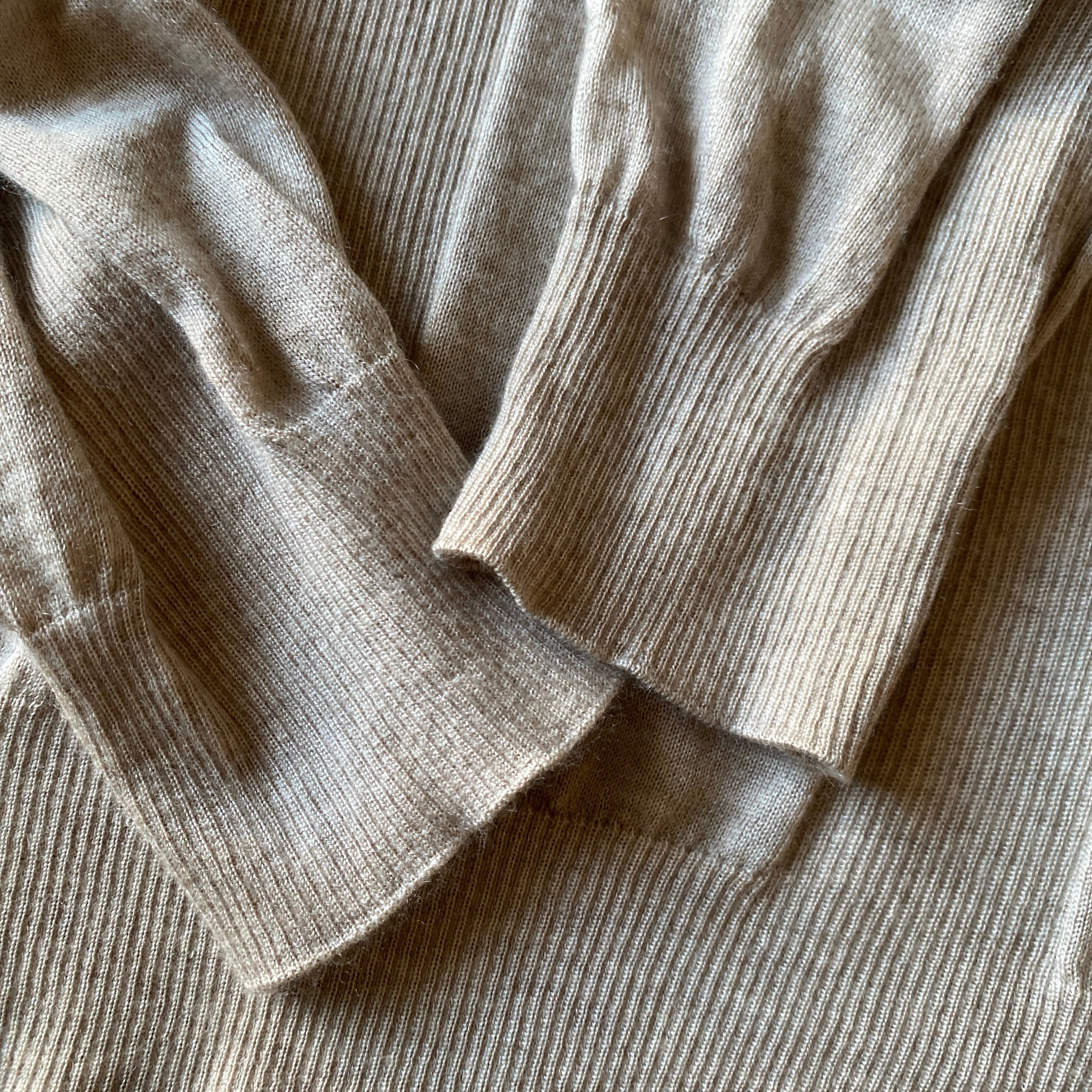 非常に滑らかで柔らかいカシミヤシルクのハイゲージニットに、ライトベージュ系の上品な色目、デザインの入ったvネックのデザインが格好良い一着。