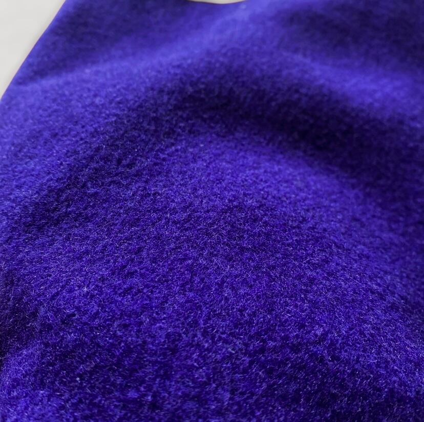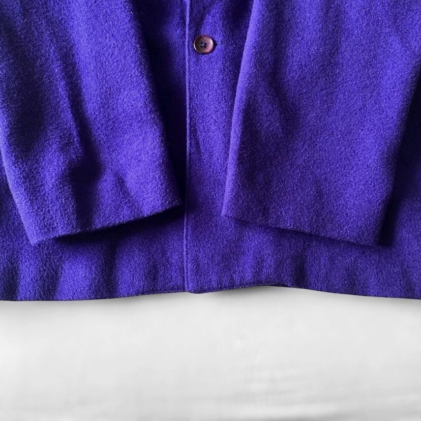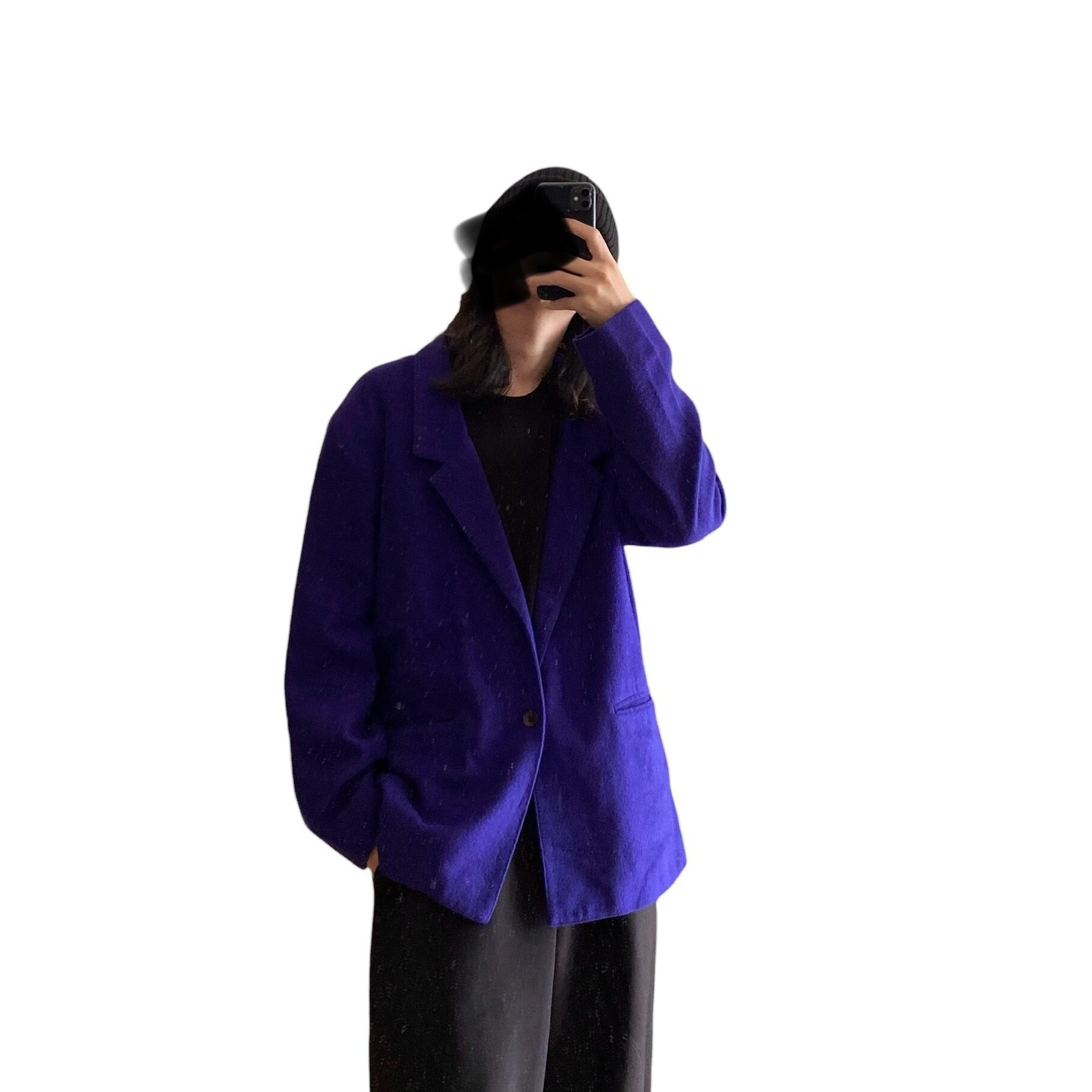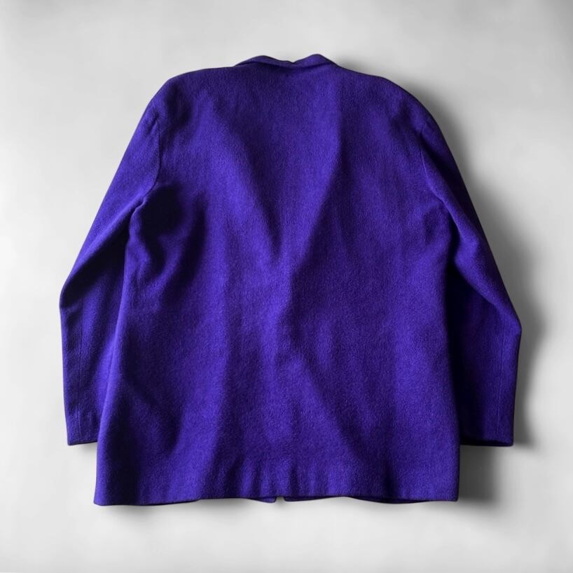 パープルみのある上品なブルーに、柔らかいウールベースのメルトン生地、アンコン仕様のゆったりとしたボックスシルエットが非常に格好良い一着。
