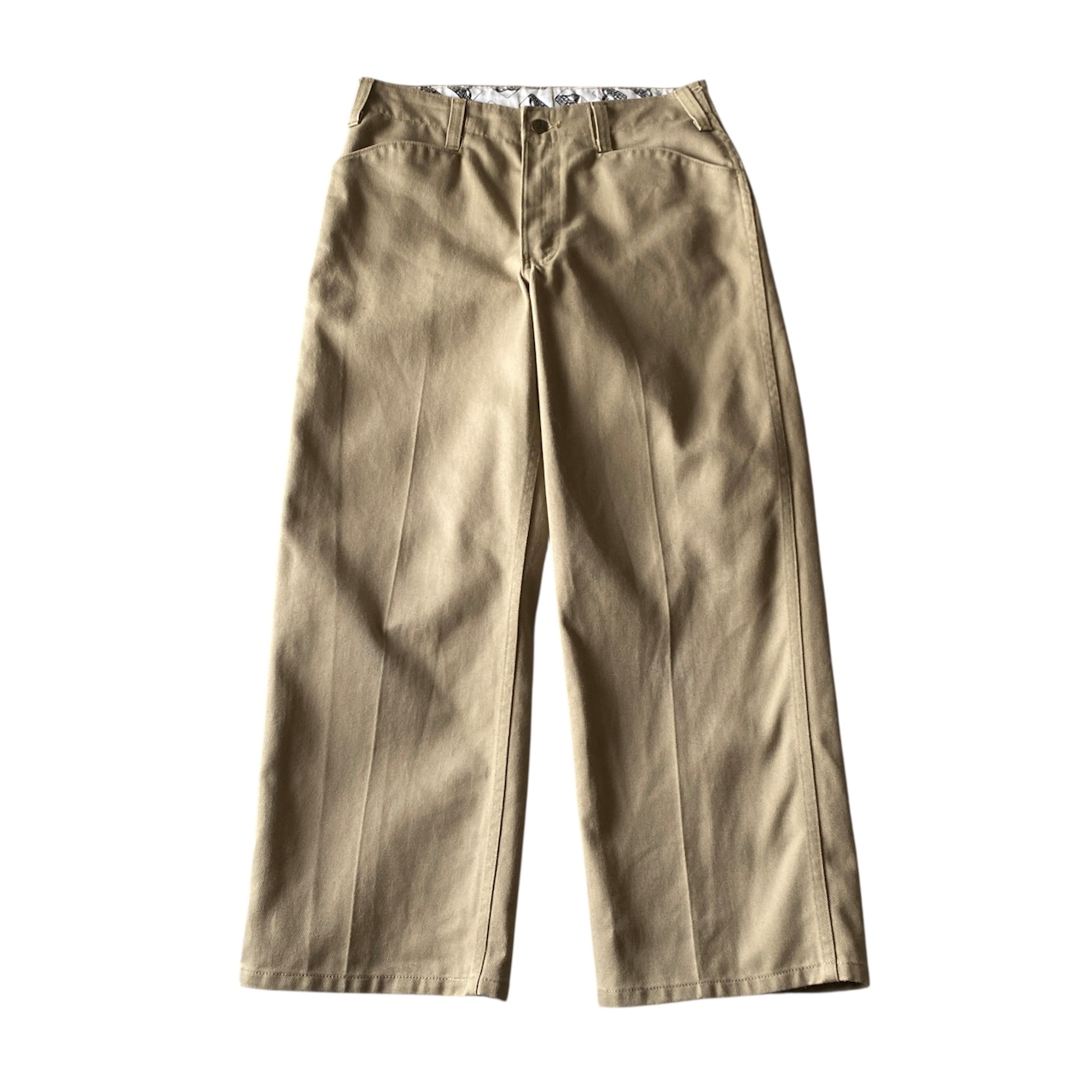 このモデル特有のストンと落ちるワイドストレートなシルエット、ハリコシのある生地感、カーキベージュの綺麗な色目が素晴らしいです。