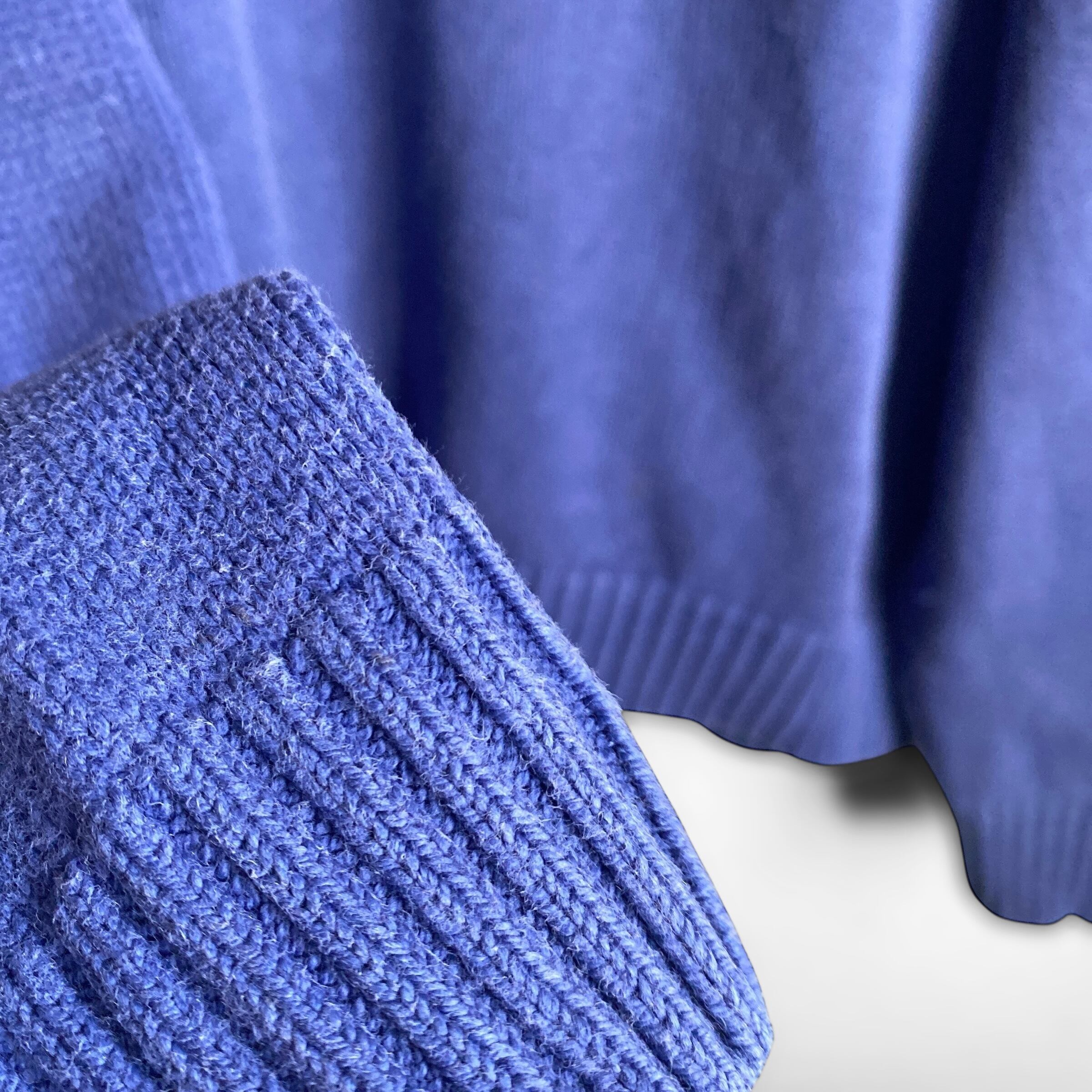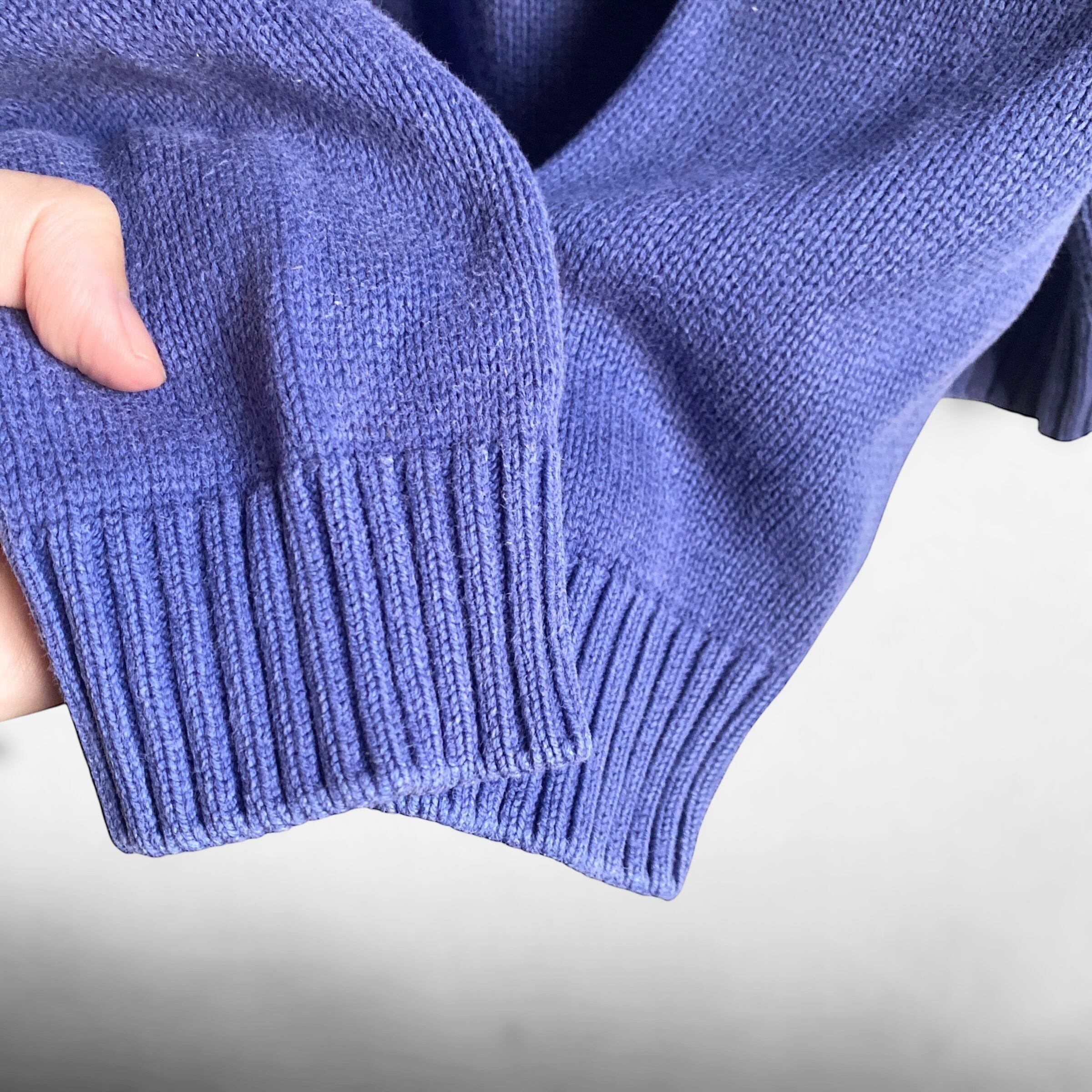 比較的珍しい、ややフェードしたラベンダーパープル系カラーに、肉厚でしっかりとしたコットンニット素材、ゆったりとした丸みのあるボックスシルエットが非常に格好良い一着。