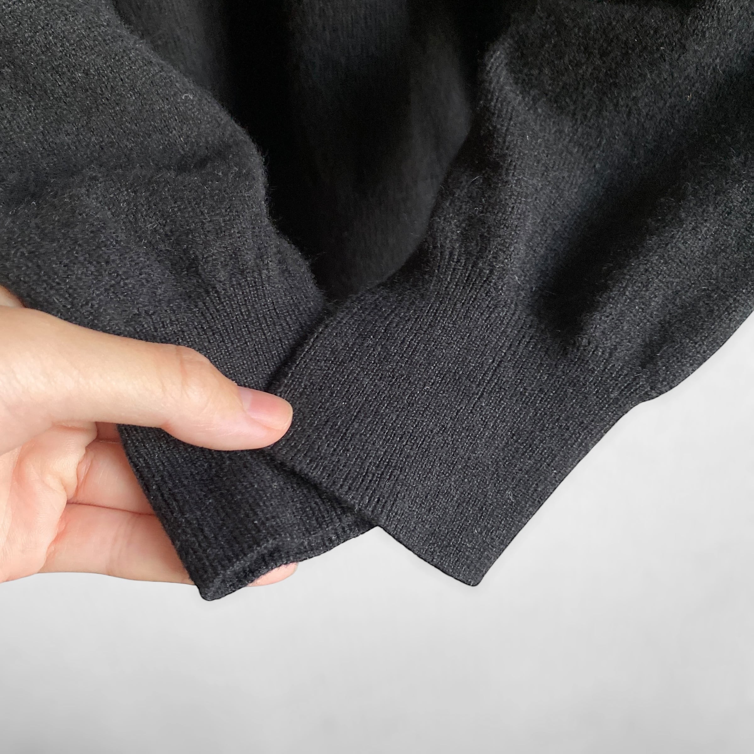 特別カシミヤの質がずば抜けているというわけではありませんが、シルエットとVネックの深さが絶妙です。(実寸はやや丈が長く感じると思いますが、裾リブがそれなりに効くのでもう少し短く感じるかと)