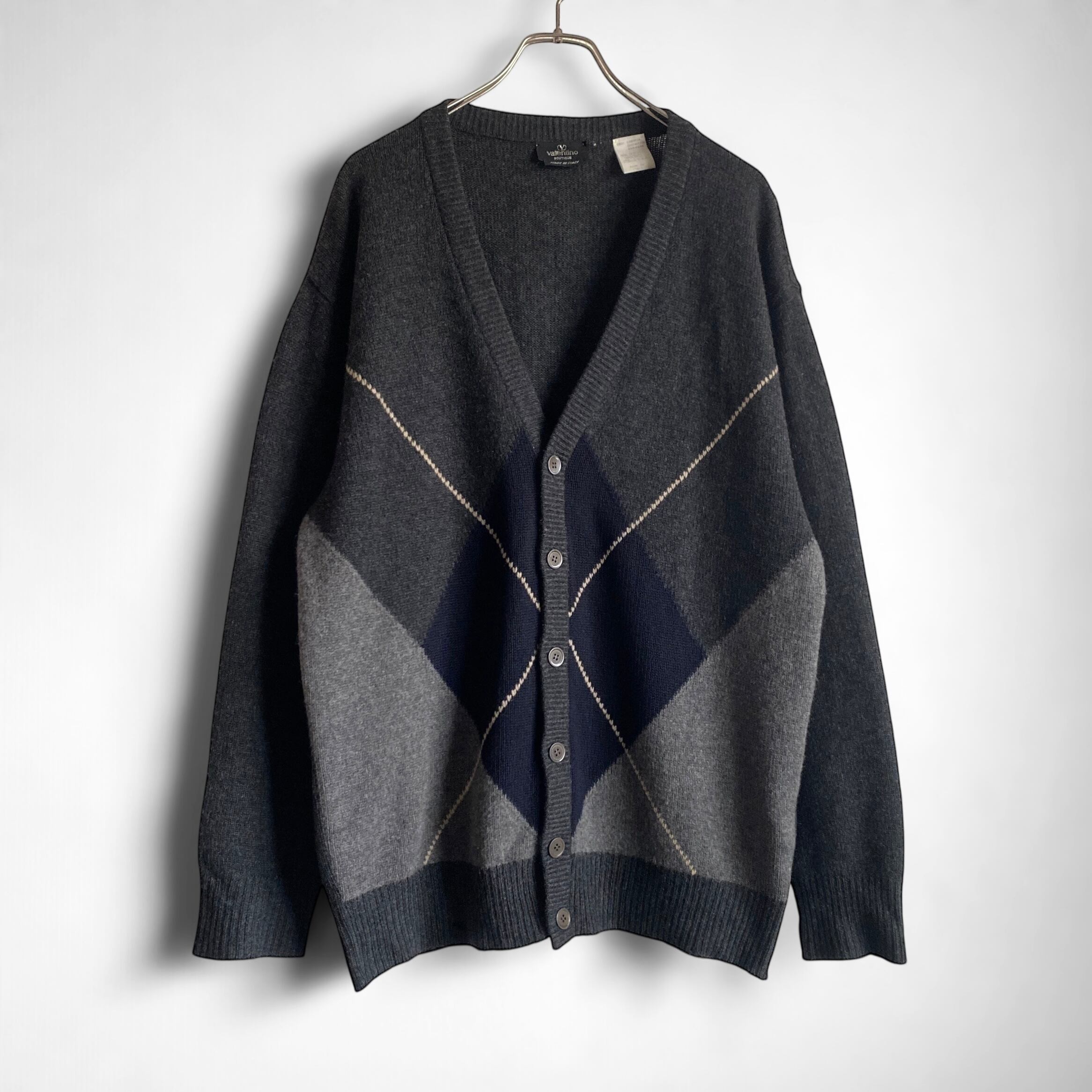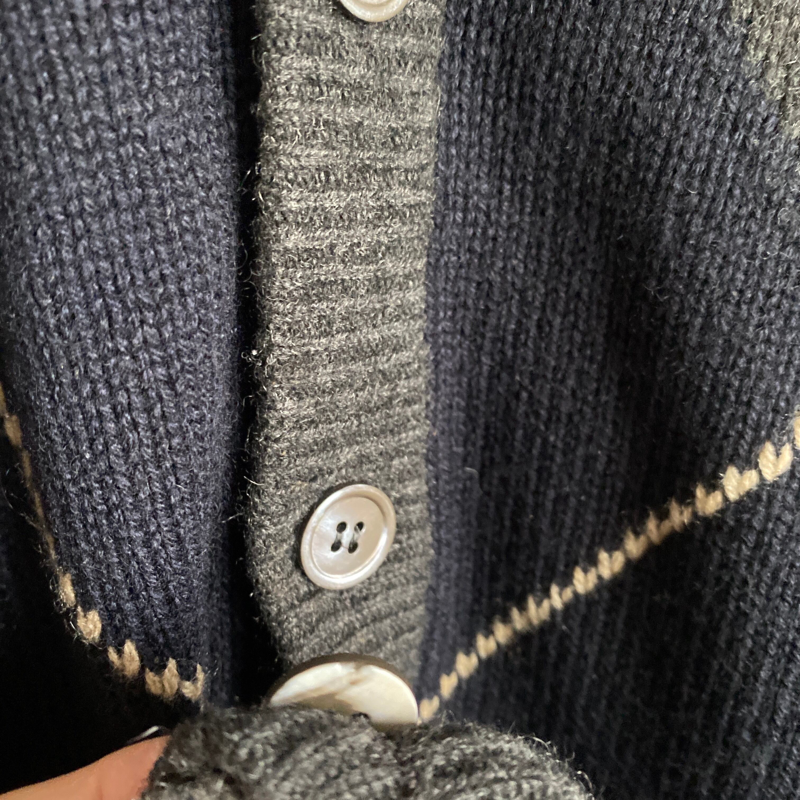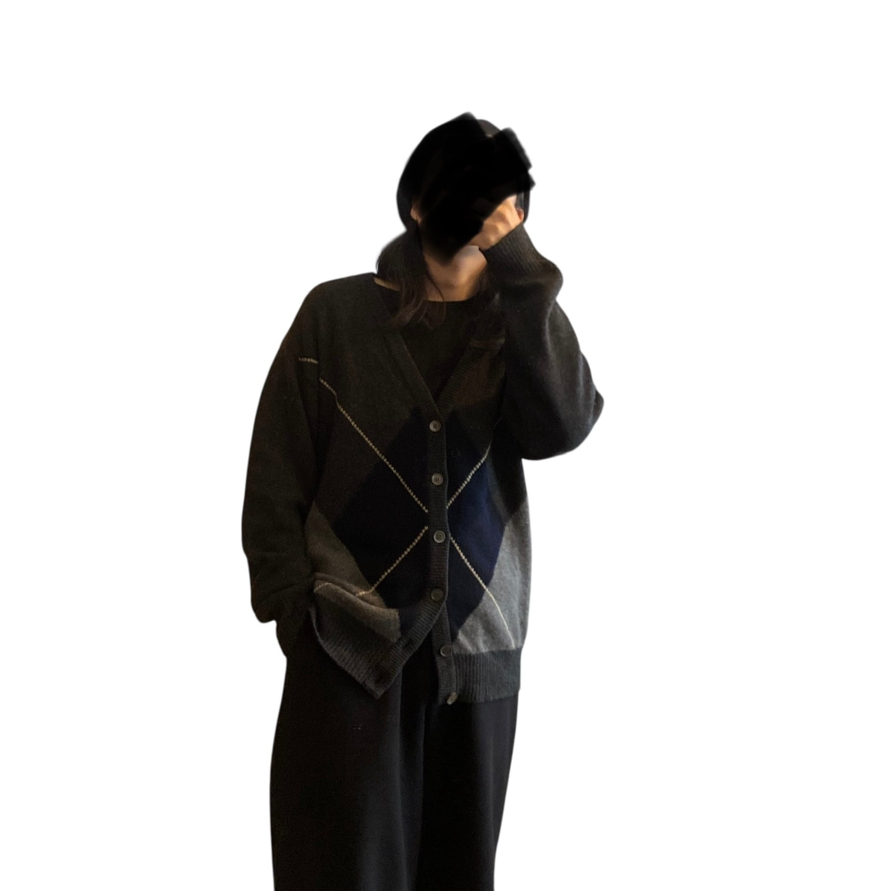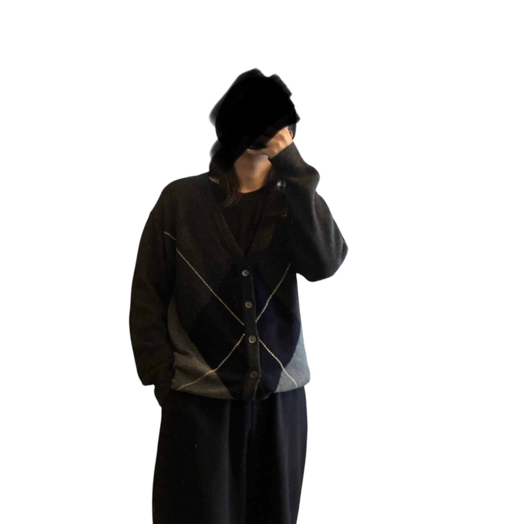 肉厚でもちっとした上質なカシミヤ生地に、大判なアーガイルデザイン、暗めトーンの上品な色目、程よくゆとりのあるボックス目のシルエットが非常に格好良い一着。
