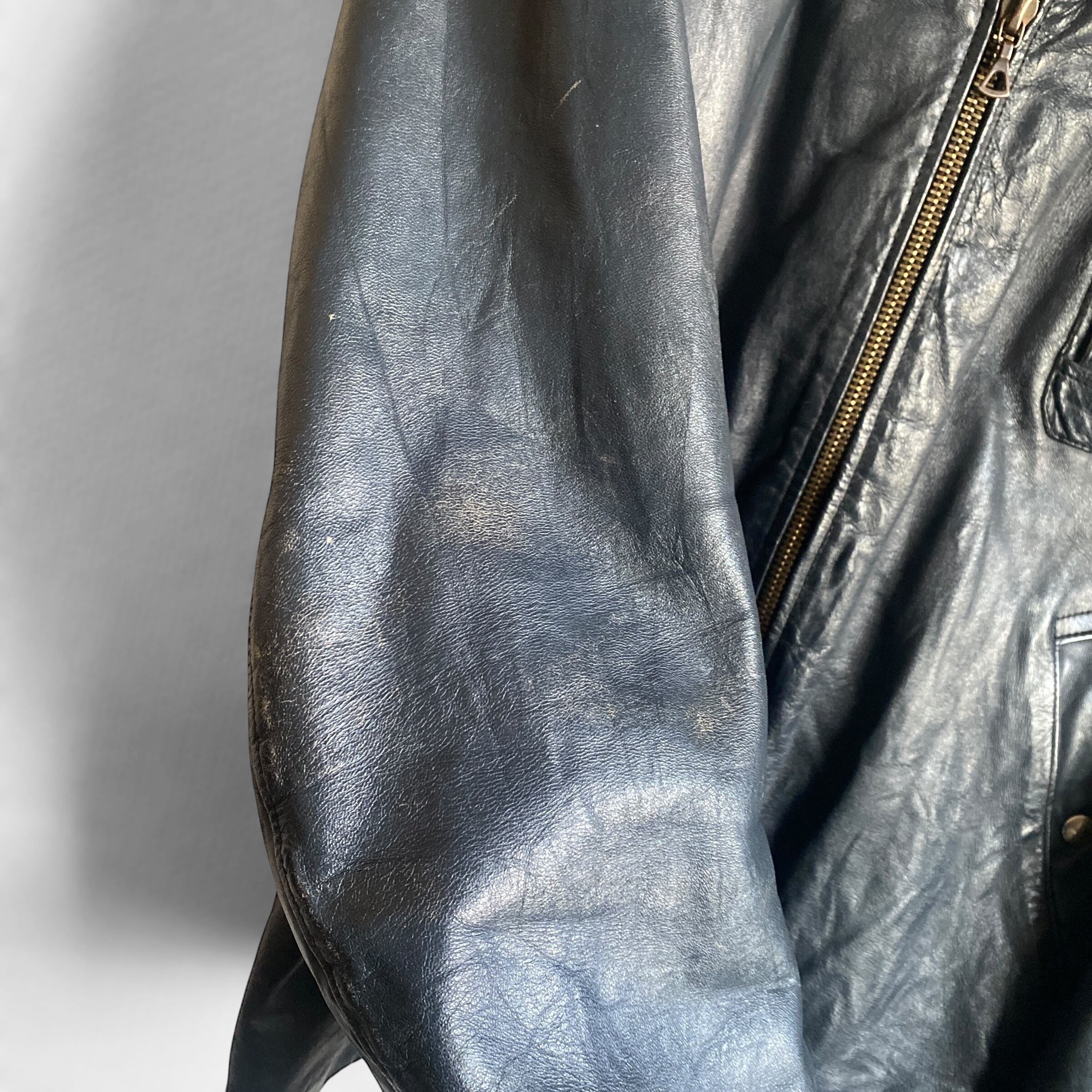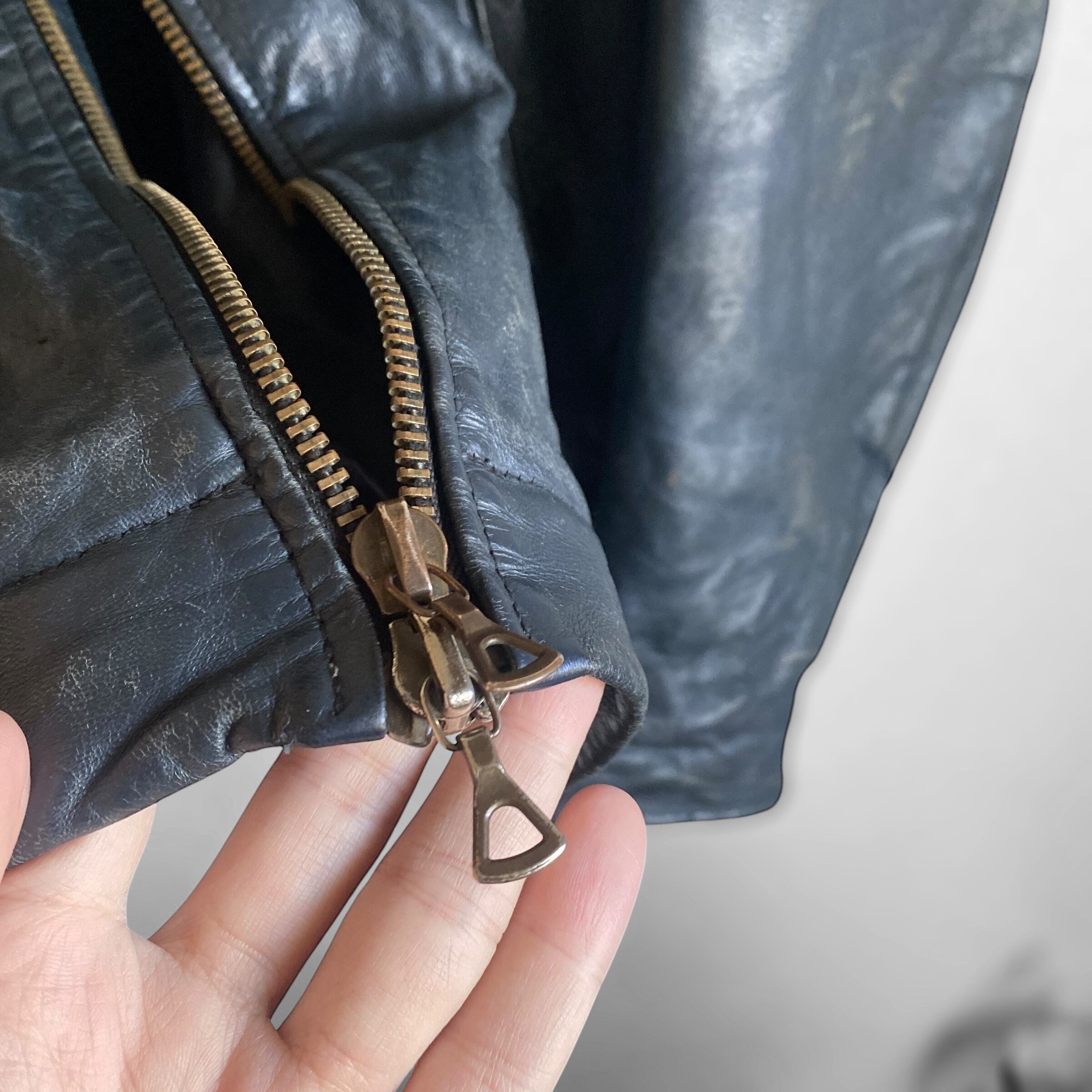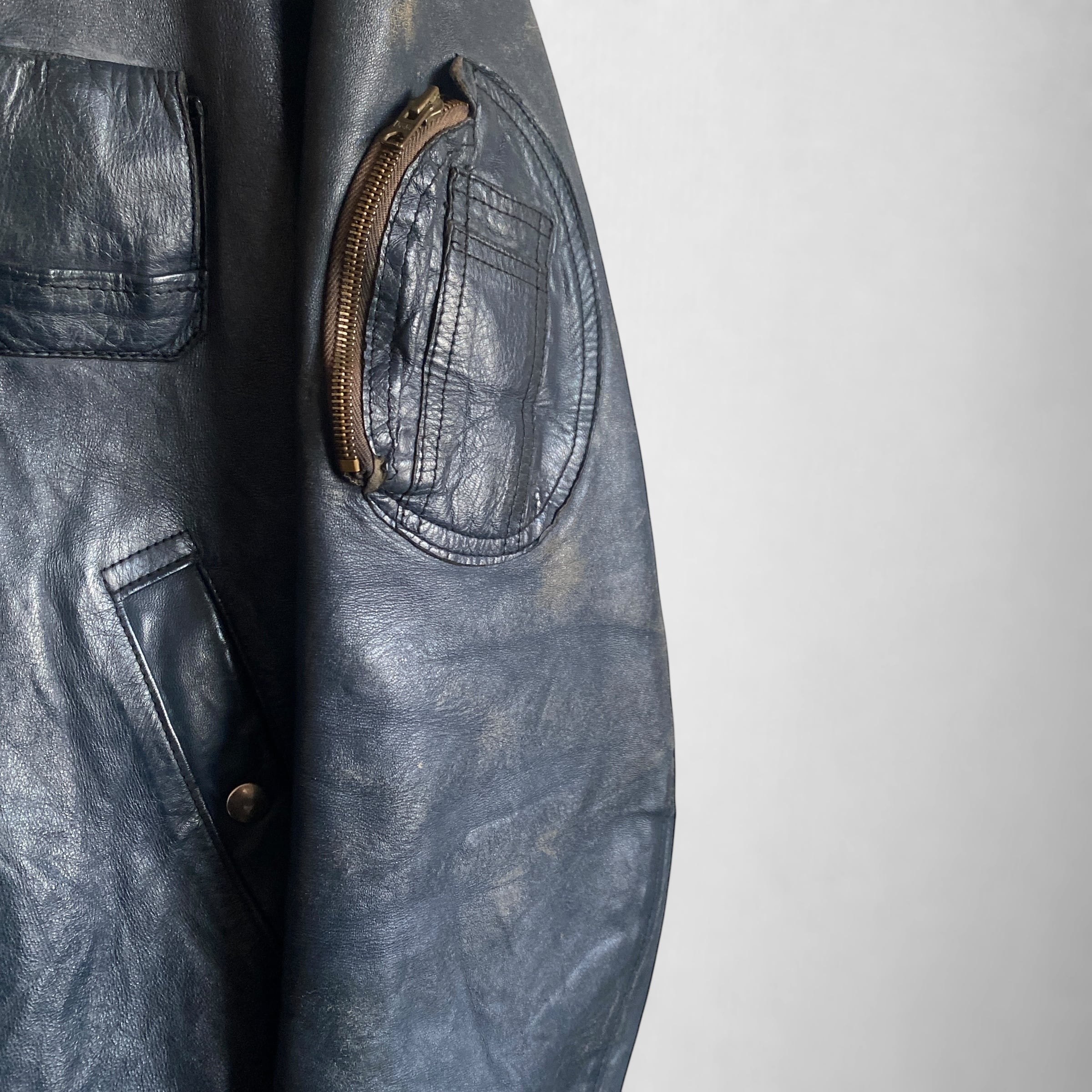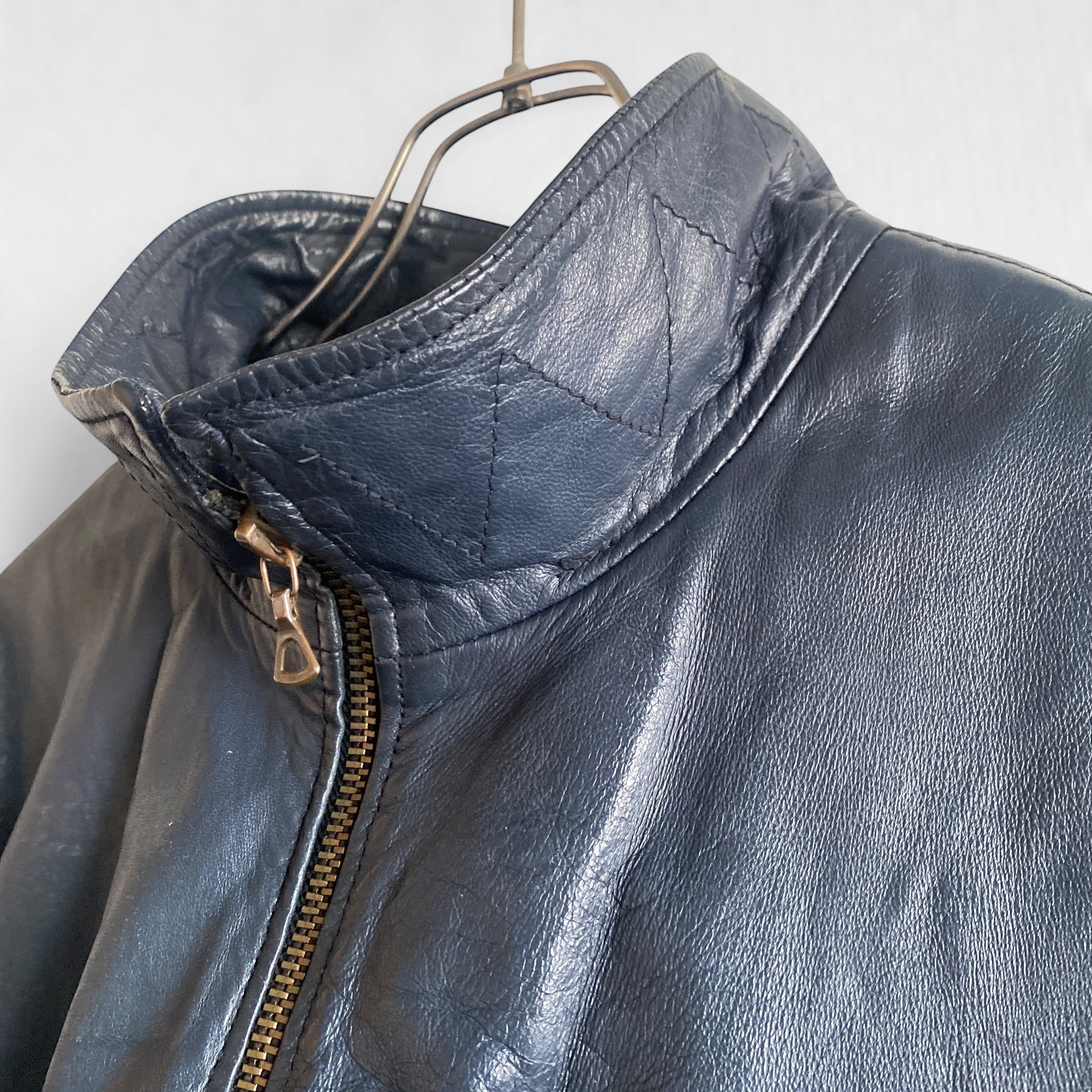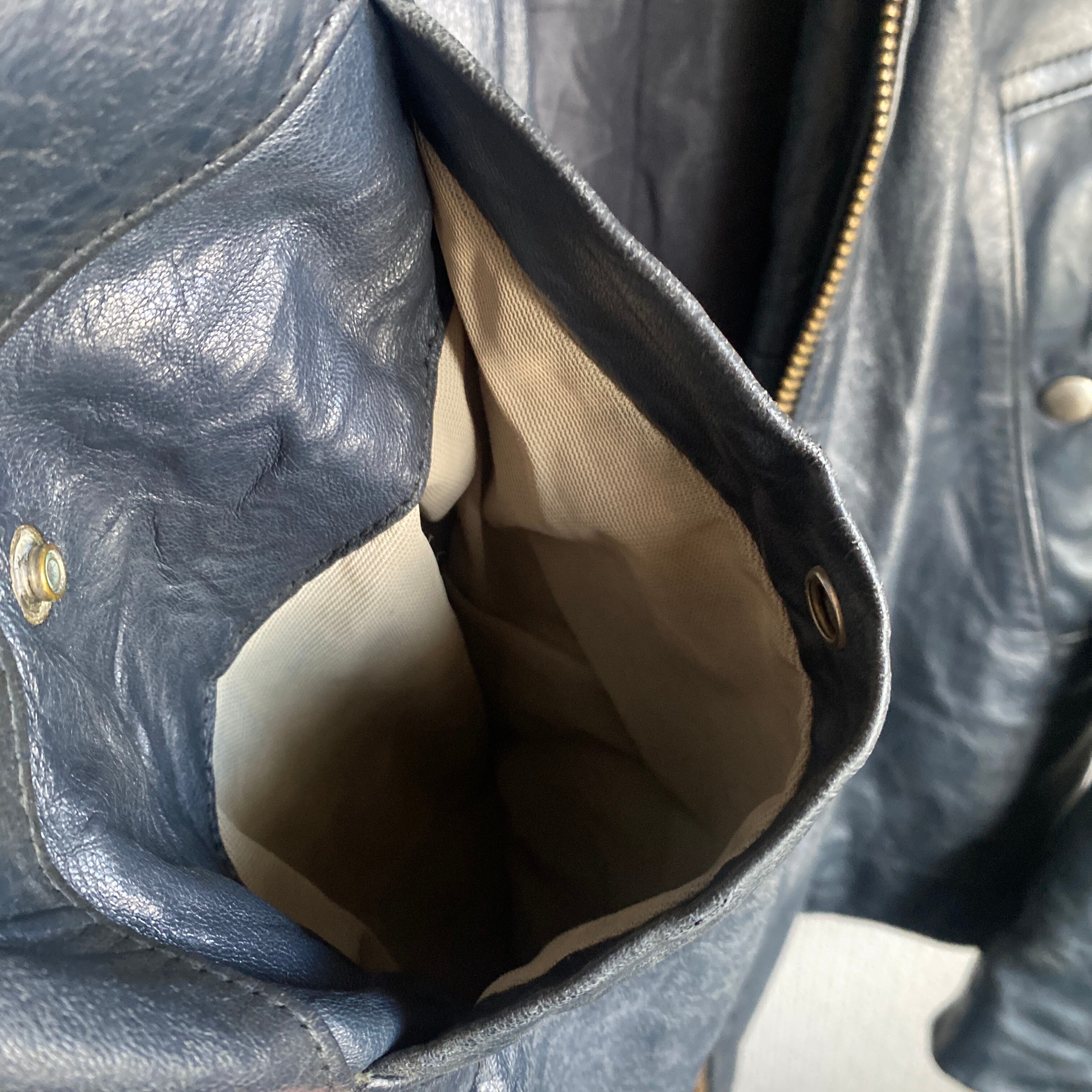 上品なネイビーブルーレザー(おそらく牛革)に、真鍮のダブルジッパー仕様(袖ポケットには珍しいベルギーのKROKO社の物がついております)、バランスがよくゆったりとした短丈ボックスシルエットが非常に格好良い一着。(内側のマジックテープを閉めると折り返して着ることもできます)