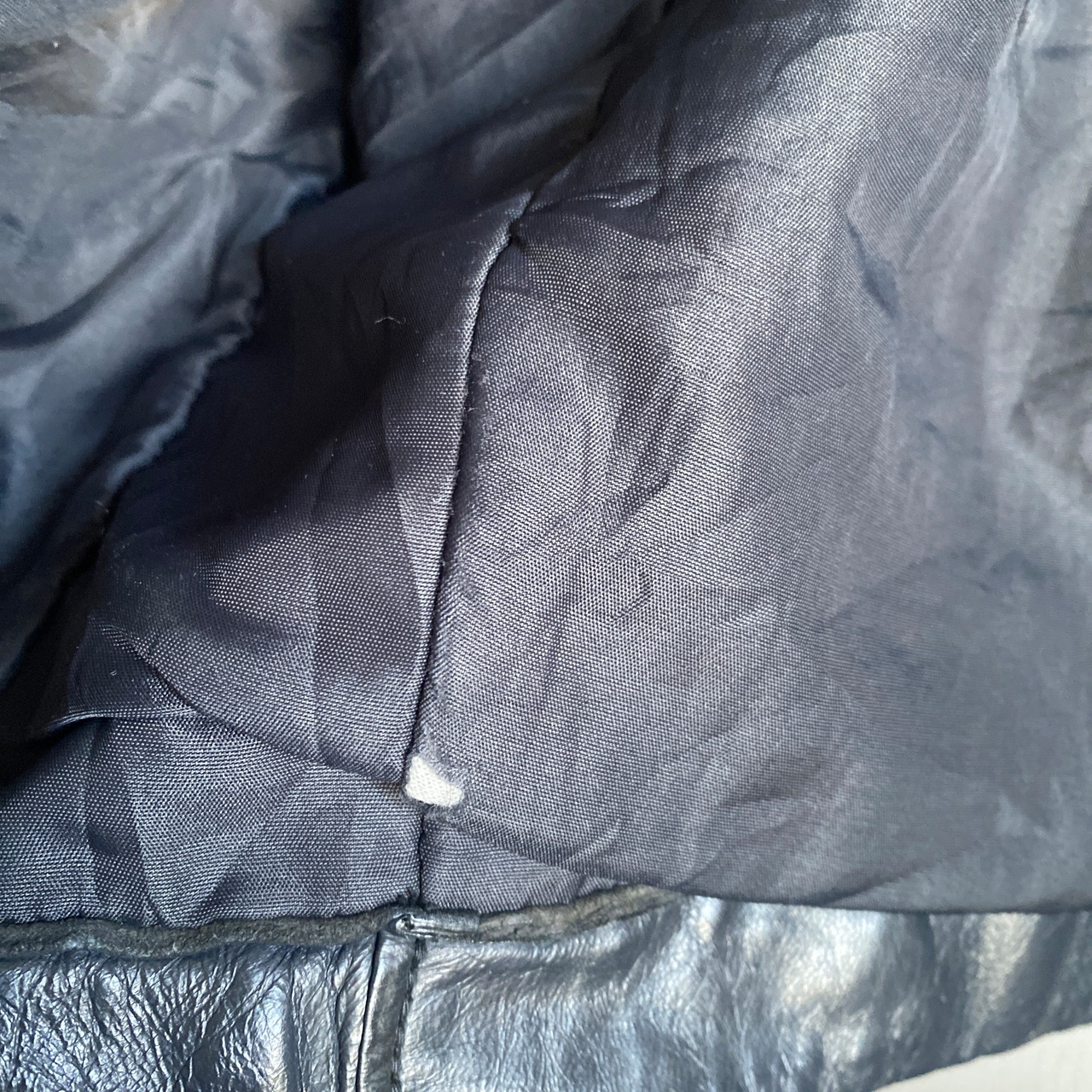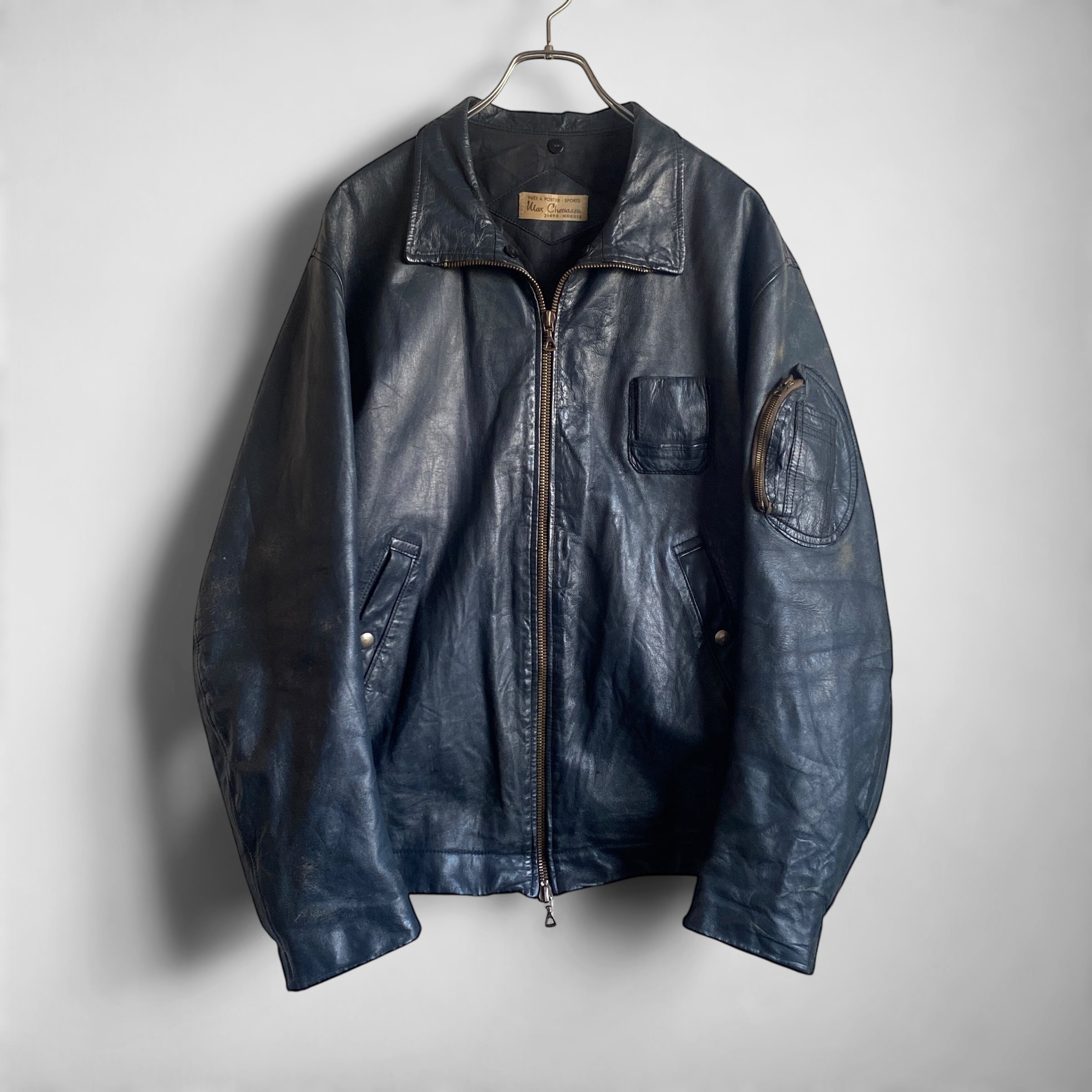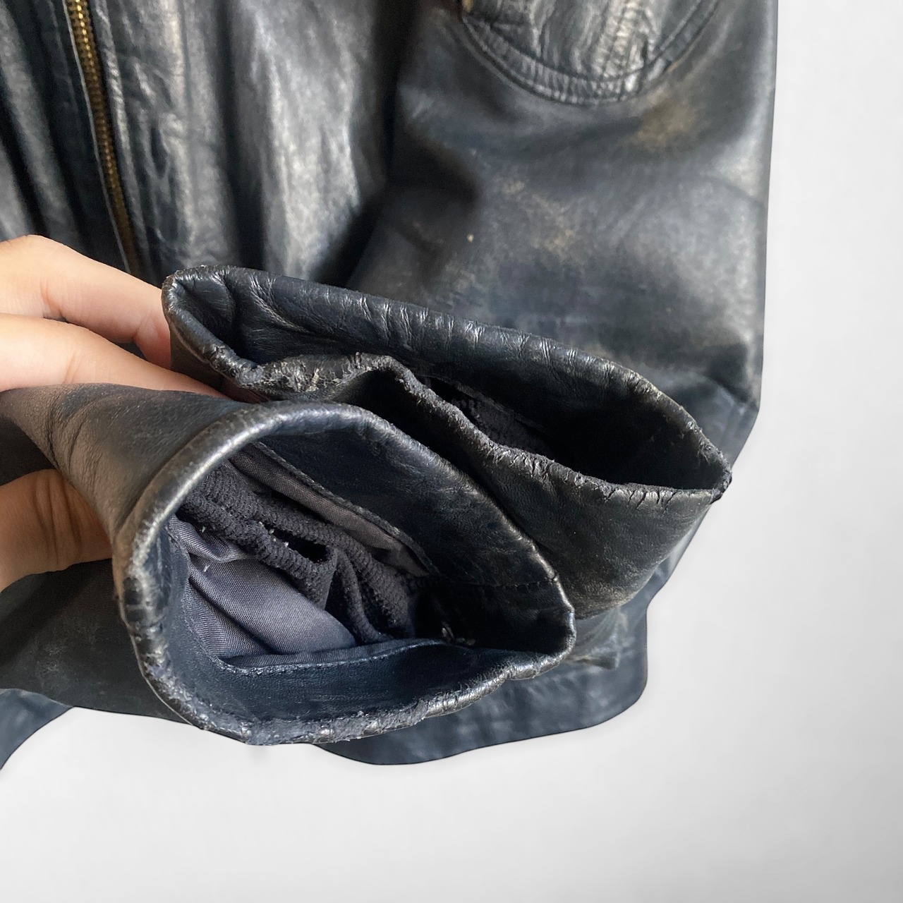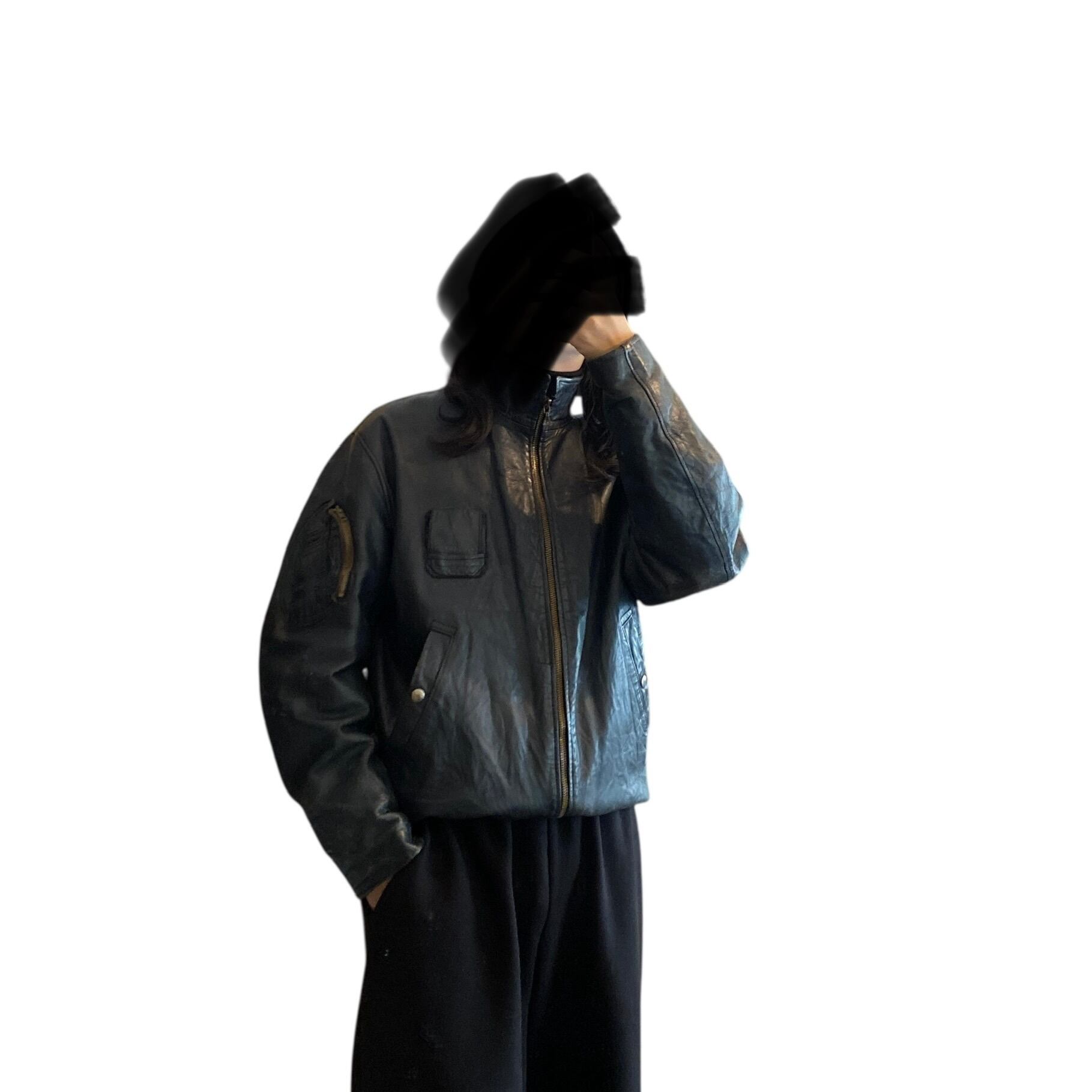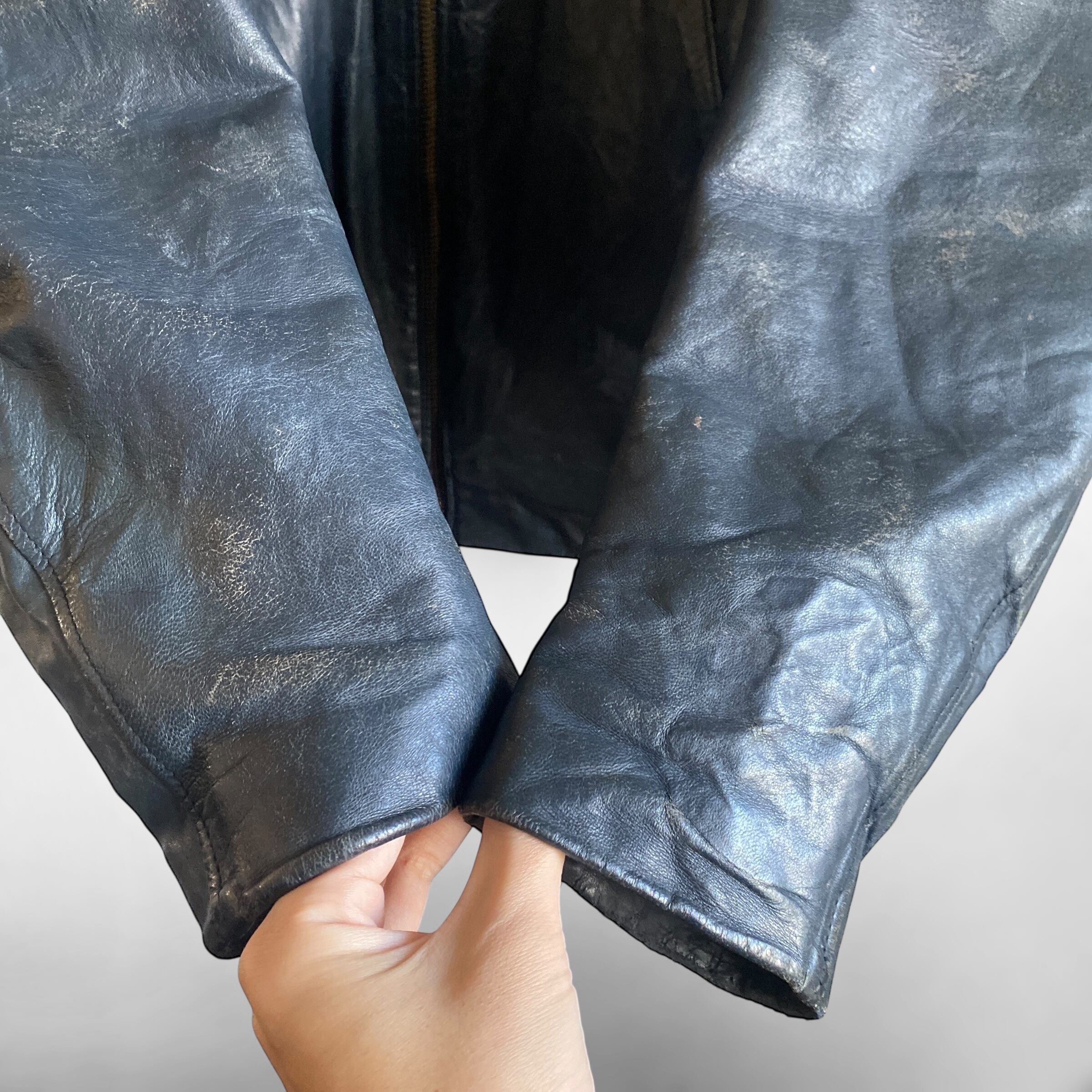 上品なネイビーブルーレザー(おそらく牛革)に、真鍮のダブルジッパー仕様(袖ポケットには珍しいベルギーのKROKO社の物がついております)、バランスがよくゆったりとした短丈ボックスシルエットが非常に格好良い一着。(内側のマジックテープを閉めると折り返して着ることもできます)