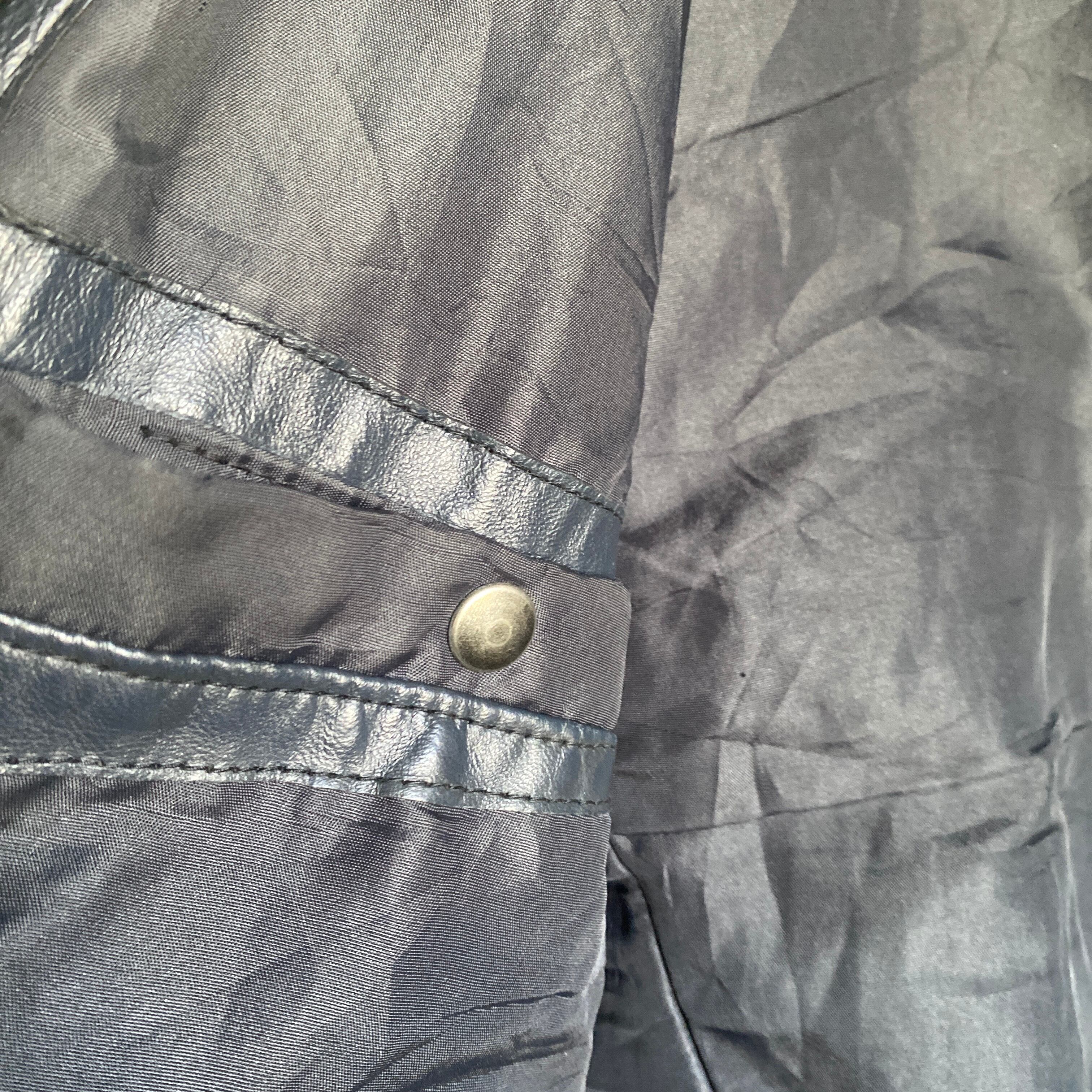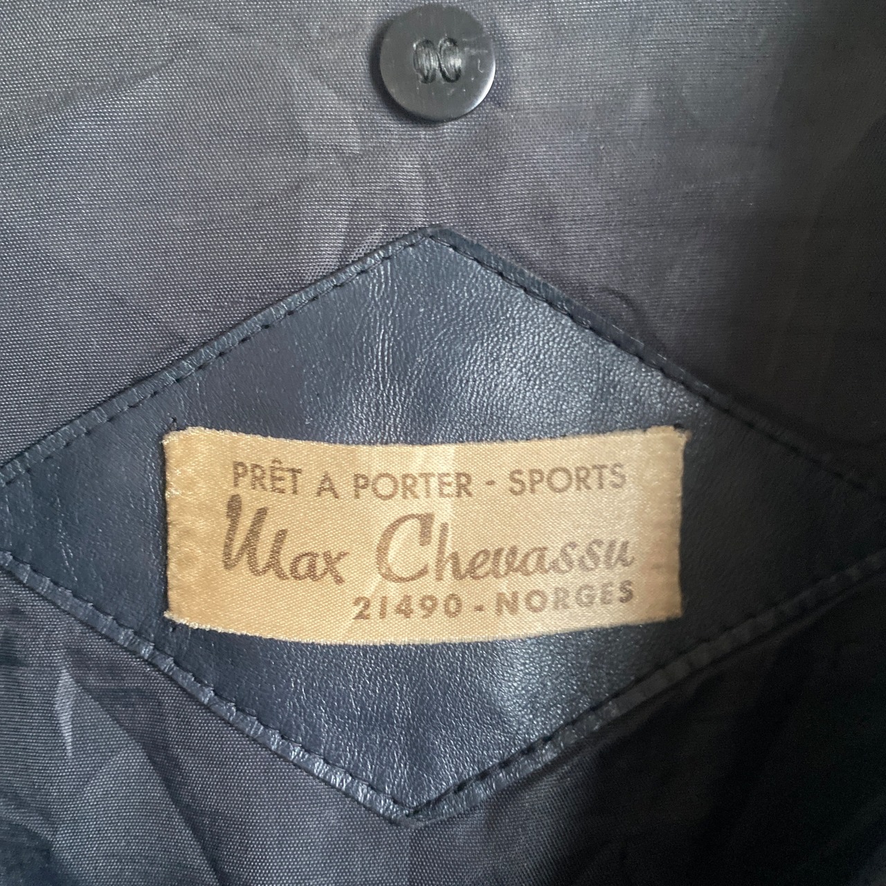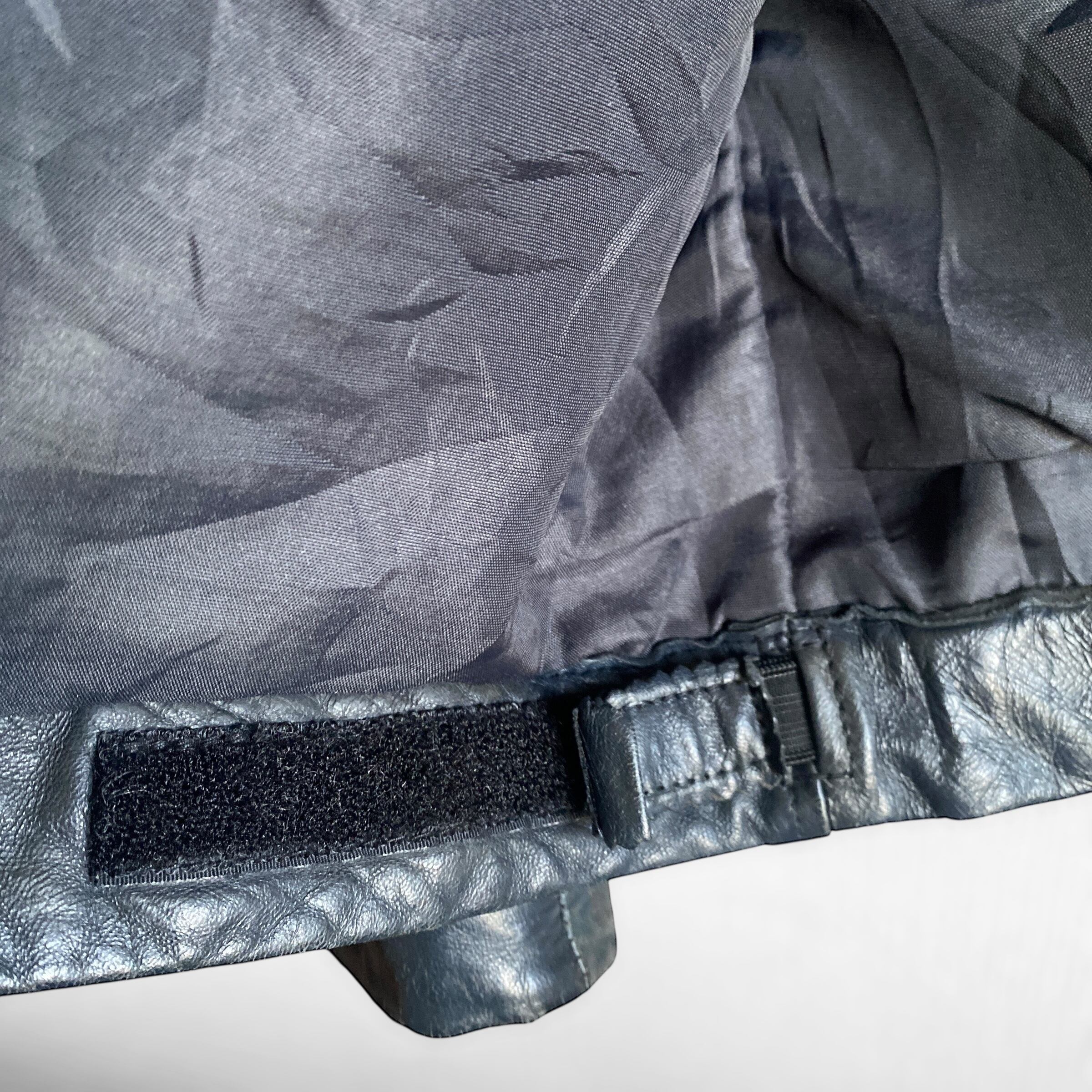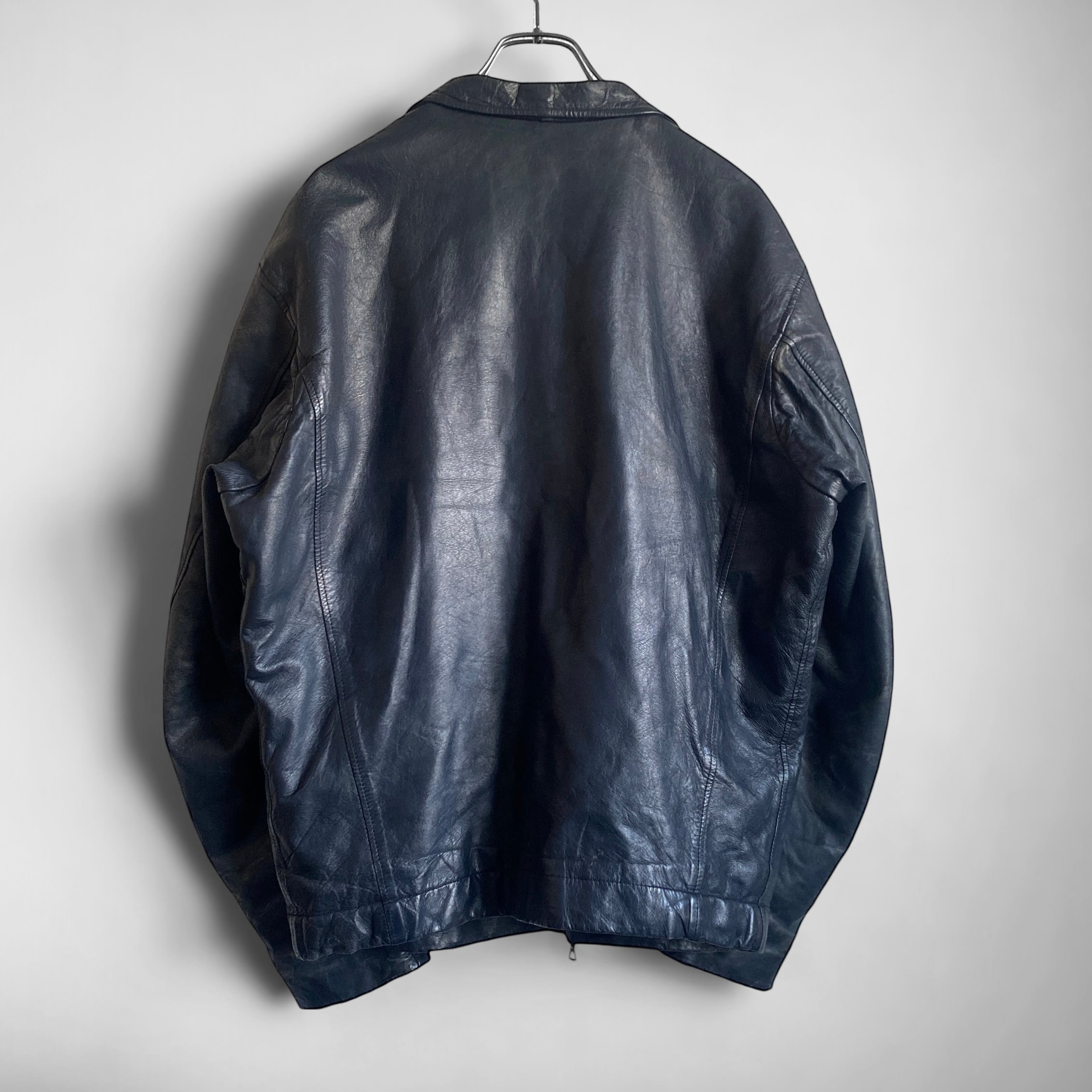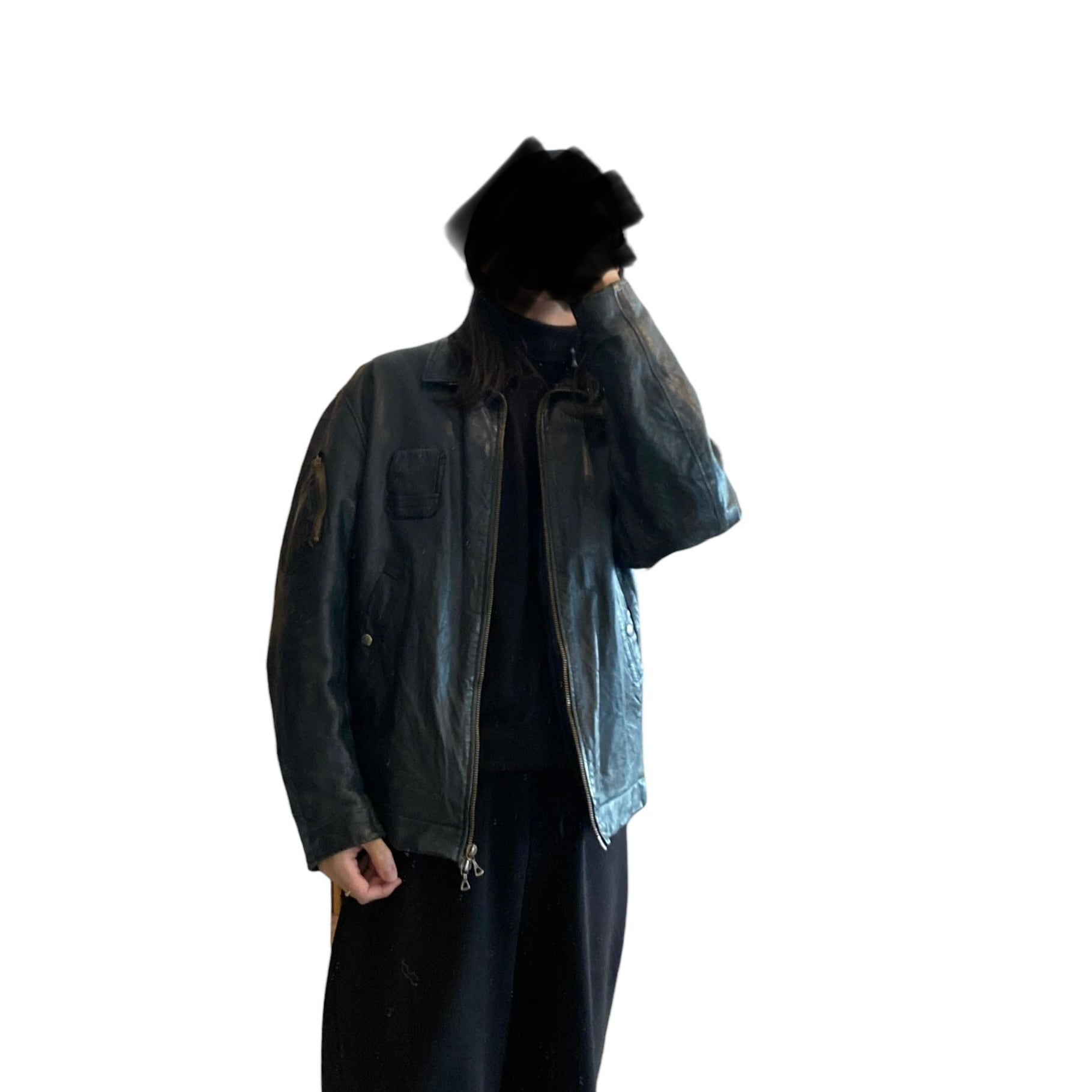 上品なネイビーブルーレザー(おそらく牛革)に、真鍮のダブルジッパー仕様(袖ポケットには珍しいベルギーのKROKO社の物がついております)、バランスがよくゆったりとした短丈ボックスシルエットが非常に格好良い一着。(内側のマジックテープを閉めると折り返して着ることもできます)