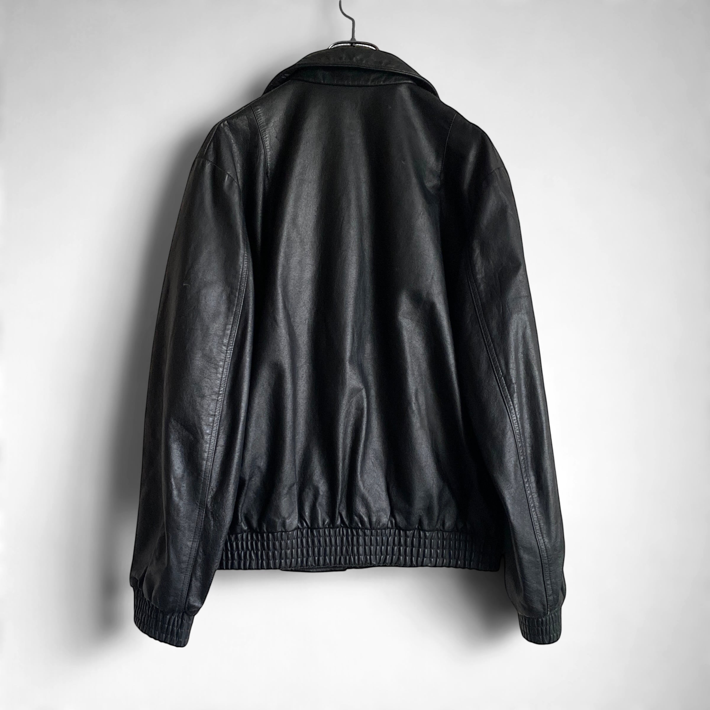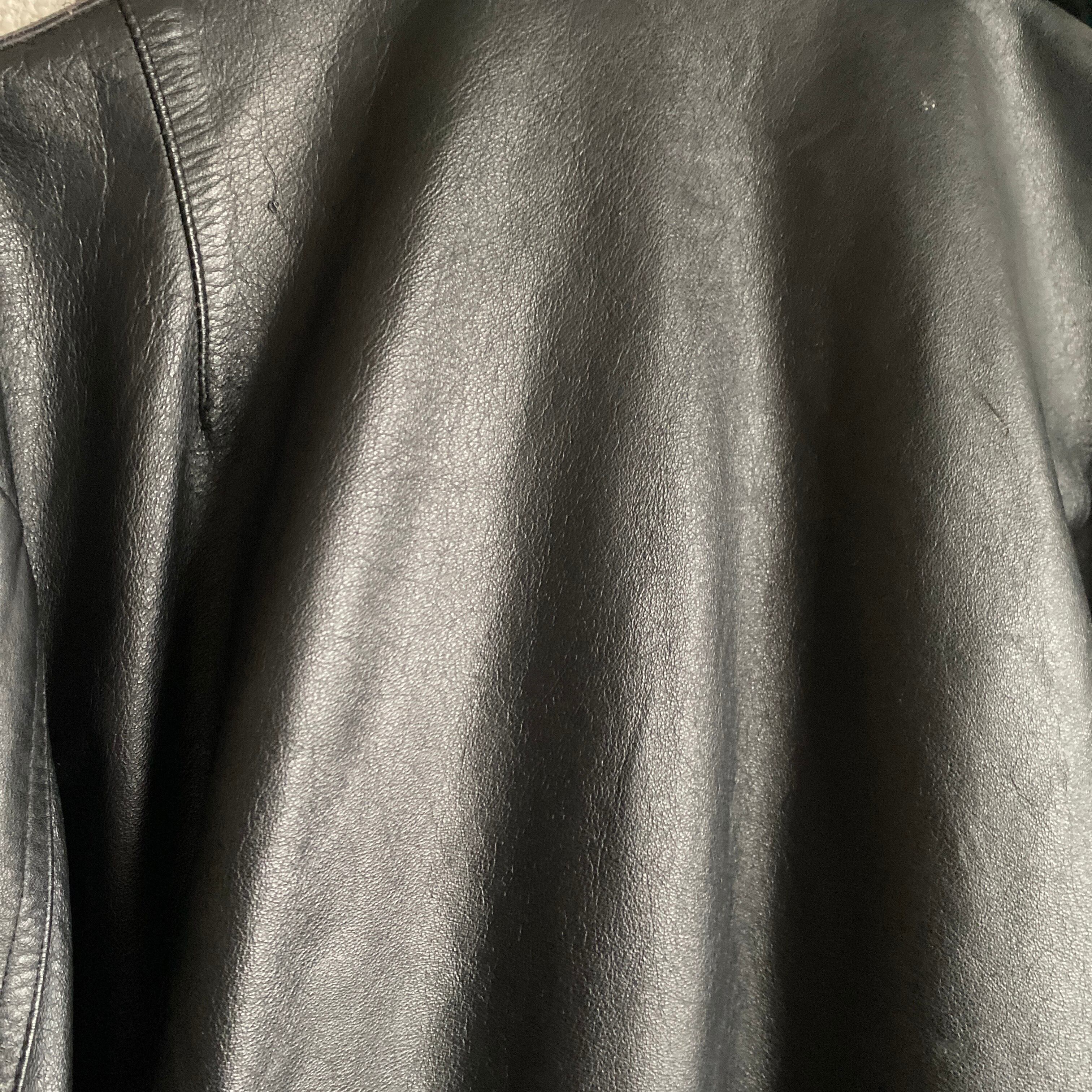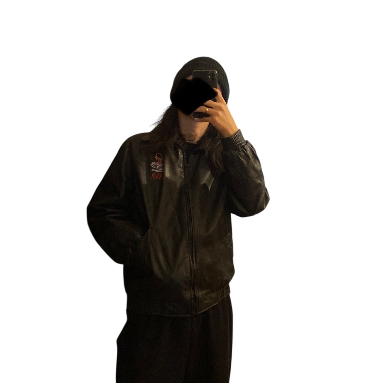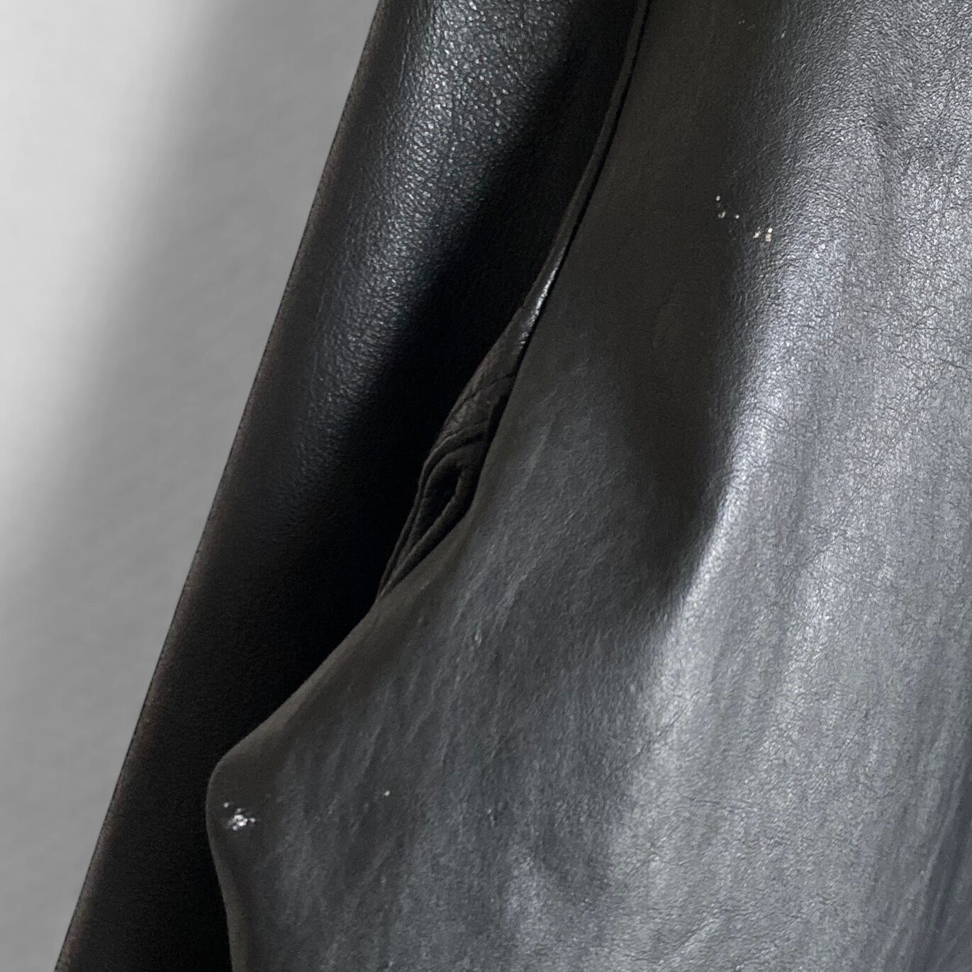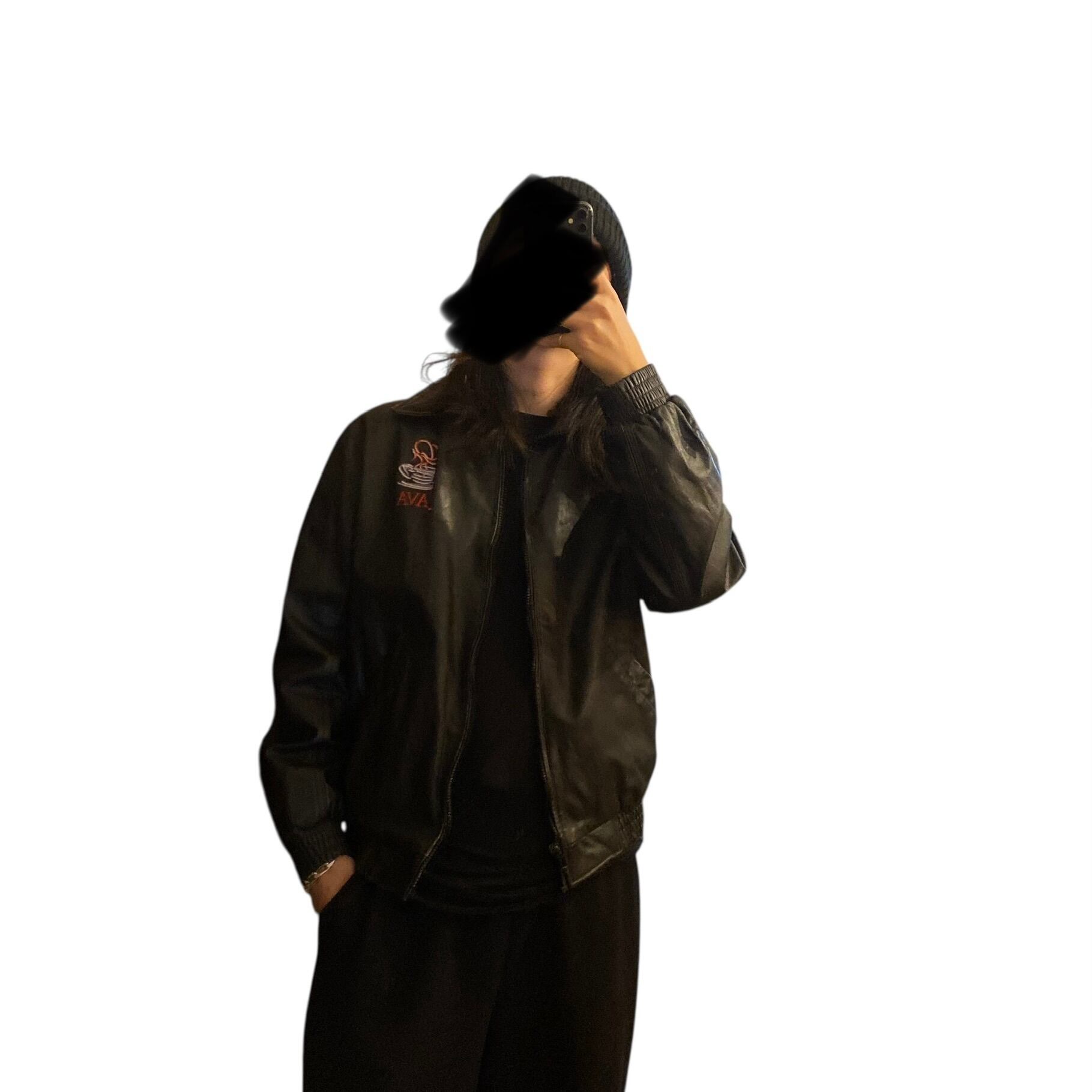 ブラックのレザーボディに企業ロゴデザイン、ドリズラースタイルの短丈ボックスシルエットが非常に格好良い一着。