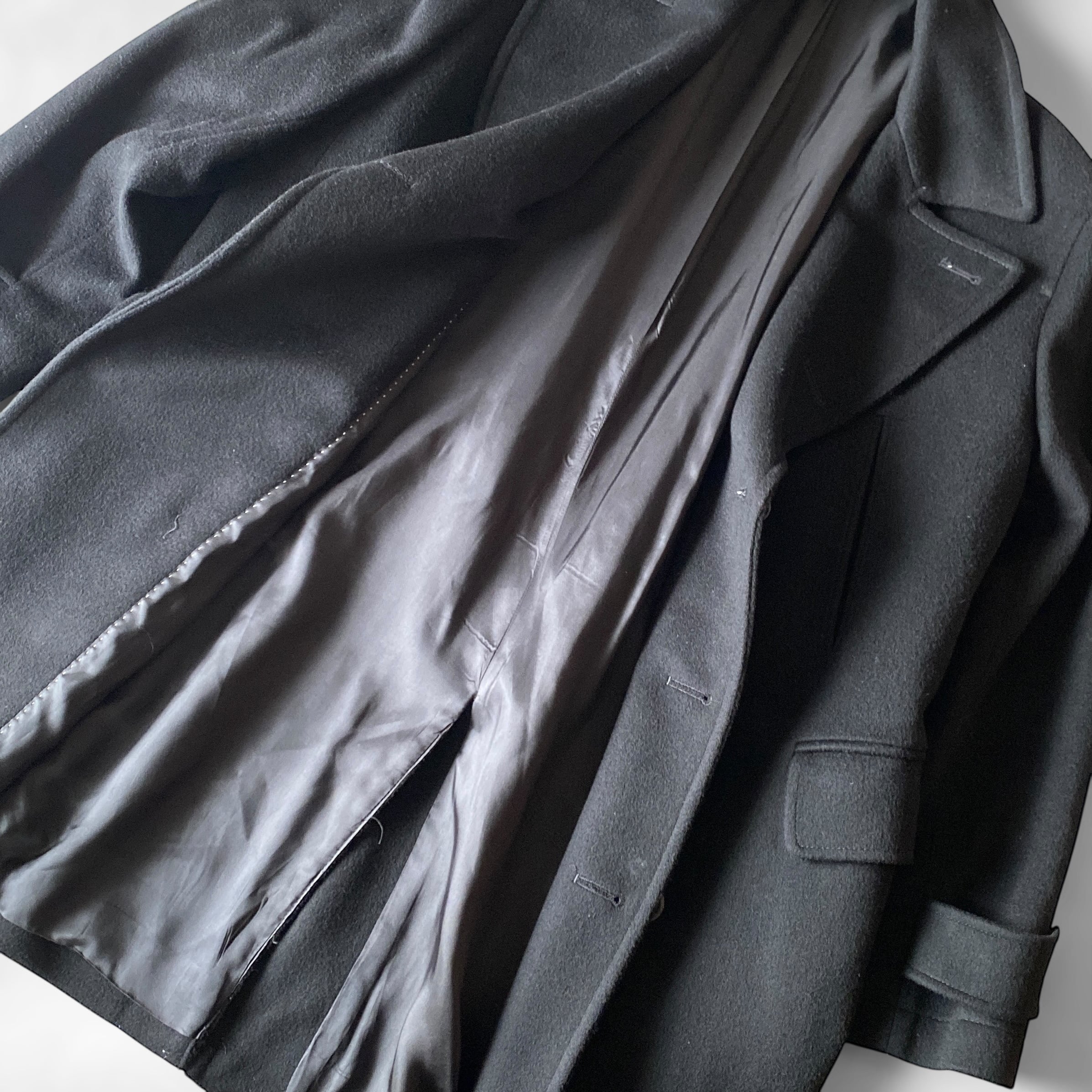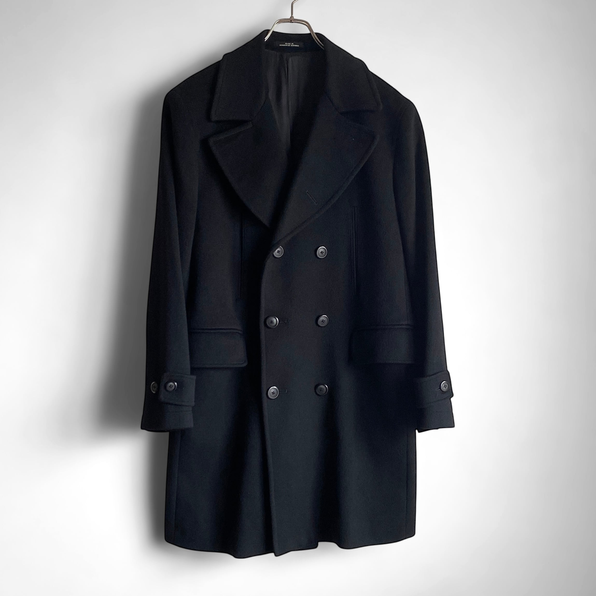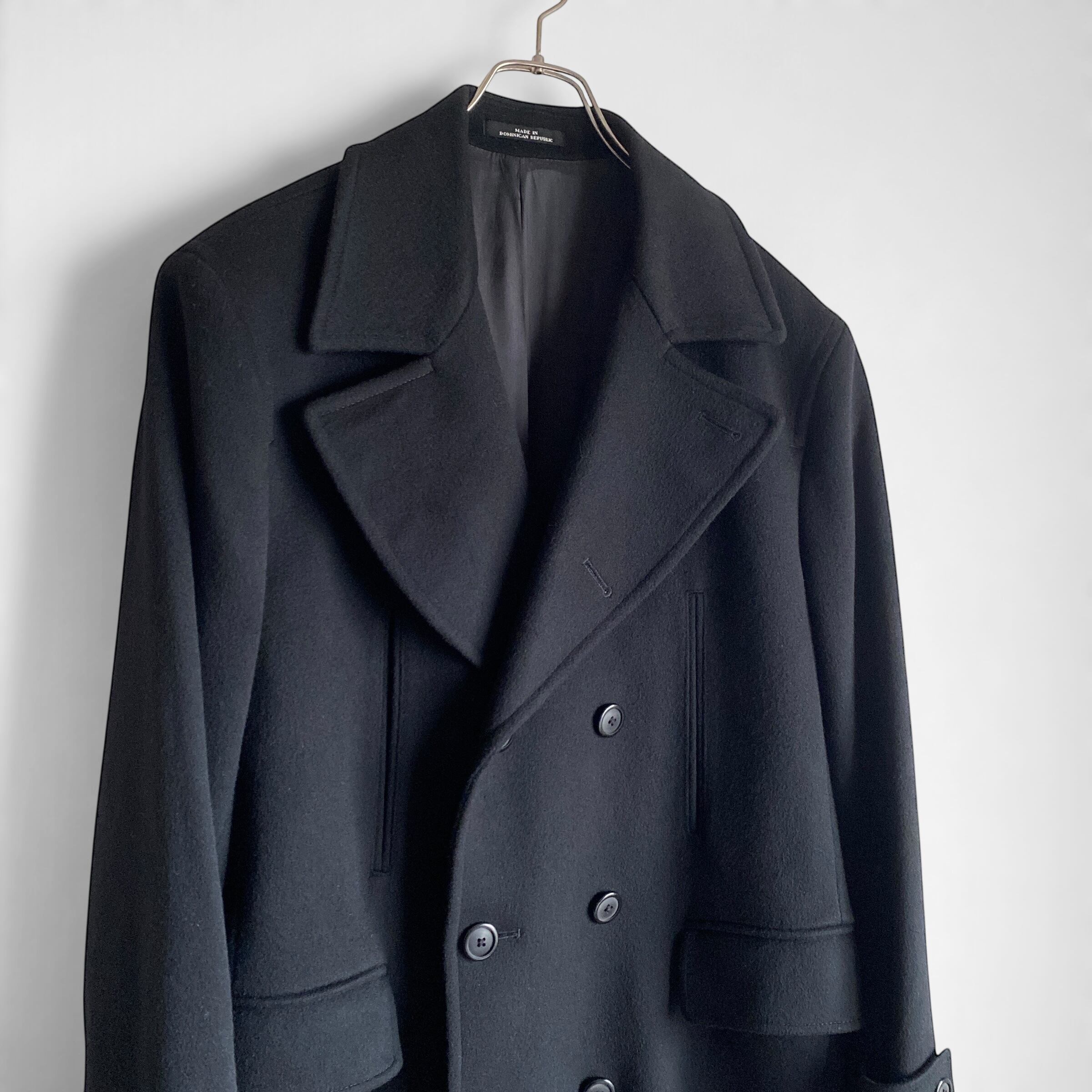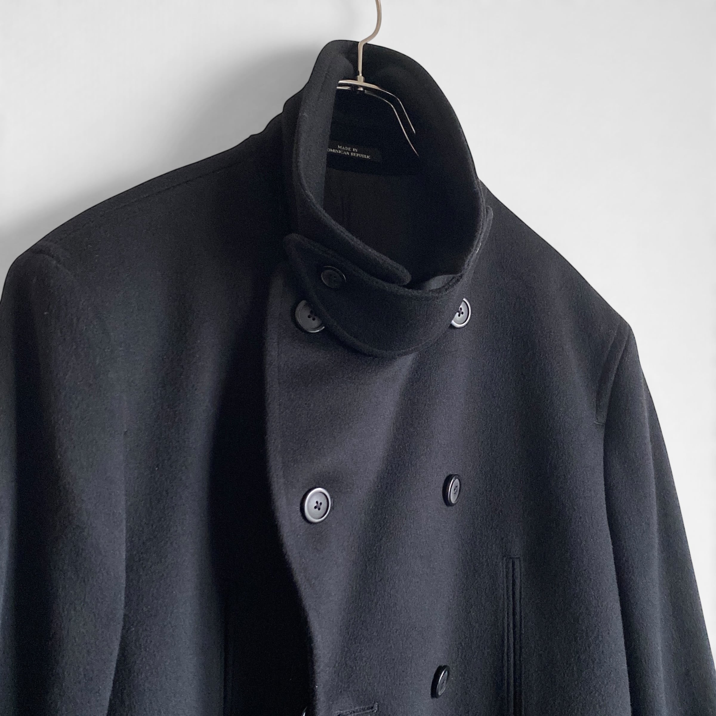 初見でカシミヤ混だと思ったぐらい、滑らかで手触りの良い上質なウールメルトン生地(表記はないですが、最低でもSuper 120'sぐらいはありそうです)に、ブラックカラー、ややラペルが大きめのクラシカルなロングPea Coatスタイルが非常に格好良い一着。