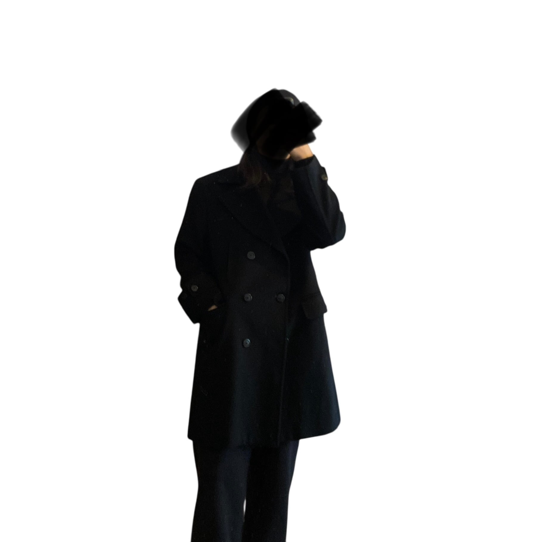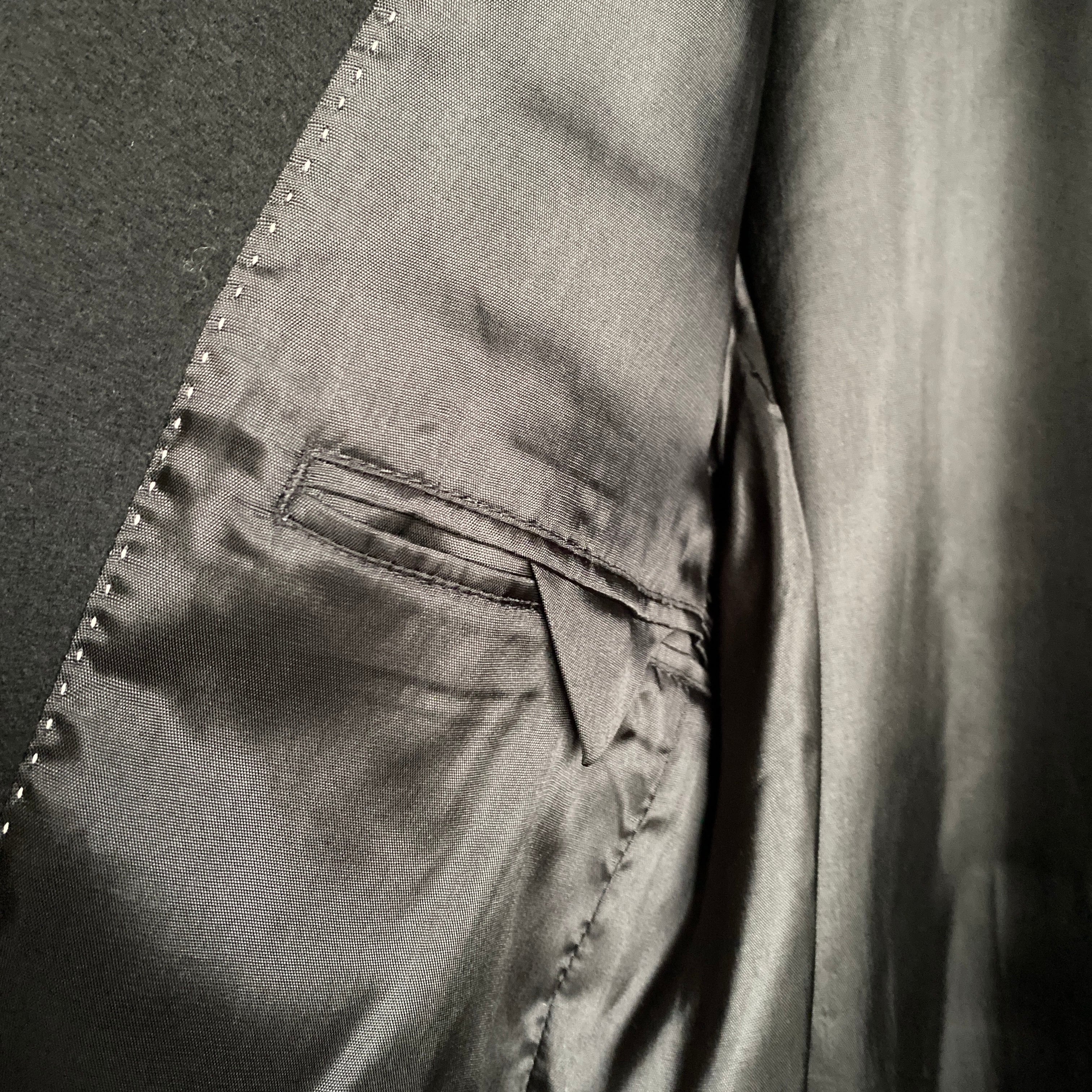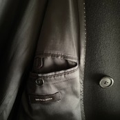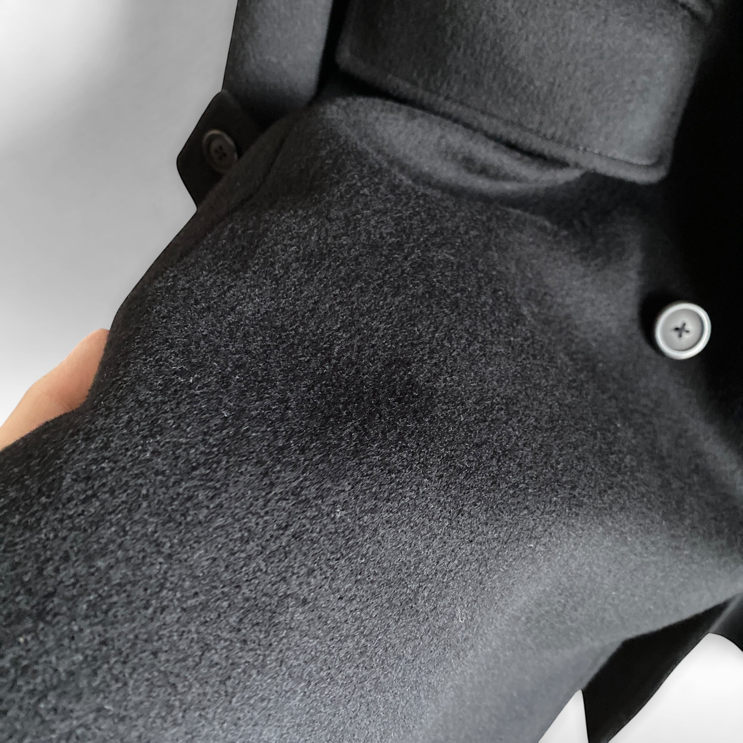 初見でカシミヤ混だと思ったぐらい、滑らかで手触りの良い上質なウールメルトン生地(表記はないですが、最低でもSuper 120'sぐらいはありそうです)に、ブラックカラー、ややラペルが大きめのクラシカルなロングPea Coatスタイルが非常に格好良い一着。