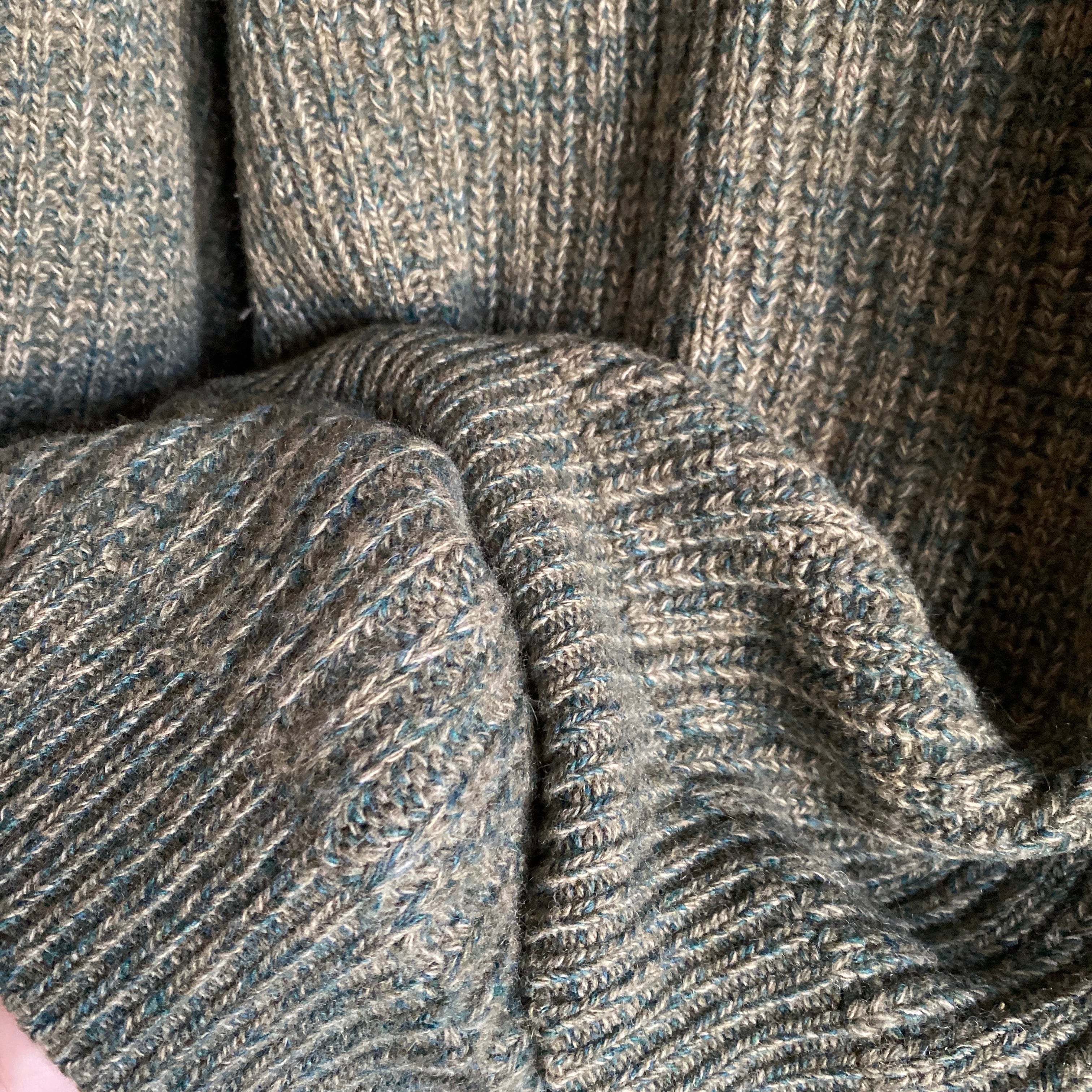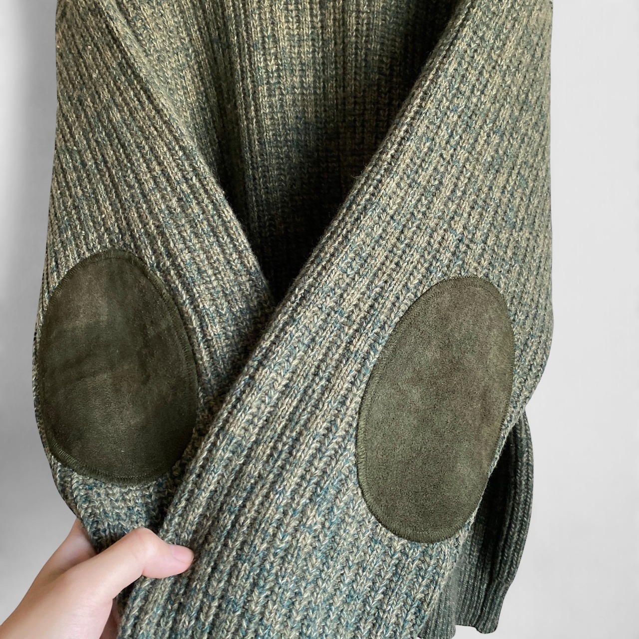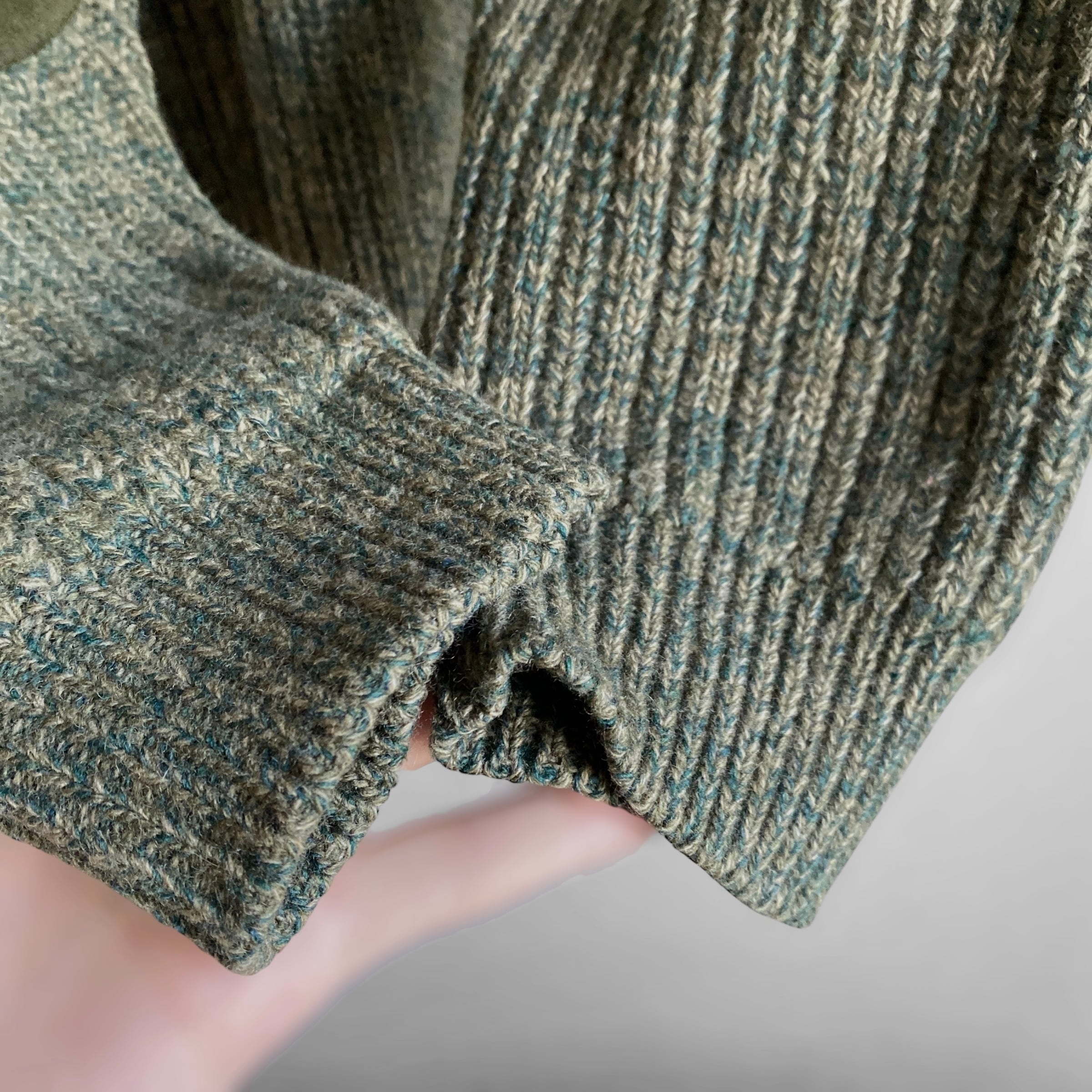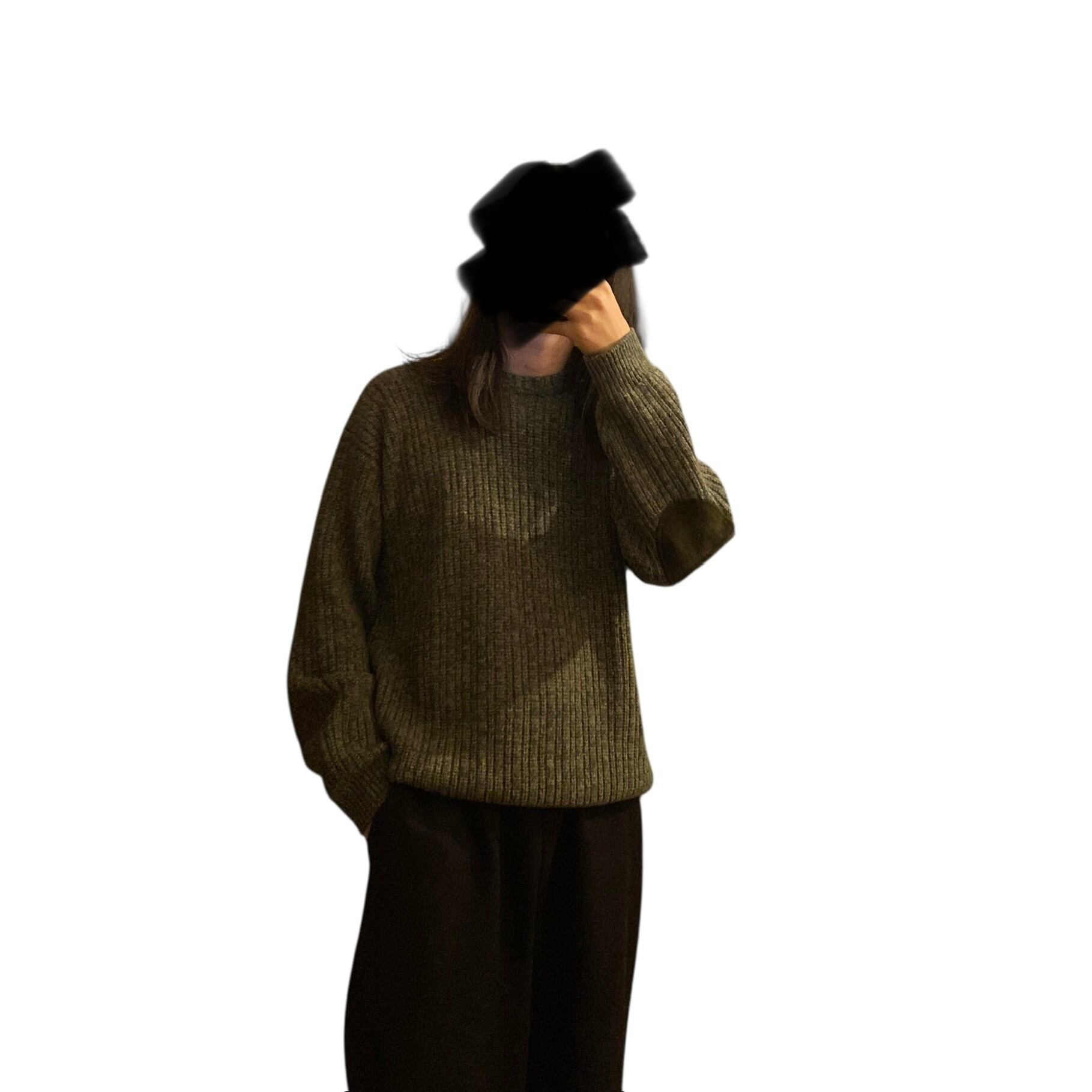 肉厚で柔らかくぎゅっと目の詰まった上質なニットに、上品なグリーン〜オリーブのメランジカラー(画像6が近いです)、丸みのあるボックス目なシルエットが素晴らしい一着。