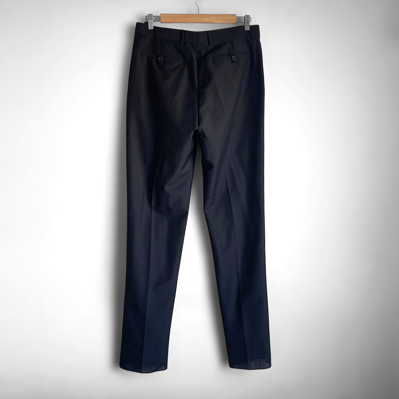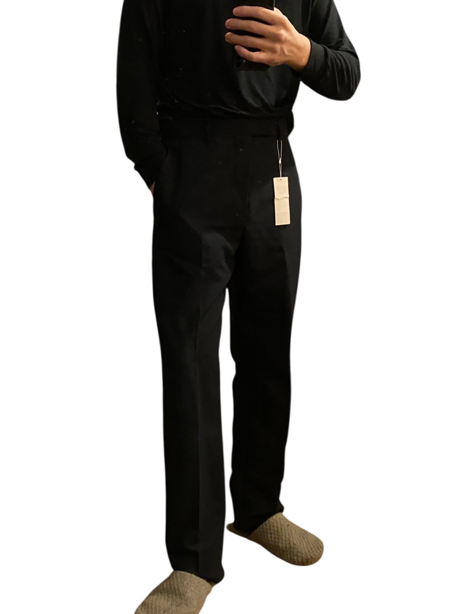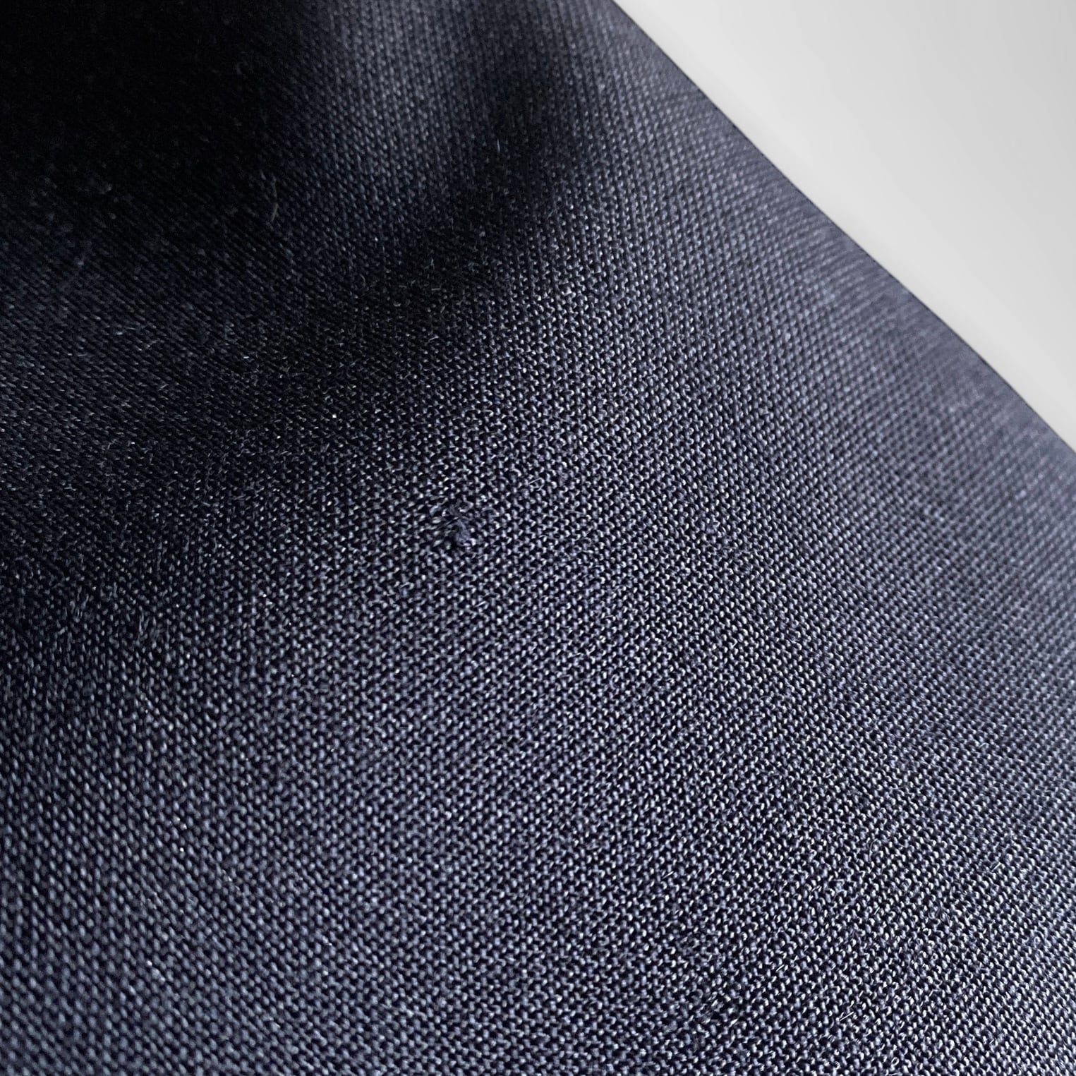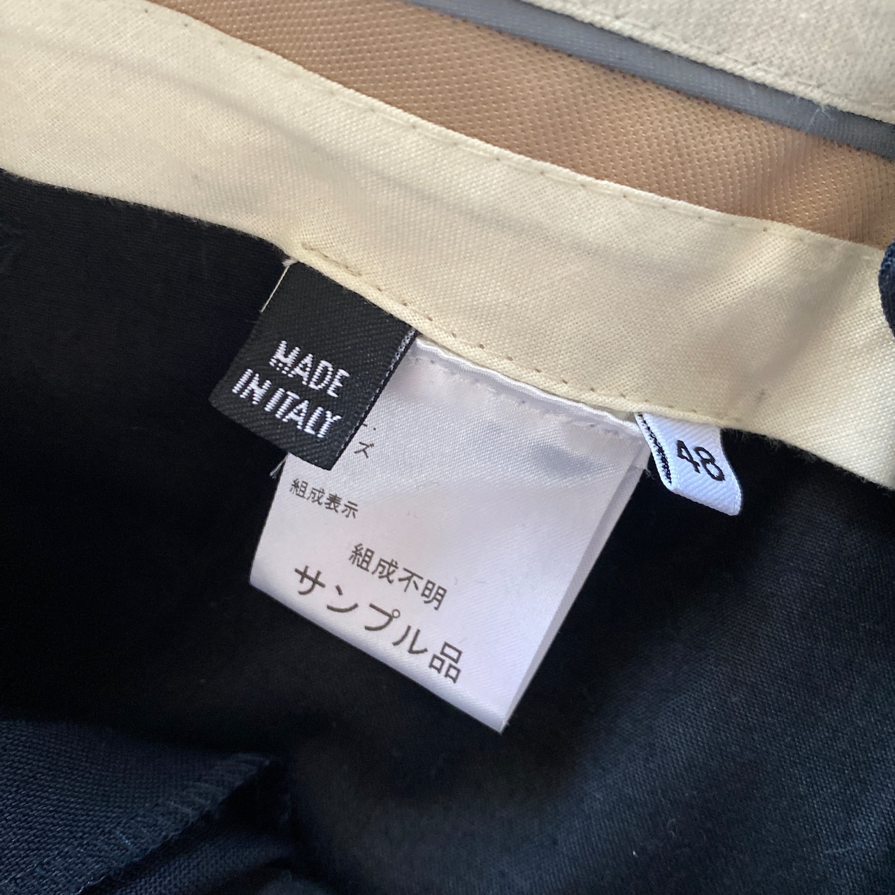 ハリコシのある上質なウール生地に(わずかにモヘアが入っているかもしれません)、ブラックに近い深みのあるダークネイビーカラー、細めではありますが、細すぎない絶妙なシルエットが非常に格好良い一着。