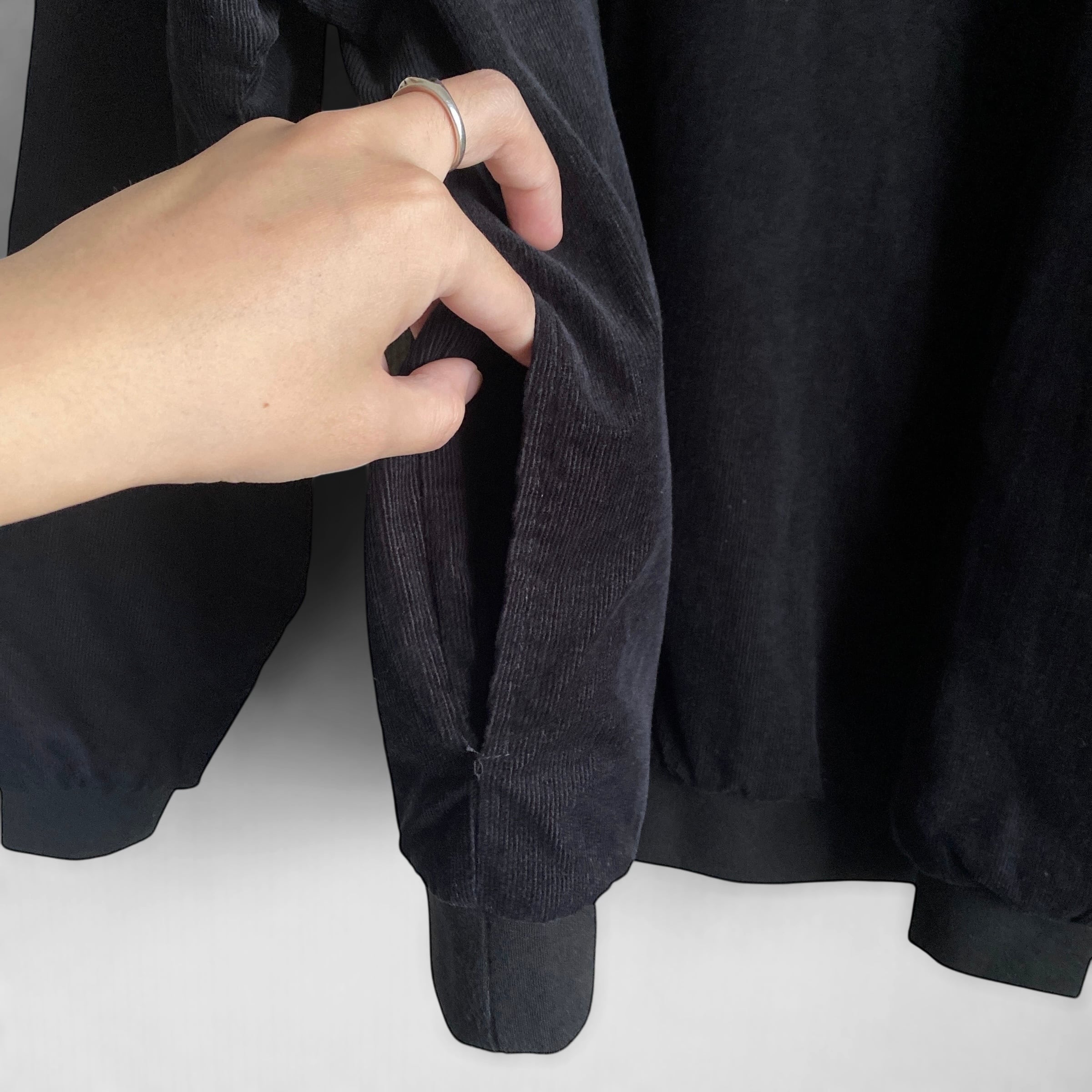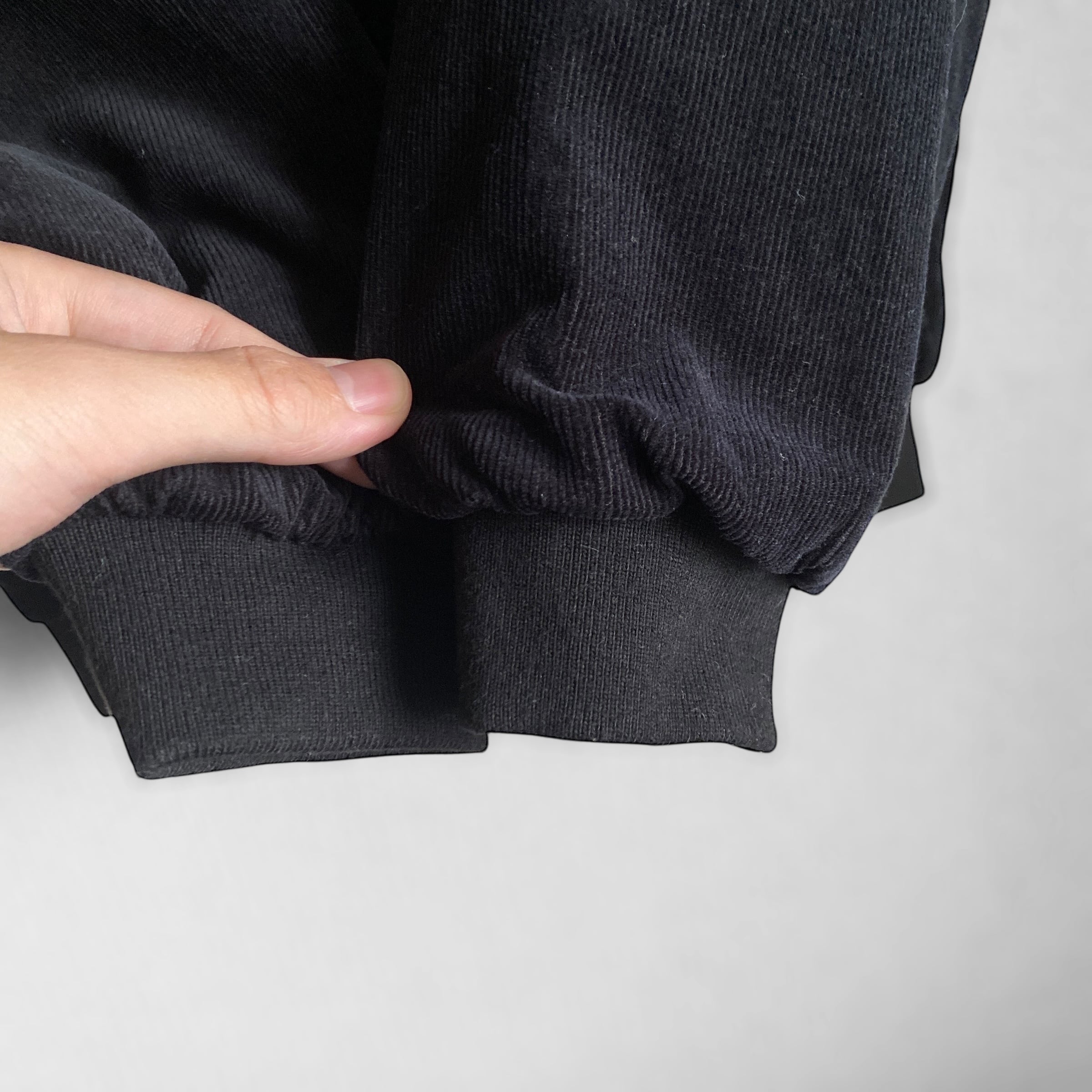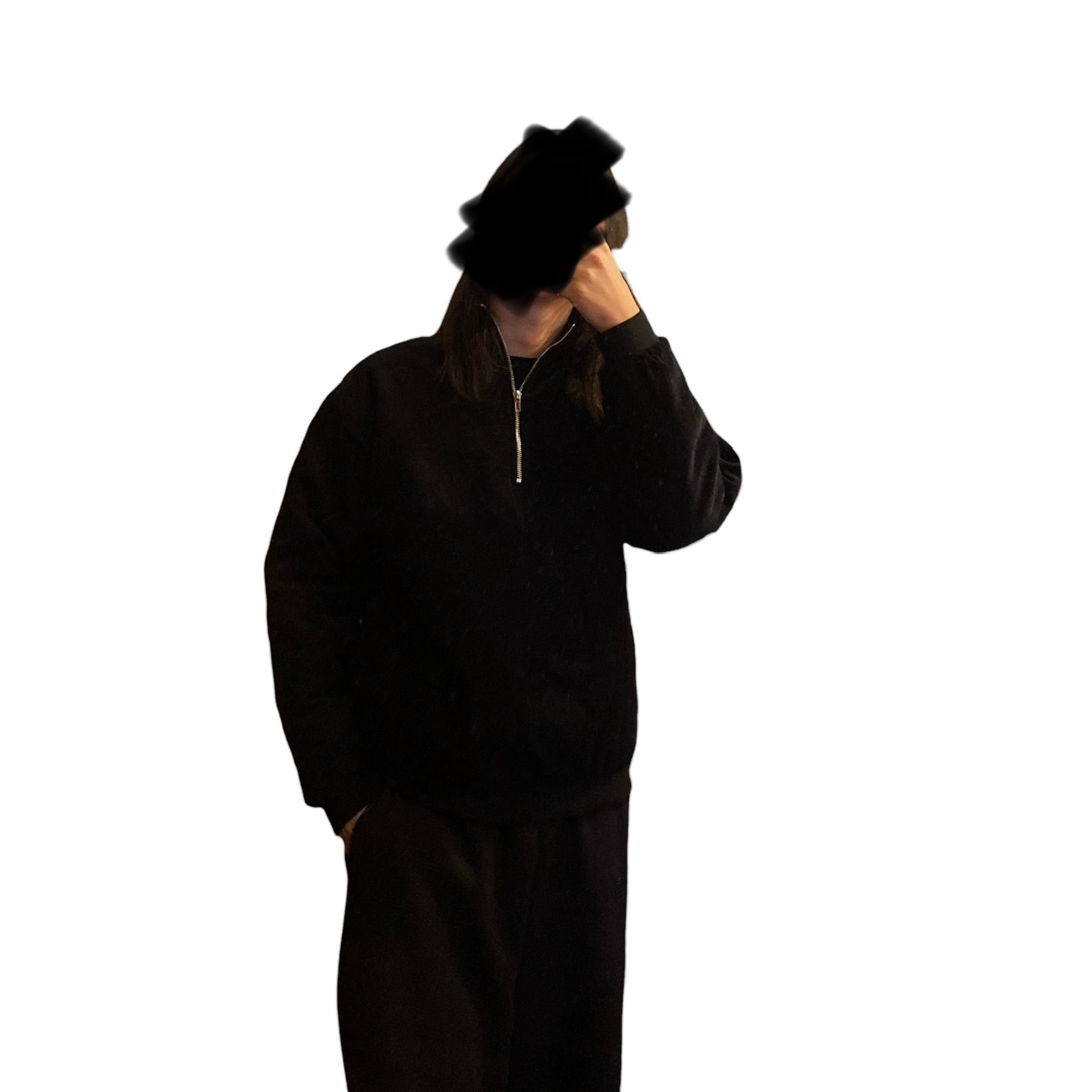 ブラックの細畝コーデュロイボディに、中綿のキルティングライニング、ややワークやミリタリーみを感じるハーフジップのミニマルなデザインが非常に格好良い一着。
