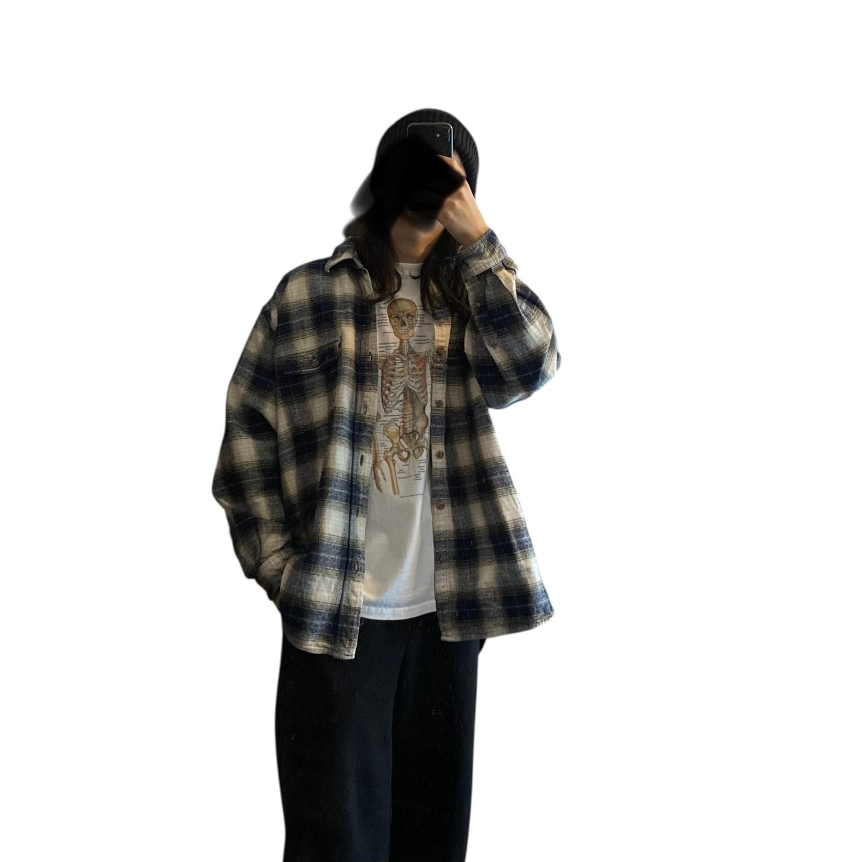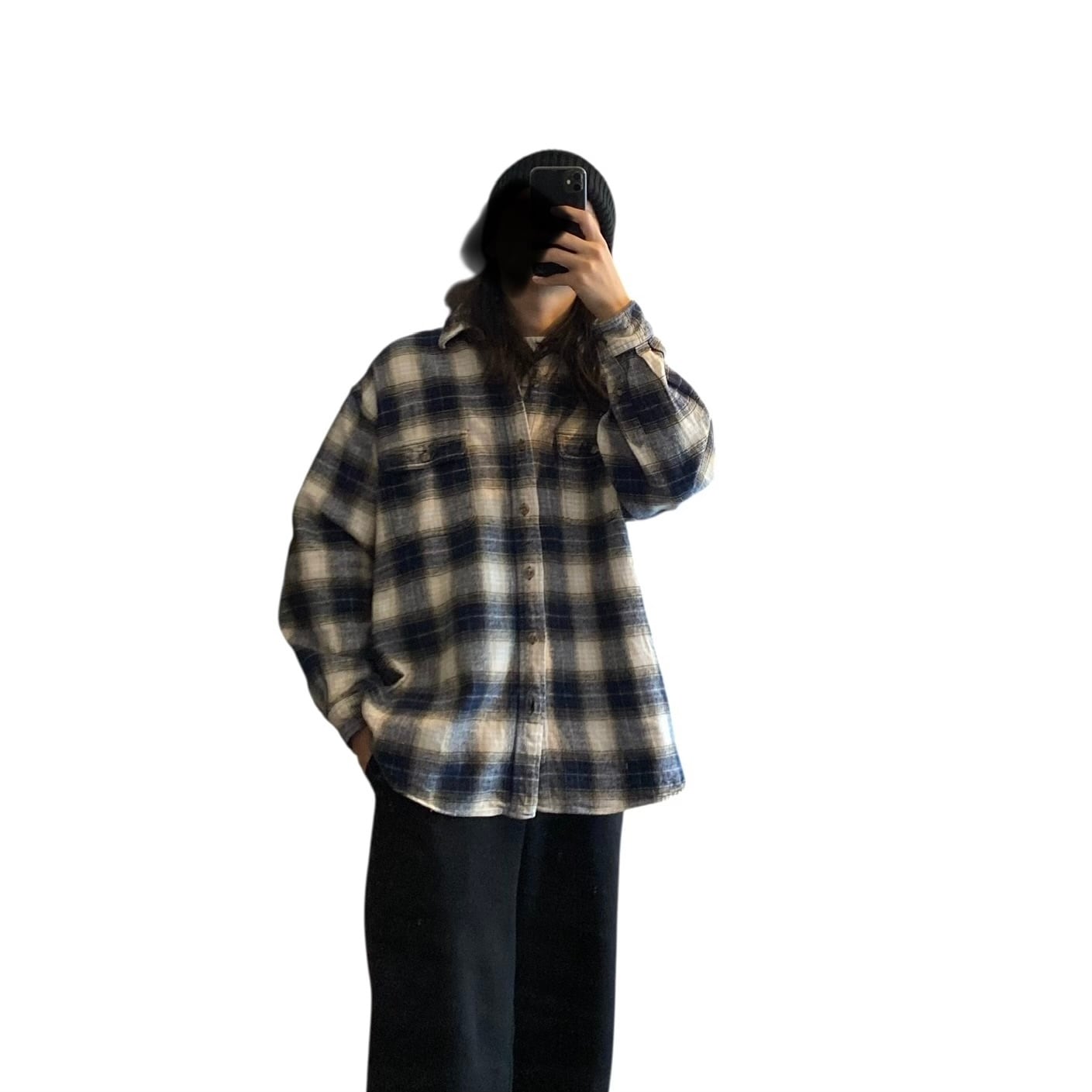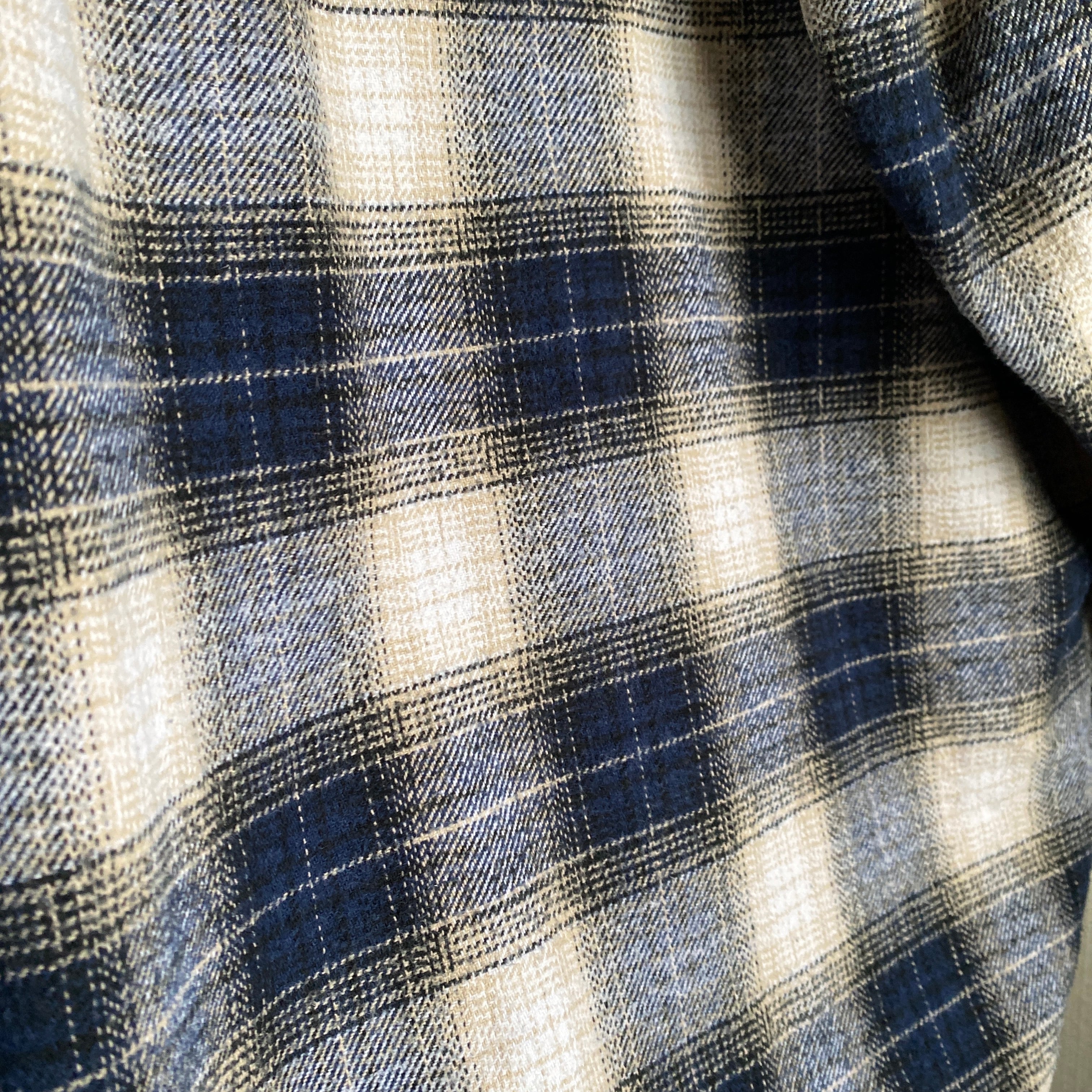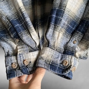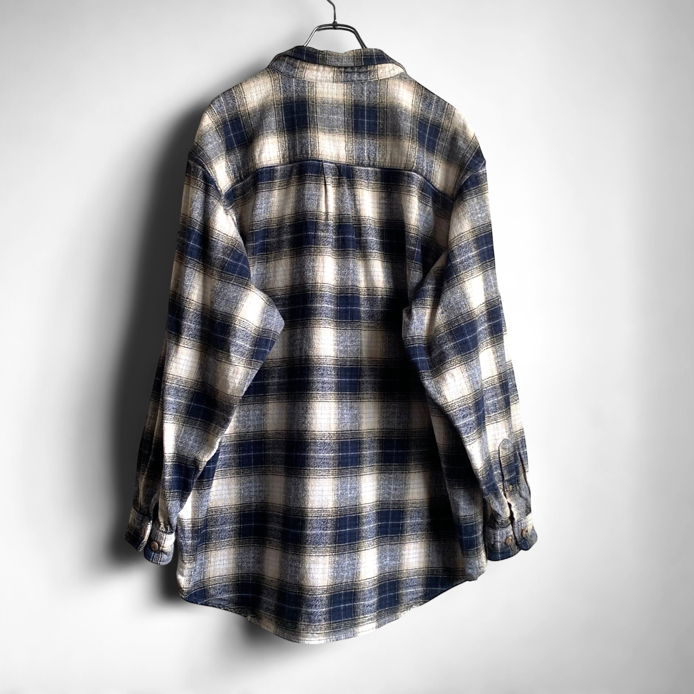 肉厚でガシッとしたコットンフランネル素材に、ダークネイビー×ベージュ×ホワイトの好配色なオンブレチェック柄、ゆったりとした丸みのあるシルエットが抜群に格好良い一着。