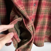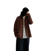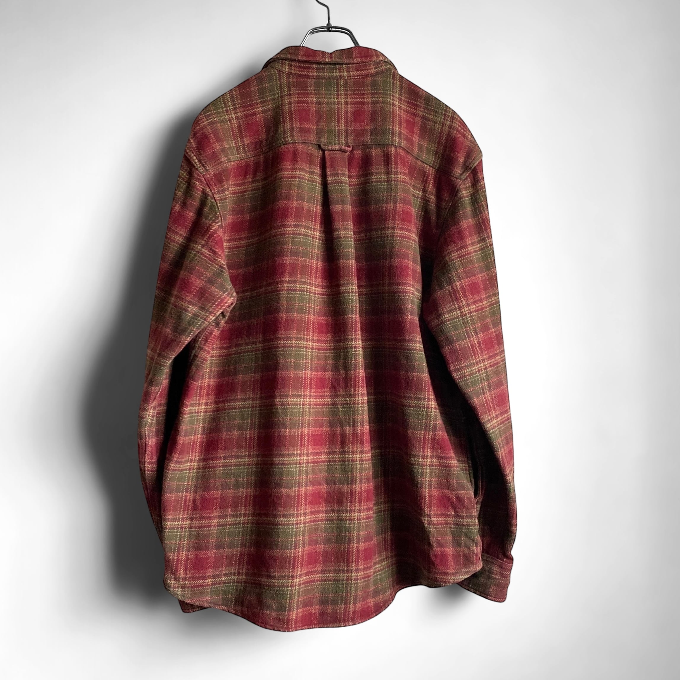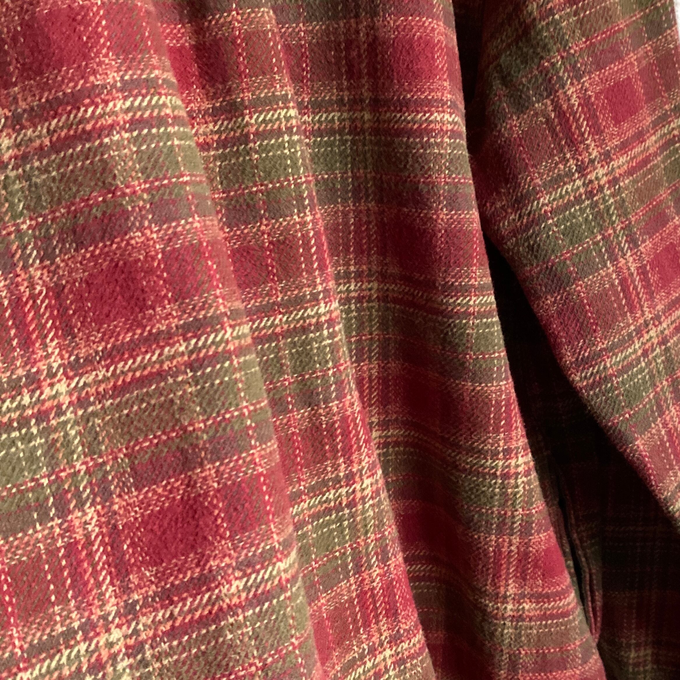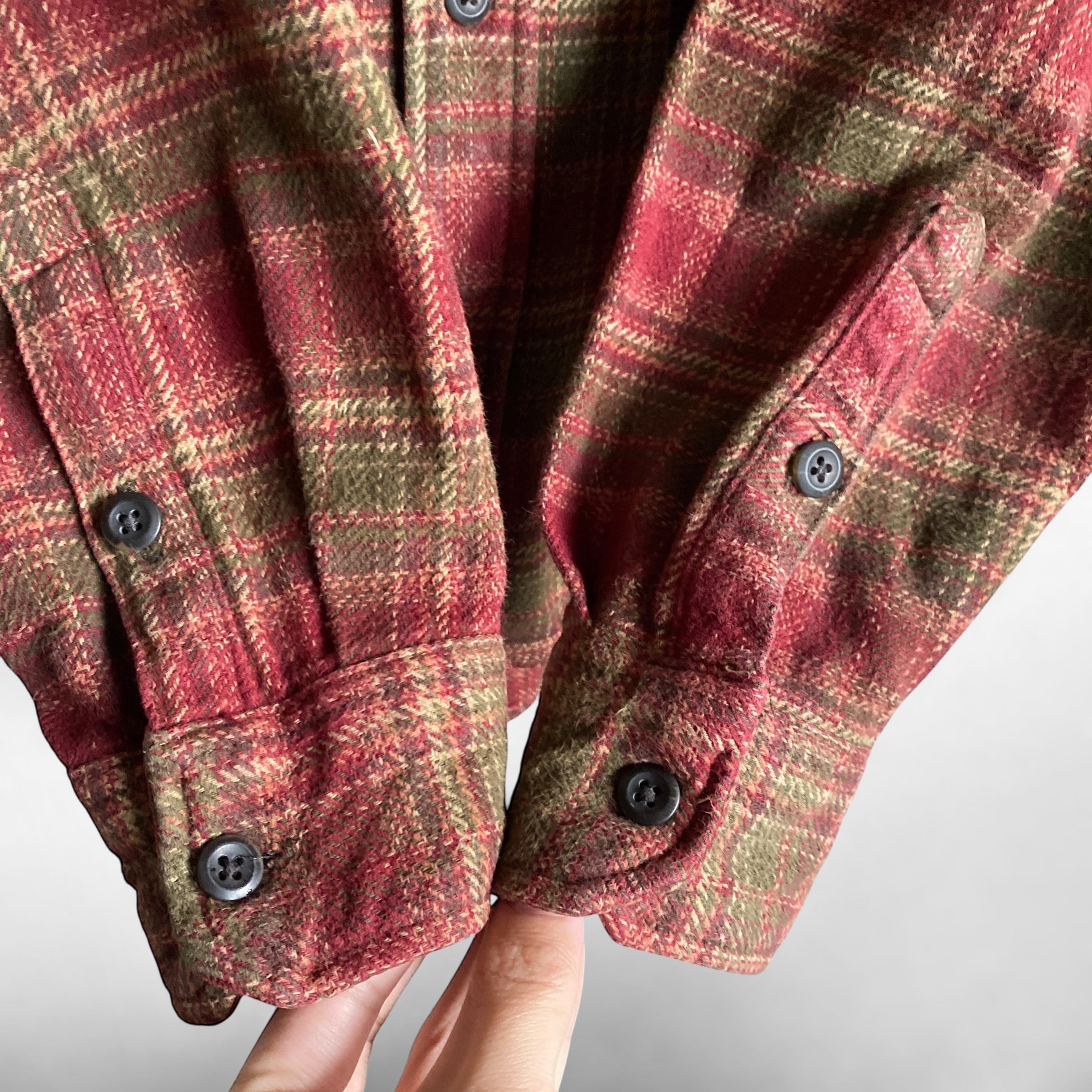 肉厚でモチっとしたフランネル素材に、枯れたオリーブ×ダークレッドの好配色オンブレチェック柄、程よくゆったりとしたベーシックなサイズ感が格好良い一着。