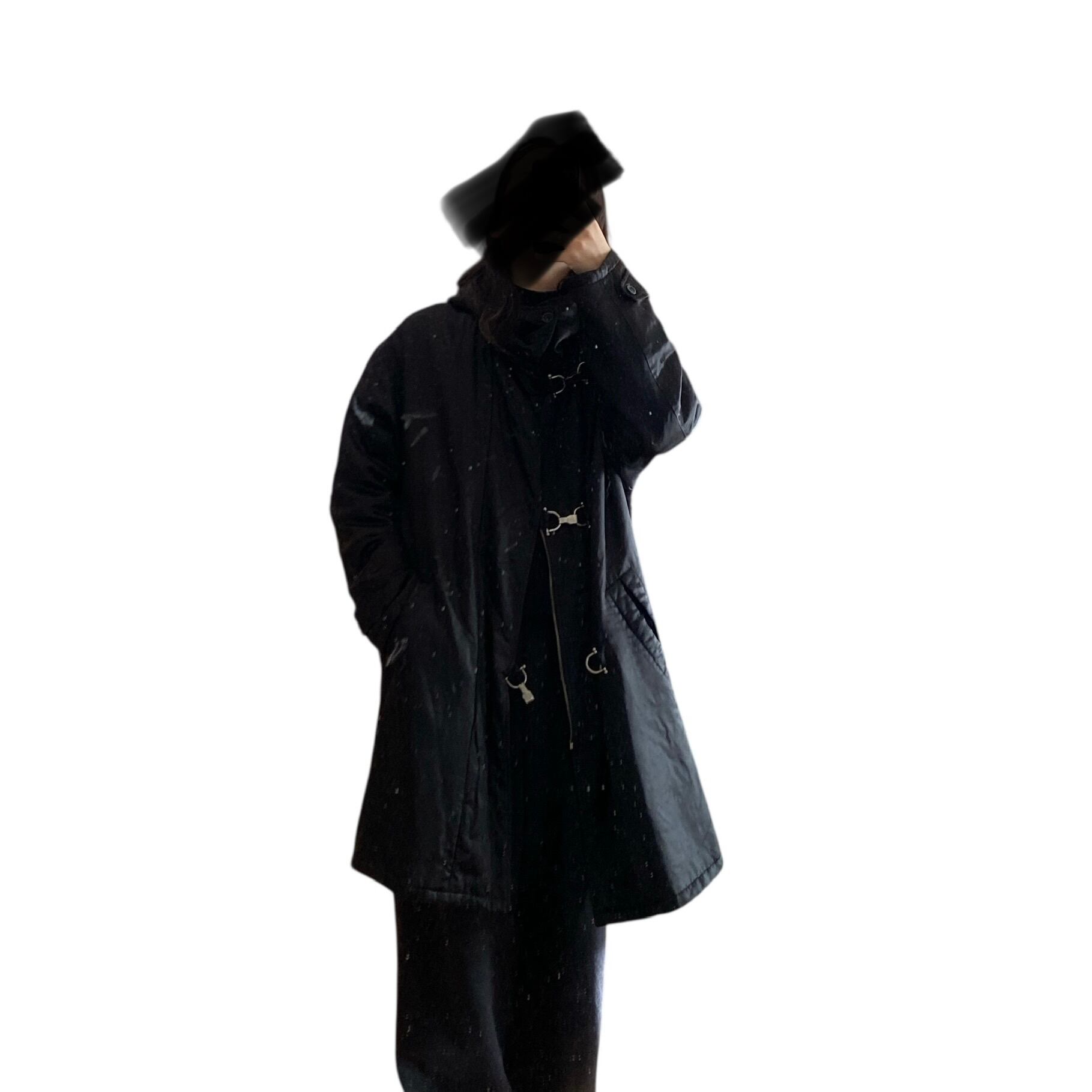 裏地に使うような物よりやや硬めで肉感のある、鈍い光沢が美しいヴィスコースアセテート生地に、ファイヤーマンジャケットとモッズコートを合わせたようなハイブリッドなデザイン、身幅、アーム共にゆったりとしたオーバーサイズなシルエットが素晴らしい一着。