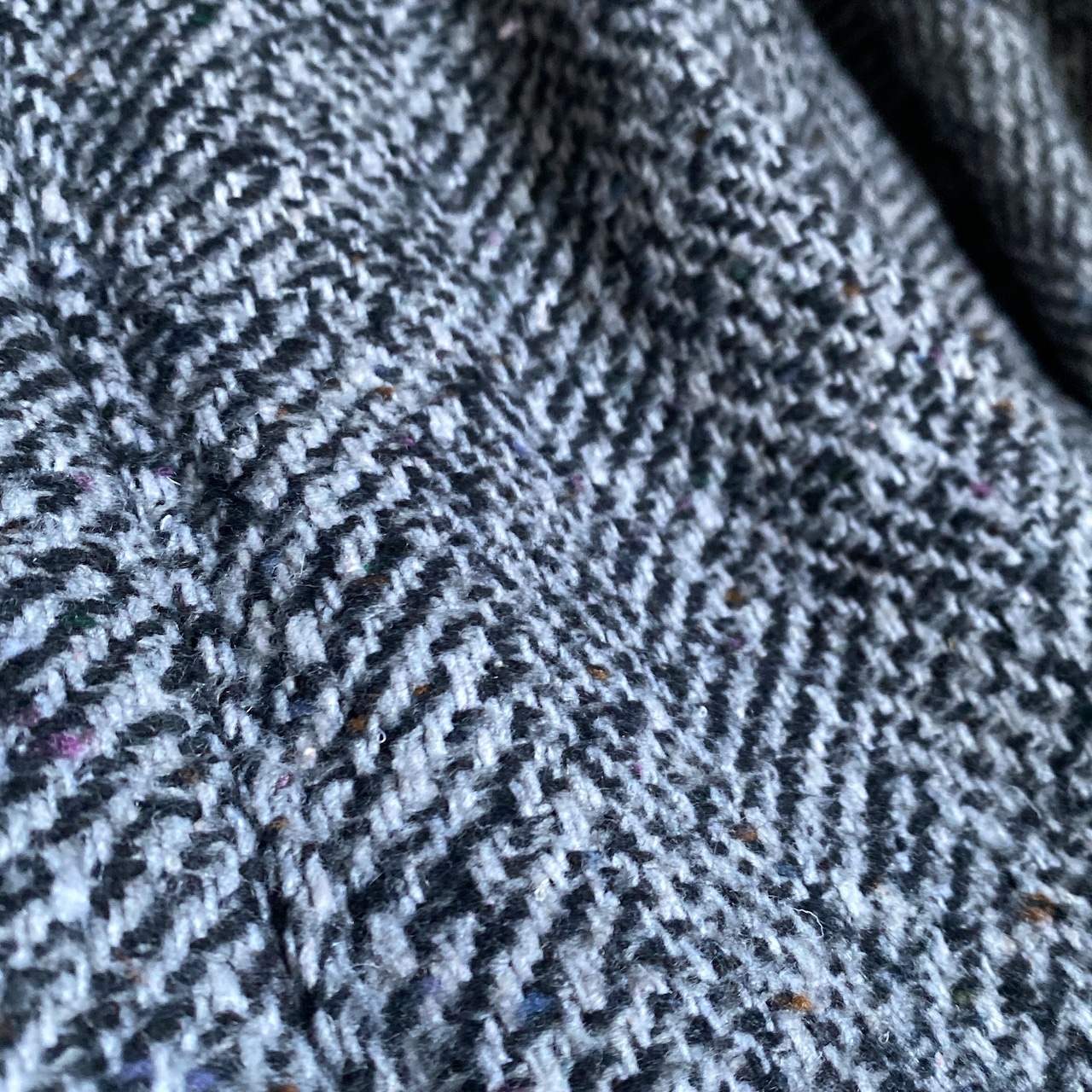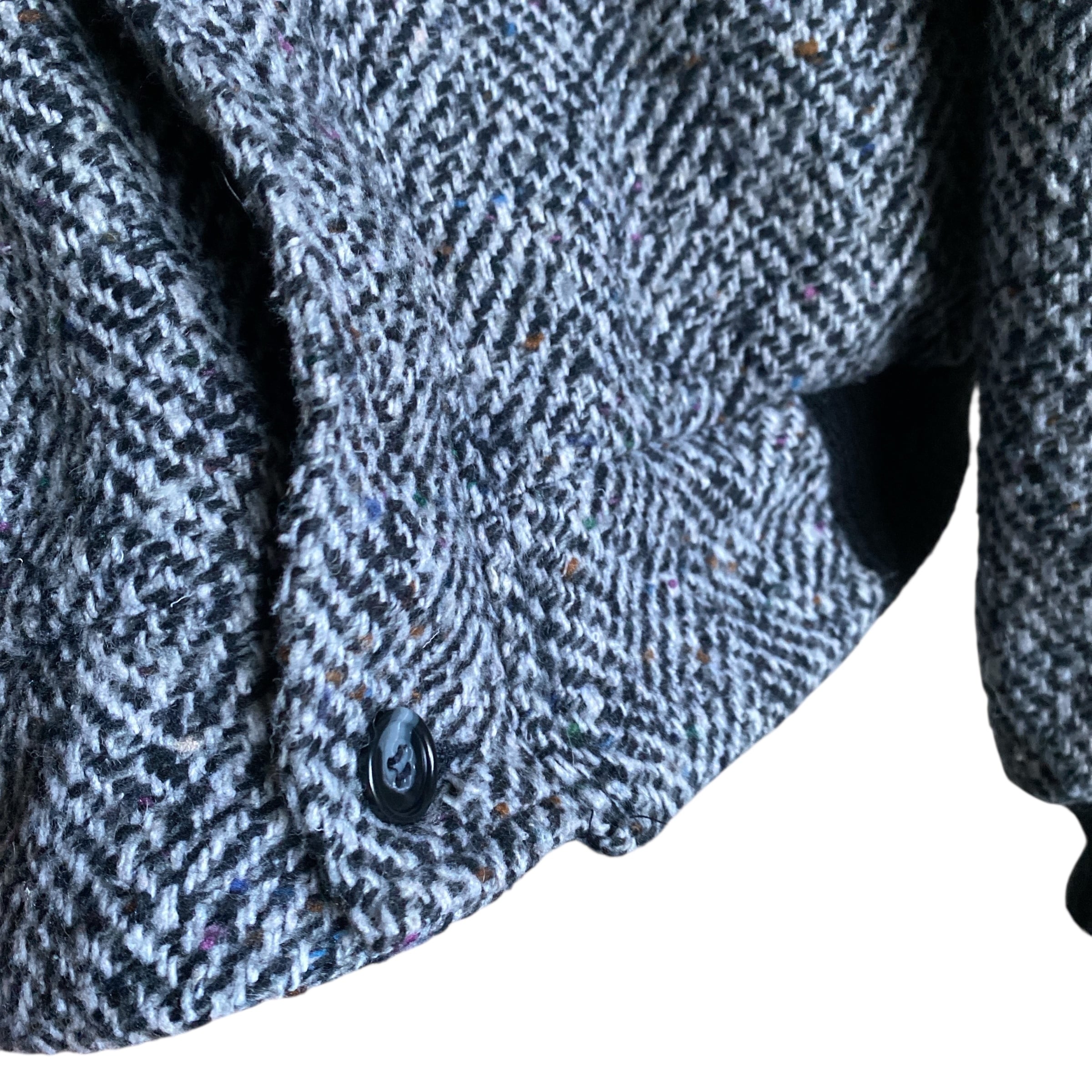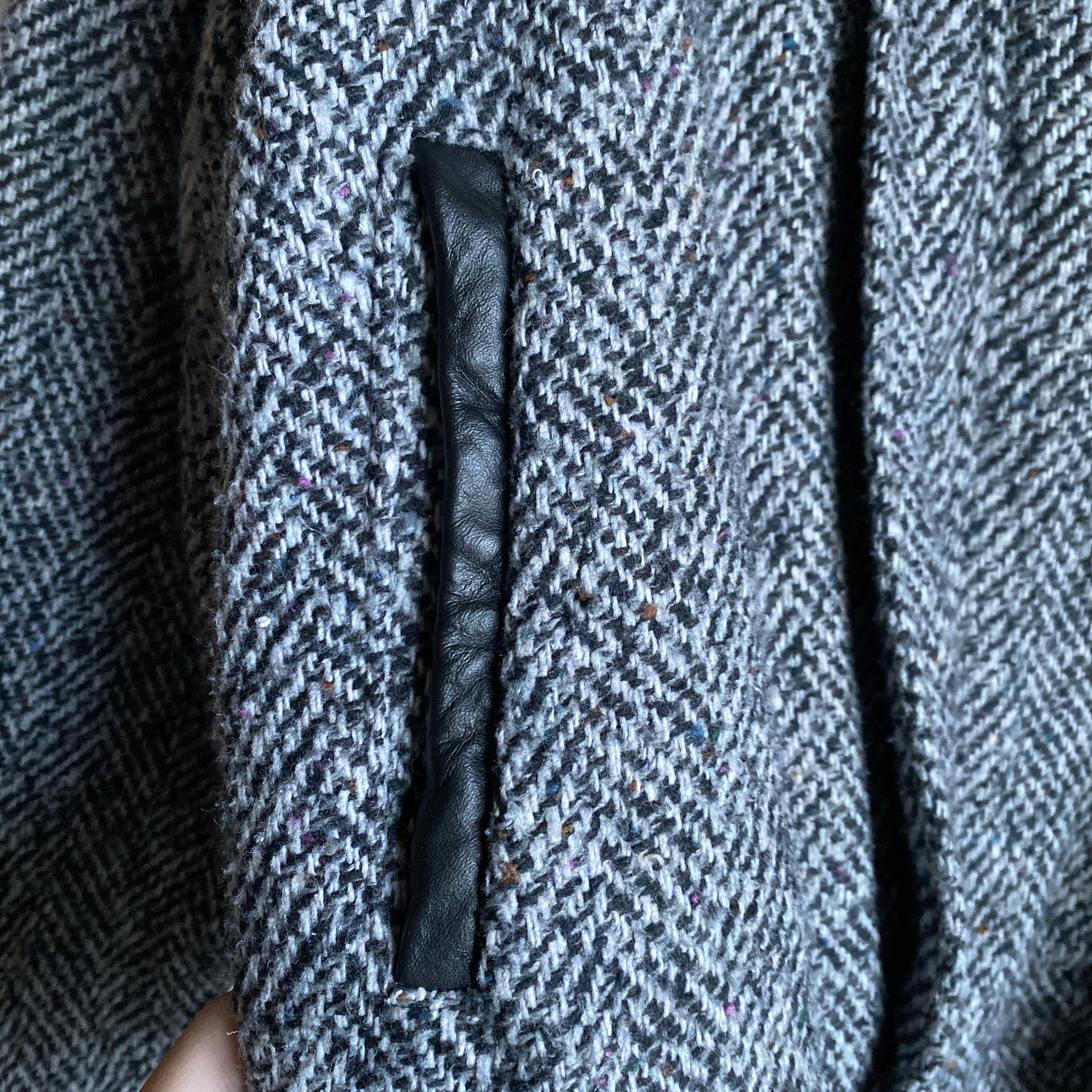 白黒モノトーンに細かなカラーネップ、ウールベース(おそらくアクリル混)のヘリンボーンツウィード生地にレザー切り替え、丸みのあるゆったりとしたボックスシルエットが非常に格好良い一着。