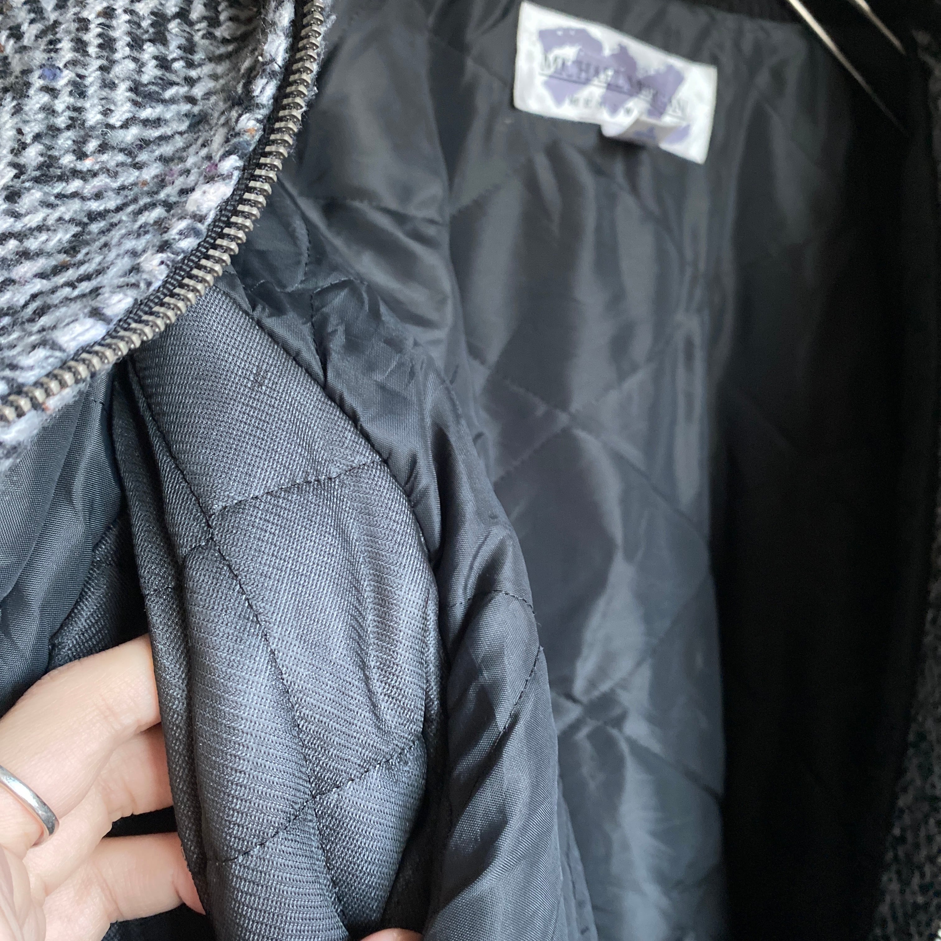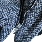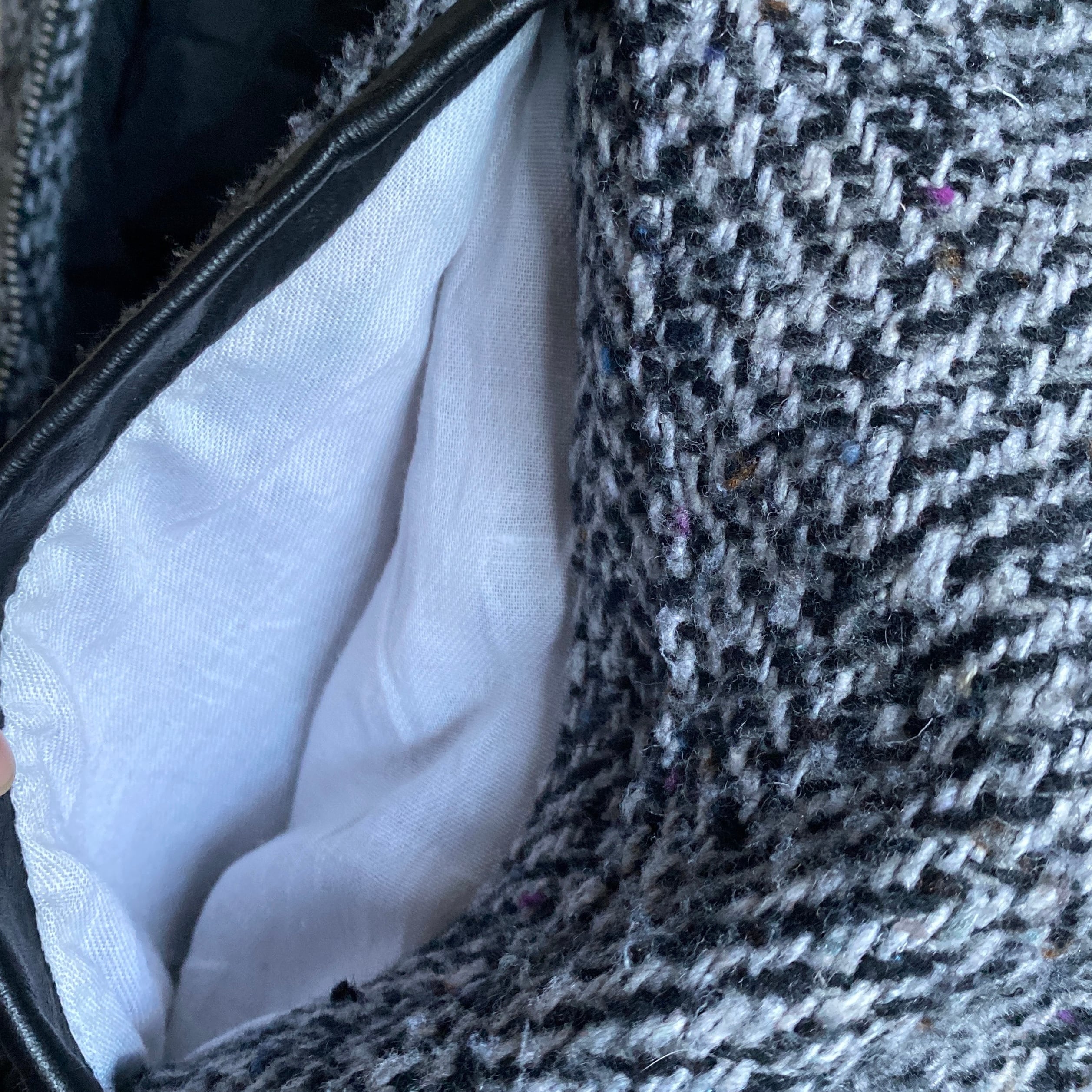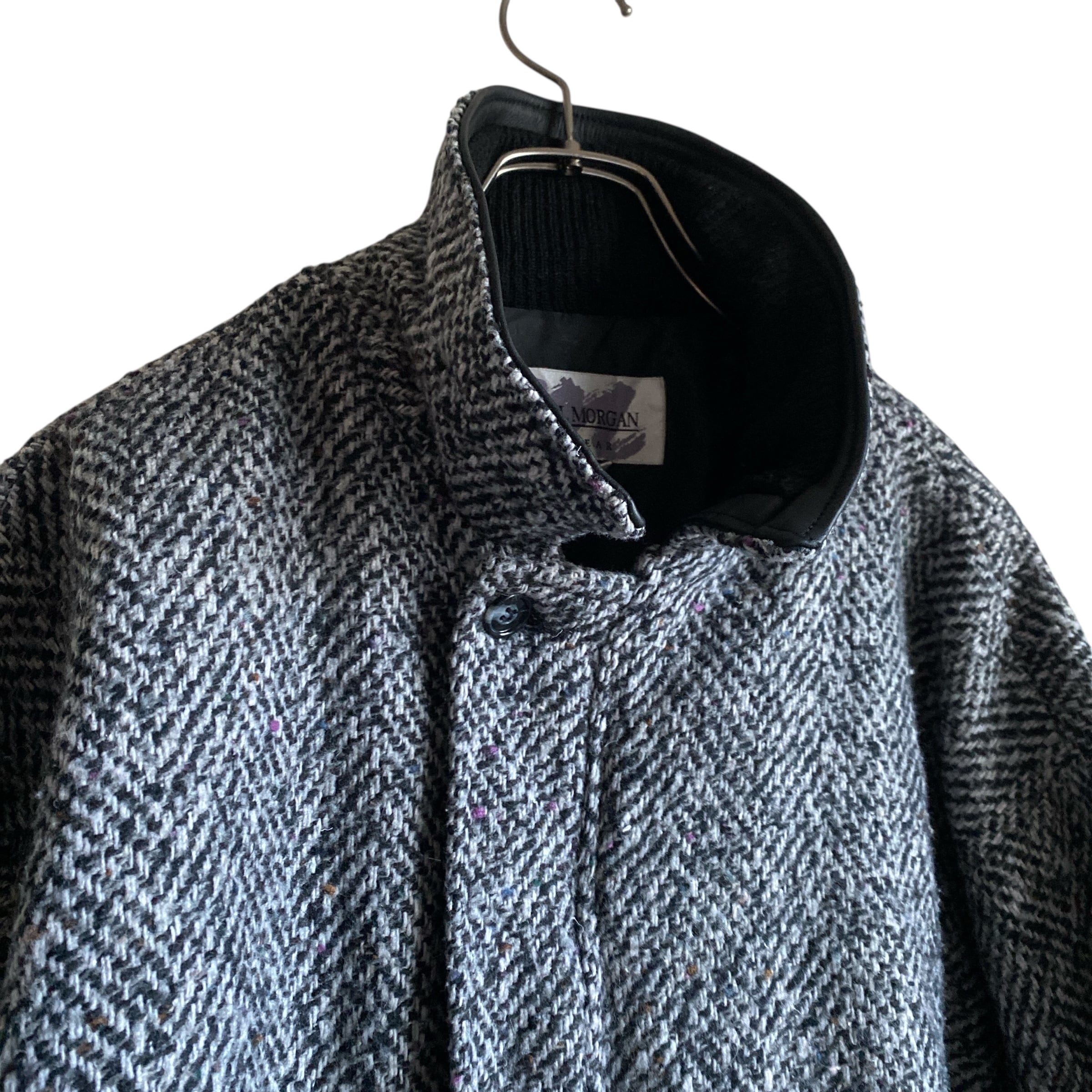 白黒モノトーンに細かなカラーネップ、ウールベース(おそらくアクリル混)のヘリンボーンツウィード生地にレザー切り替え、丸みのあるゆったりとしたボックスシルエットが非常に格好良い一着。