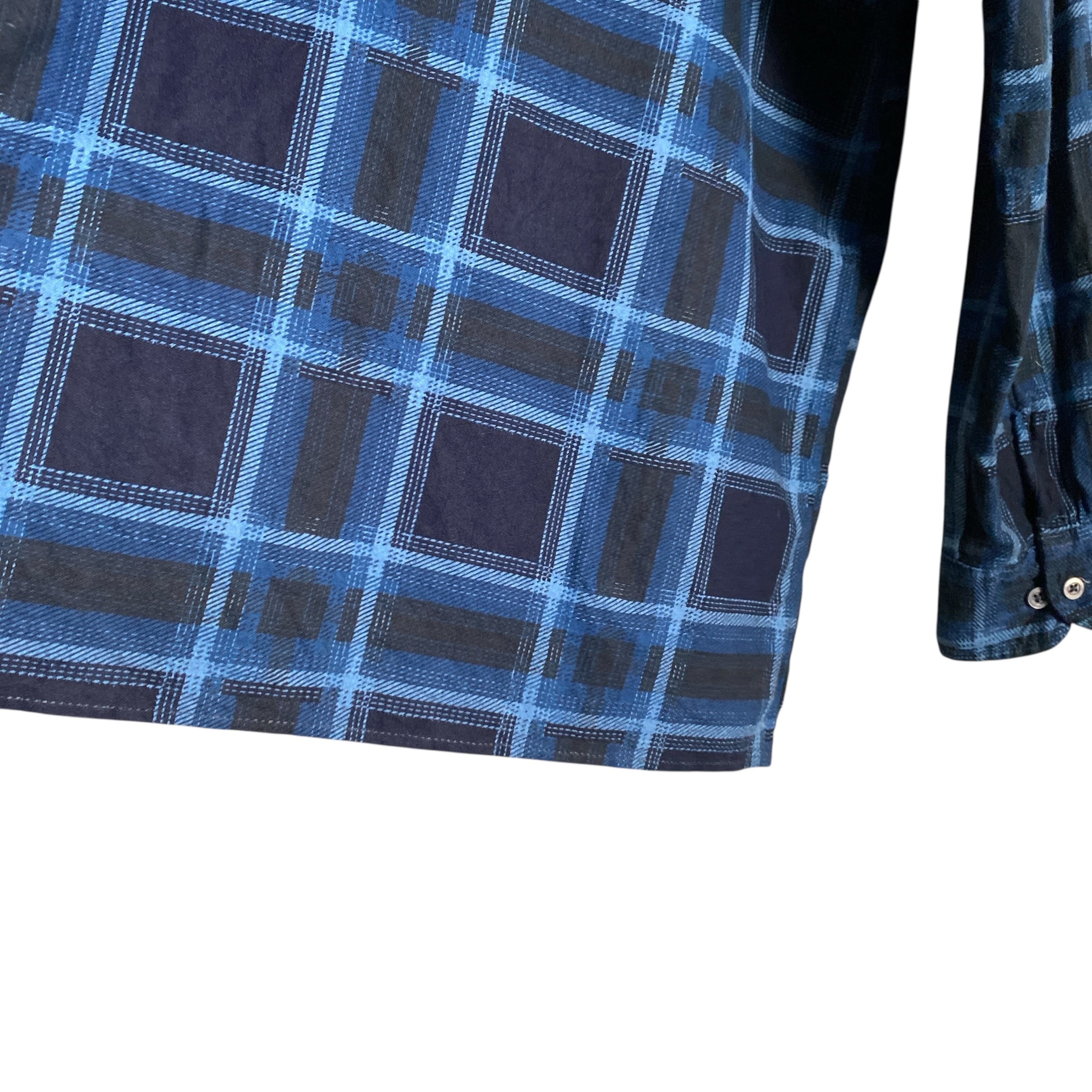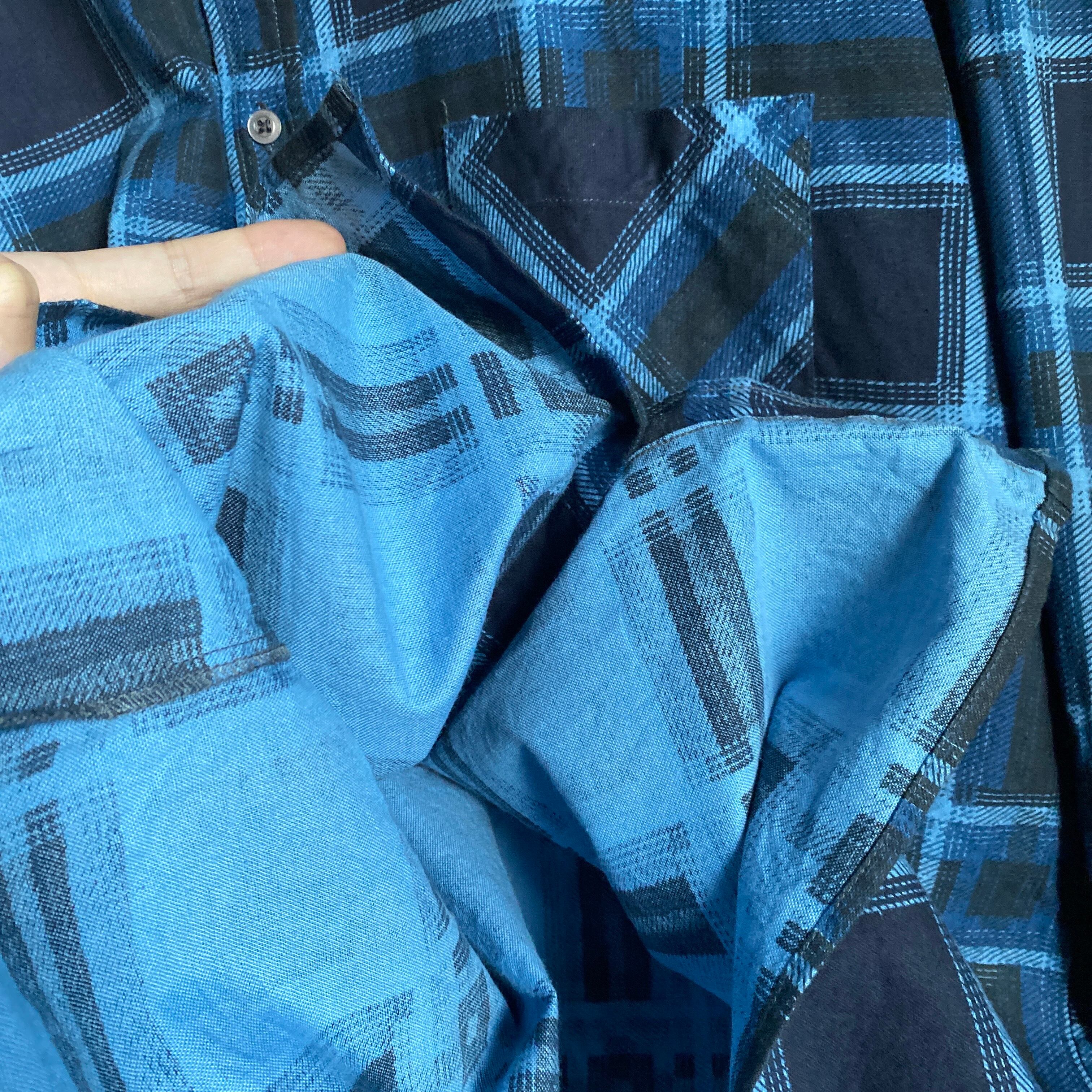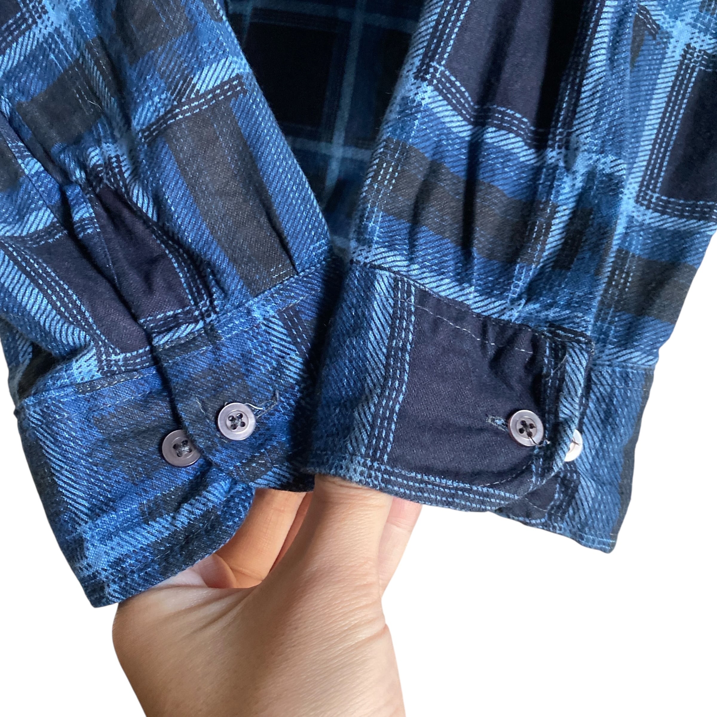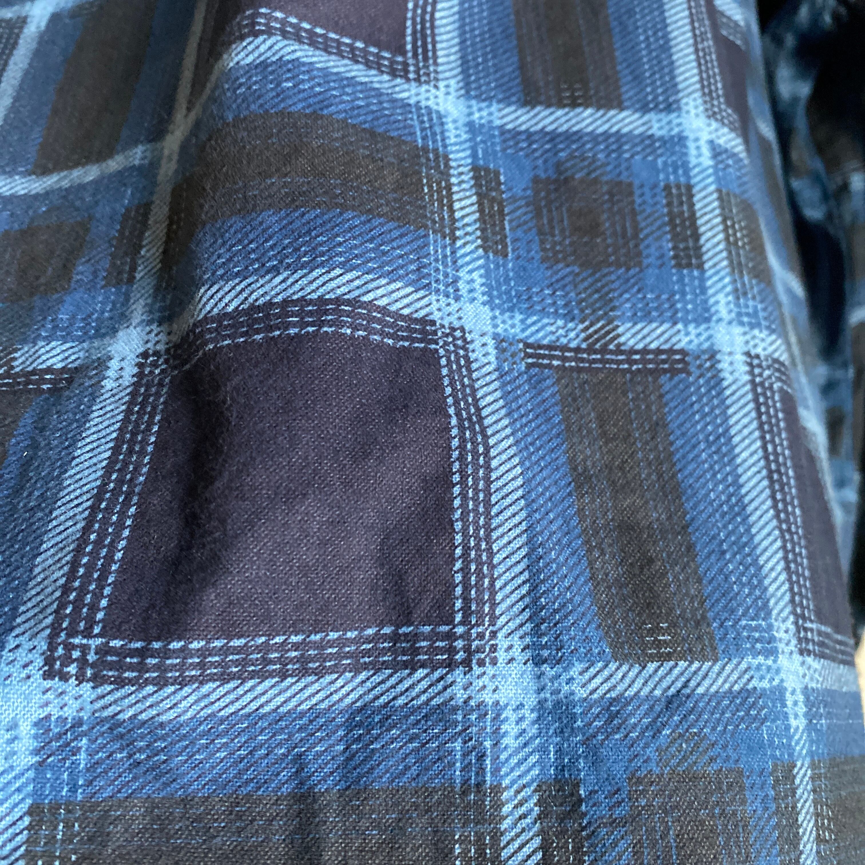 コットン100のライトネルに、くすんだブルーからダークネイビー、ブラックの好配色チェック、ストレートカットのバランスの良いシルエットが素晴らしい一着。