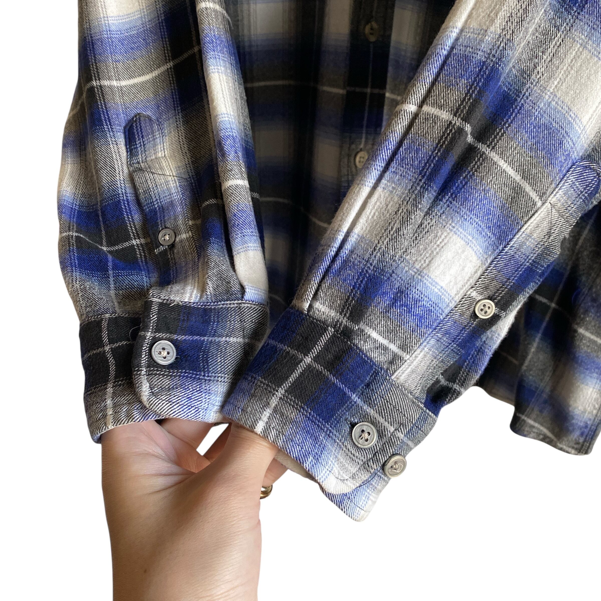 肉厚でトロみのある風合いの良いレーヨン生地に、ブルー×ブラック×ホワイトの好配色オンブレチェックが非常に格好良い一着。