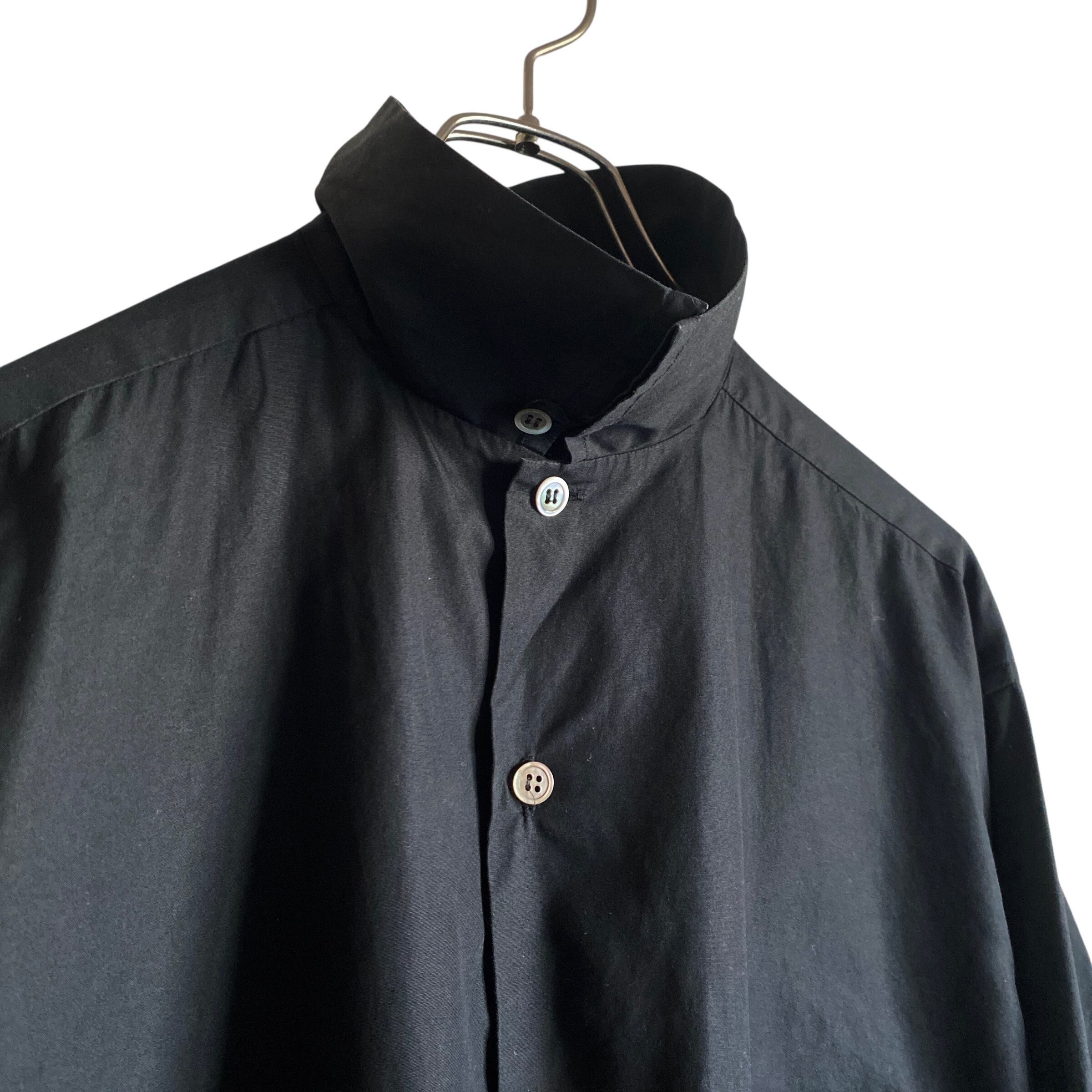 非常に目の詰まった上質なブロードクロスに、ブラックカラー、シャツにしては大ぶりな黒蝶貝ボタン、身幅広めでゆったりとしたYohjiらしいシルエット、オープンカラーにも立ち襟にもなる大きめの襟デザインが非常に素晴らしい一着。
