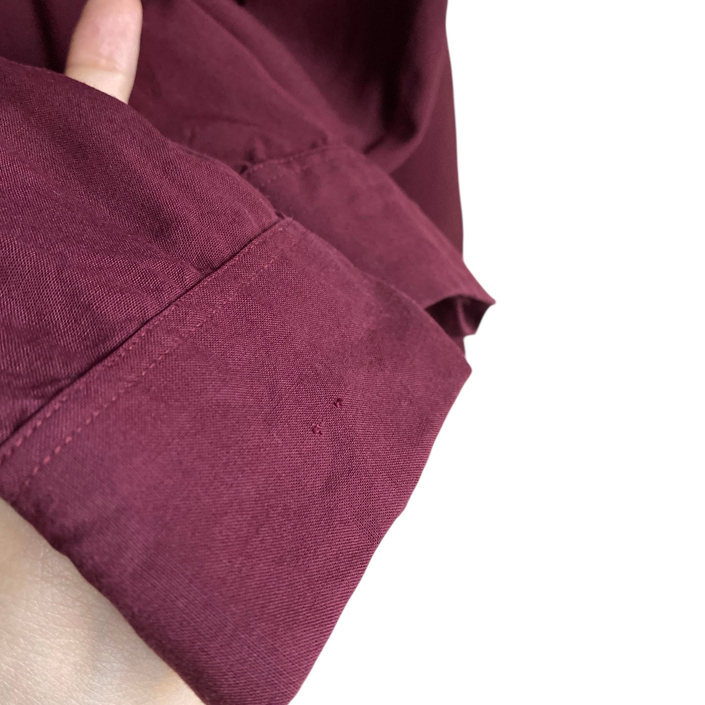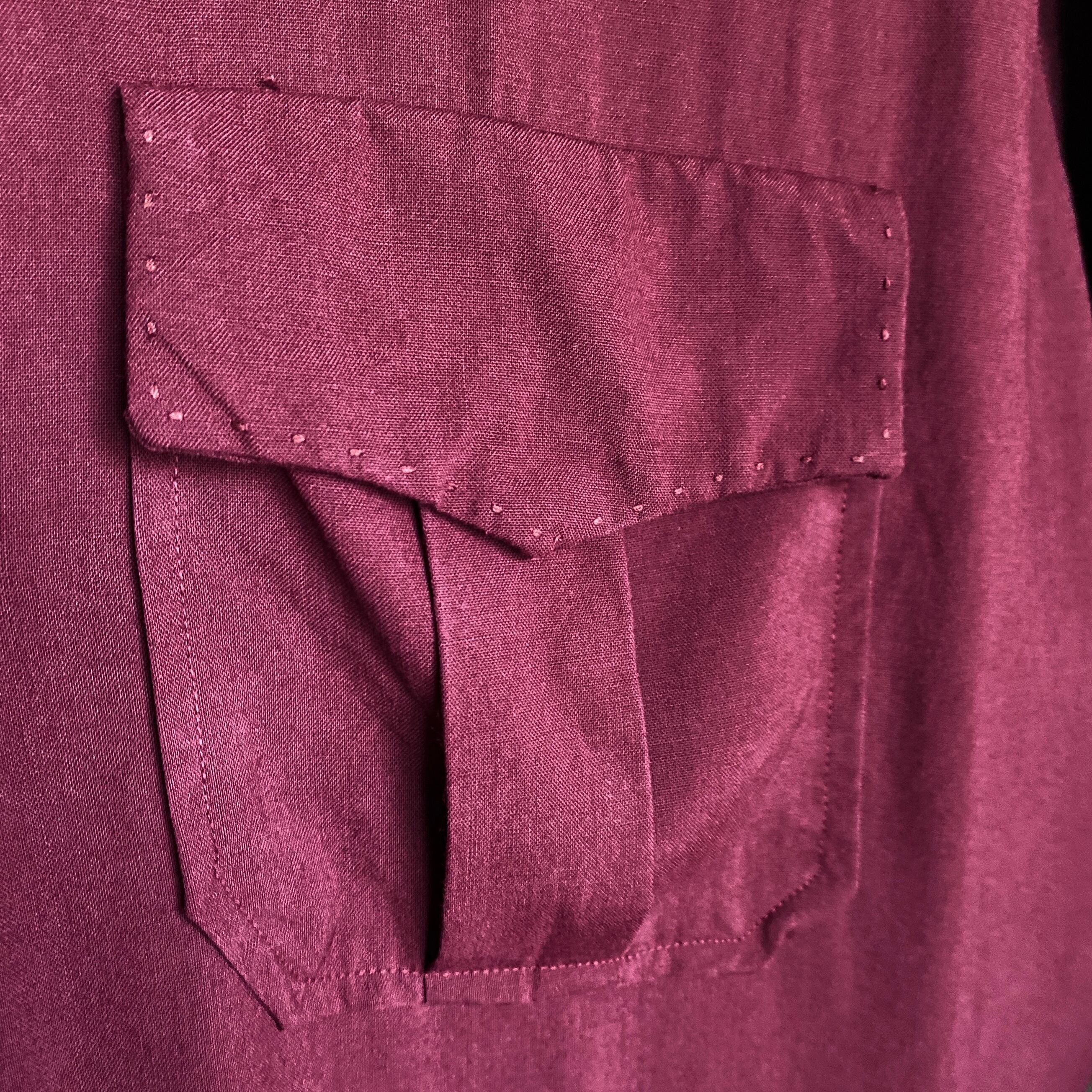 肉厚でハリコシがありつつ美しいドレープ感のある上質なレーヨン生地に、上品なボルドー(ダークバーガンディ)カラー、ゆったりとしたボックスシルエットが大変素晴らしい一着。