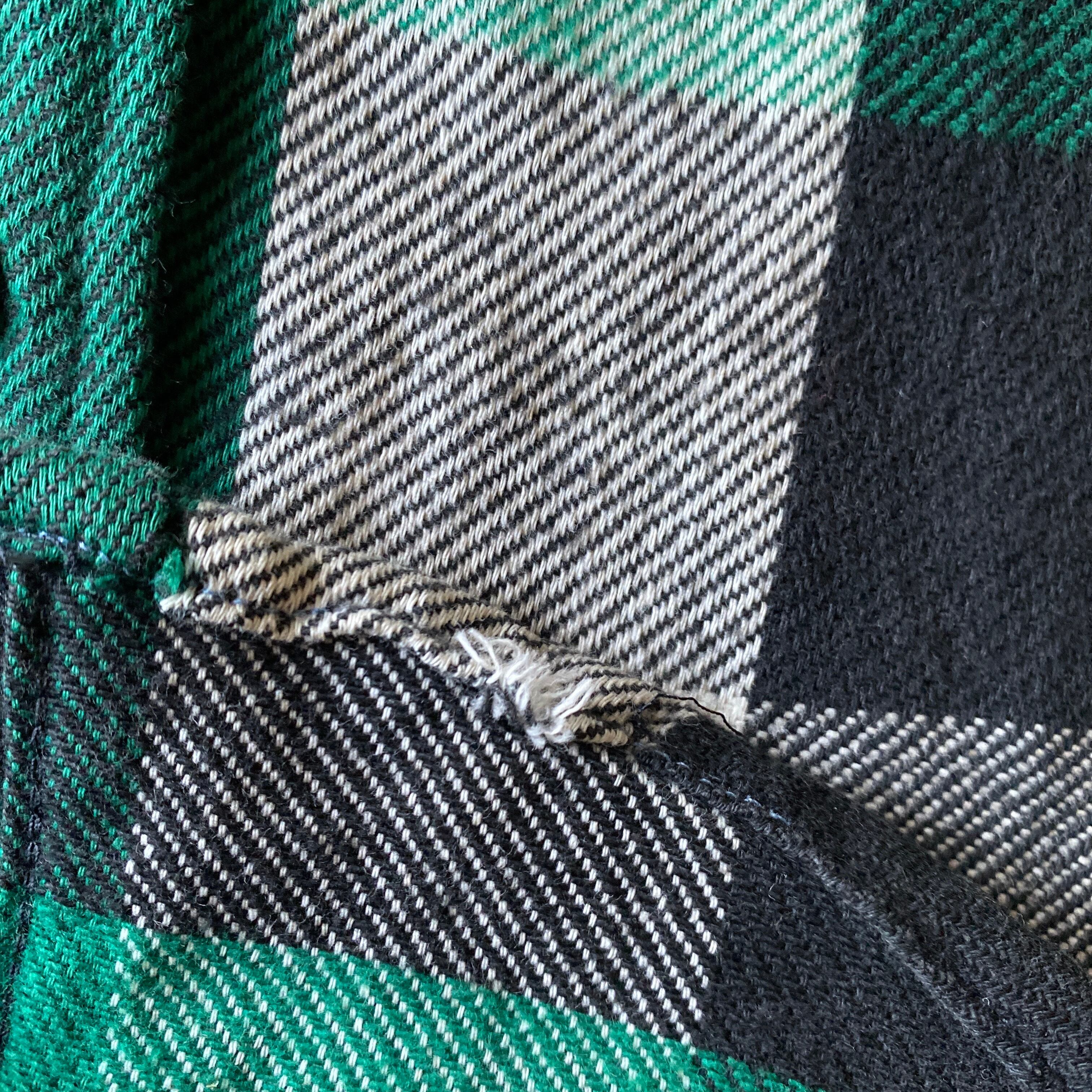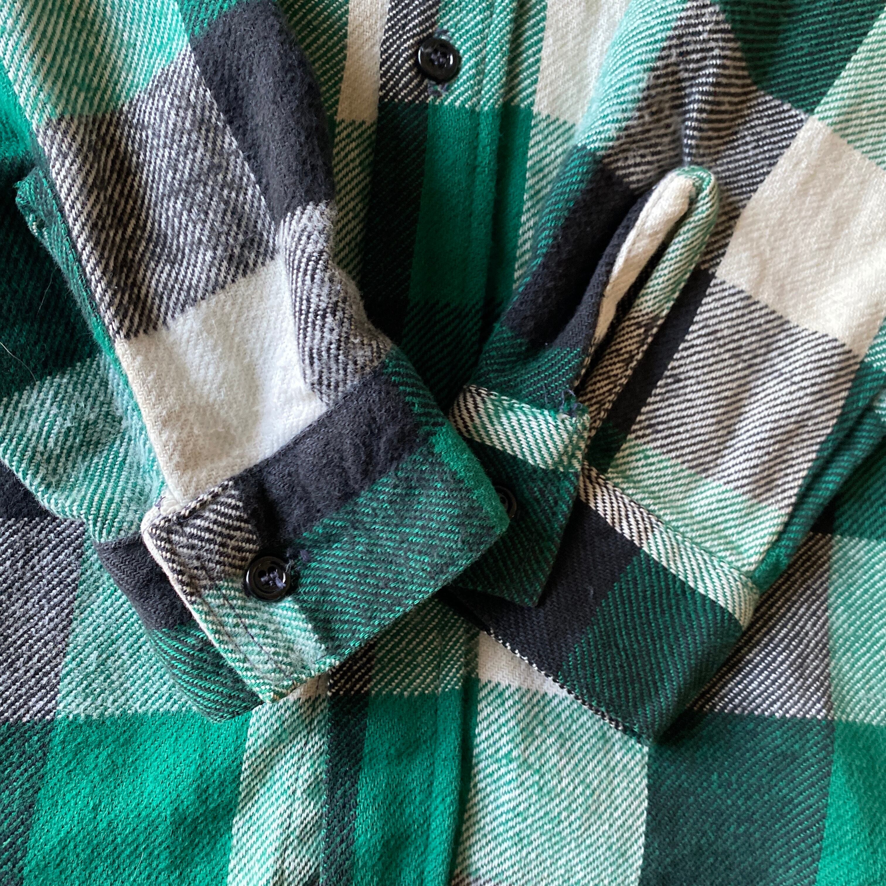 肉厚でモチっとしたコットンネル素材に、ブラック×グリーン×ホワイトの好配色なチェックパターンが非常に格好良い一着。(別ブランドや90年代の物だとたまに見かけますが、このタグだとわりと見かけないカラーリングだと思います)
