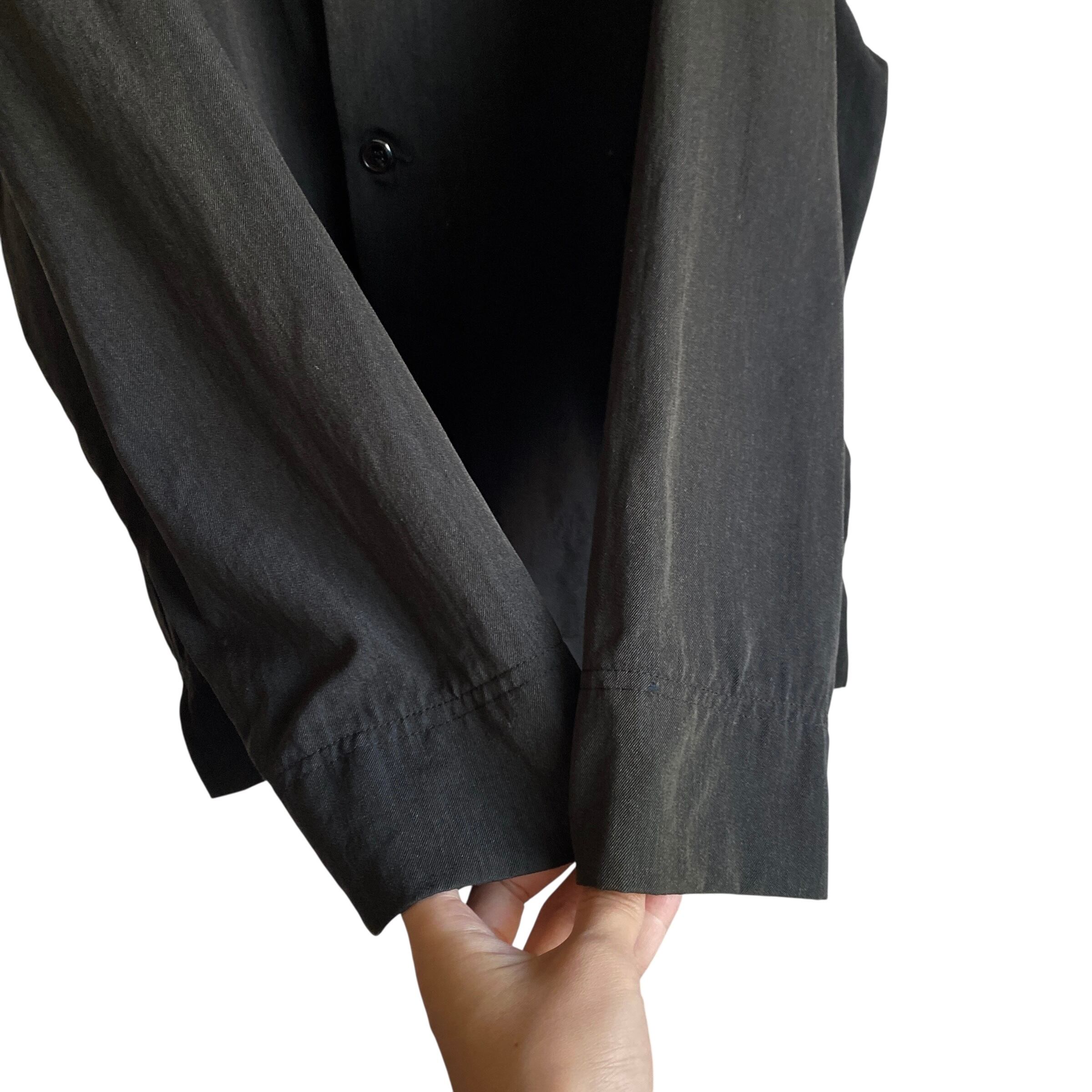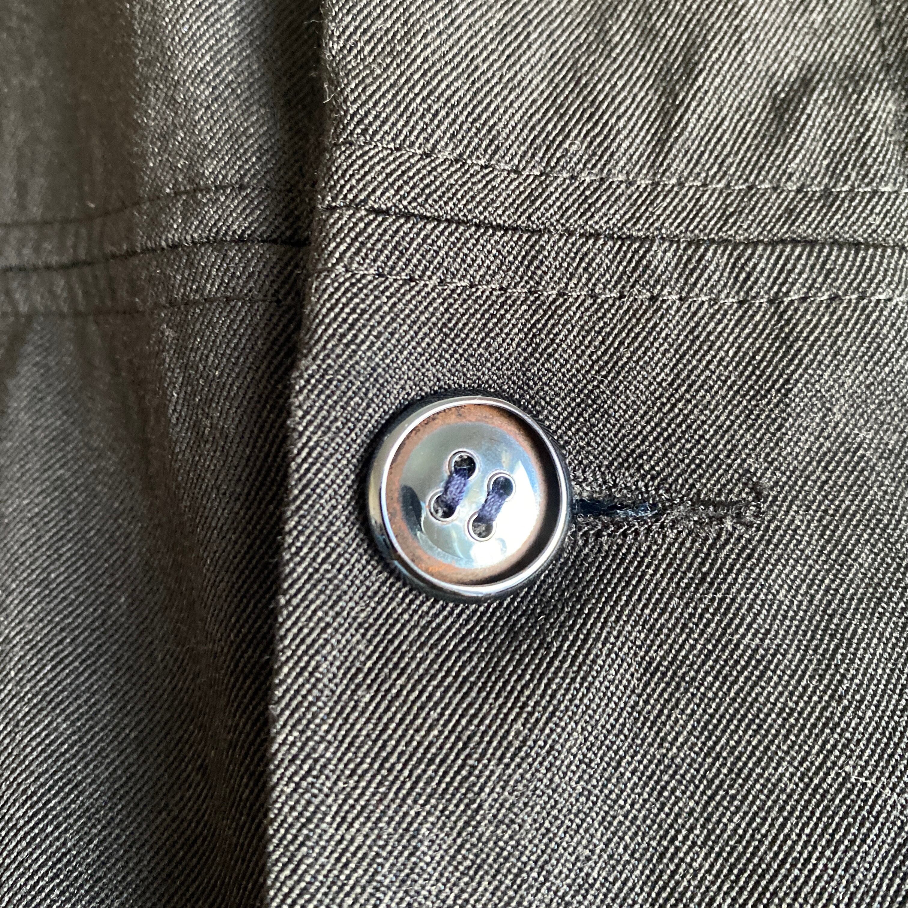 MK-3やキャップショルダージャケットなどさまざまな要素が混ざったような、マスキュリンでありながらどこか中性的でエレガントな雰囲気を感じるデザイン、肉厚でハリコシのあるウールベースのギャバジン生地、フェードしたブラックカラーが素晴らしい一着。