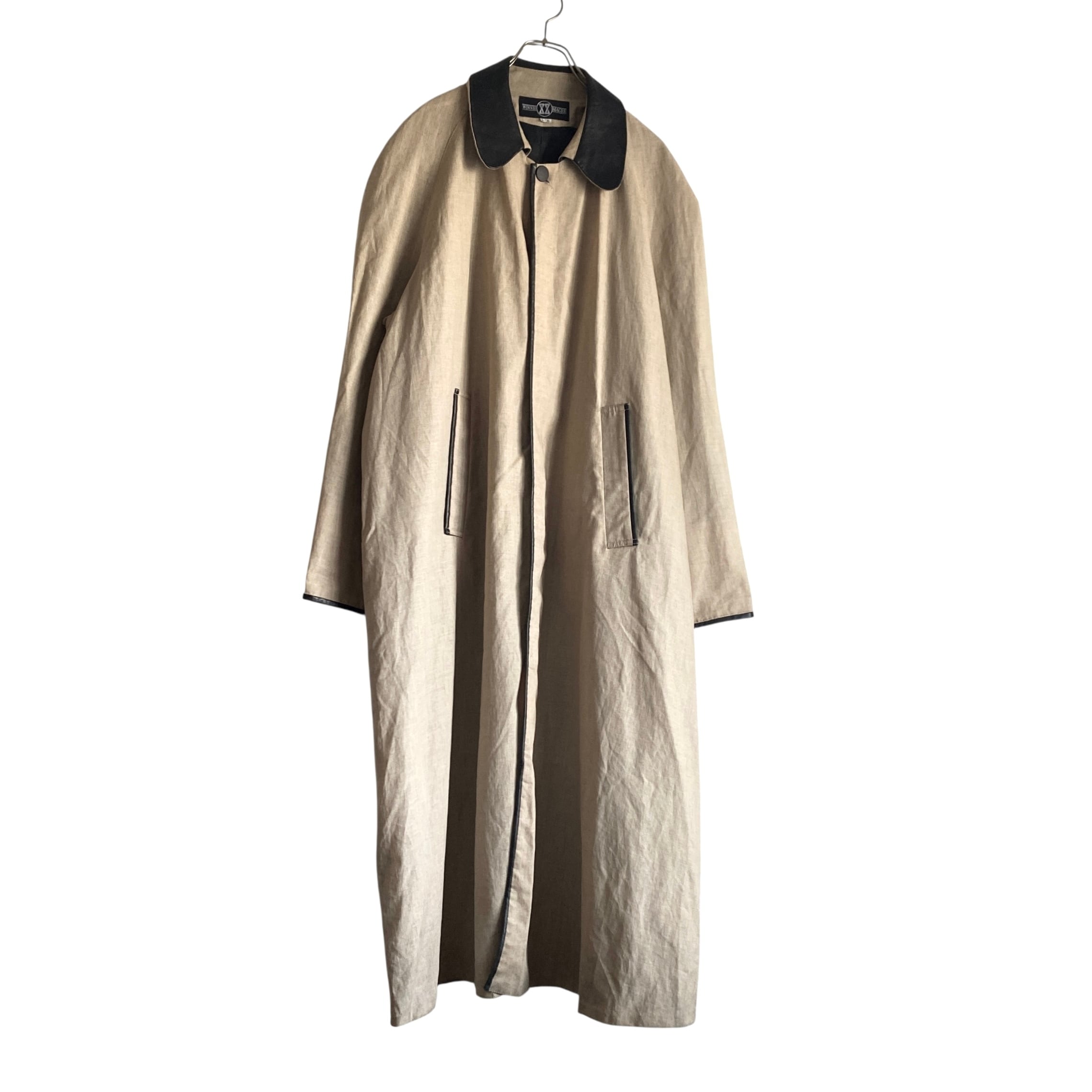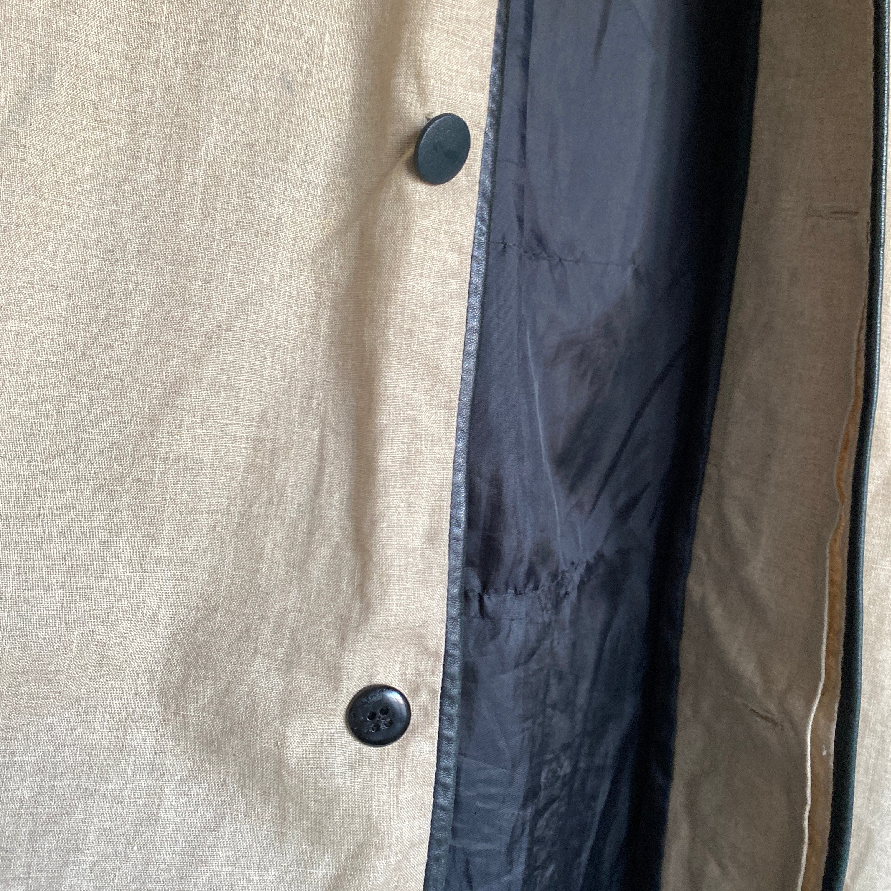 まさかのコートでアイリッシュリネン×レザー切り替えという中々イカつい一着。