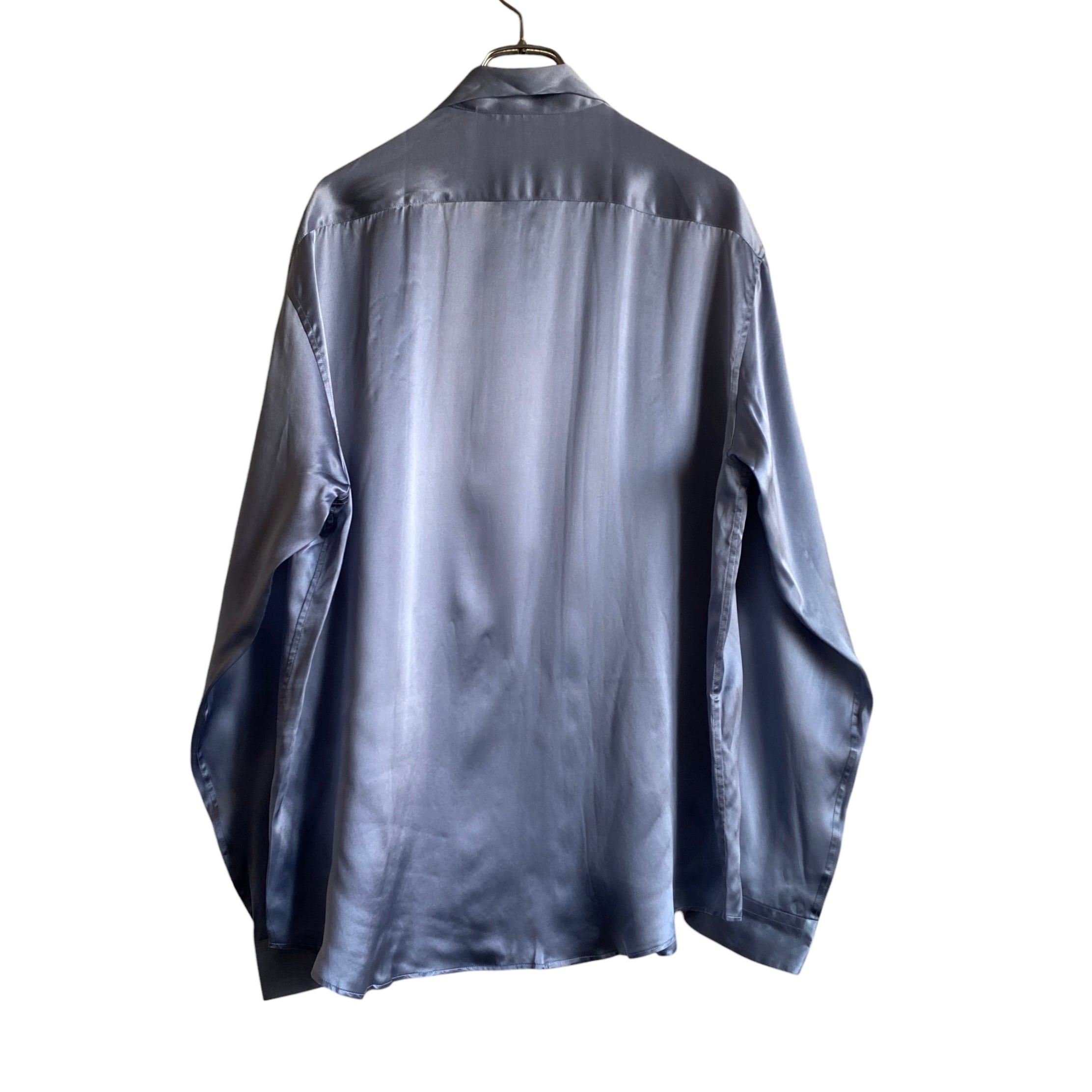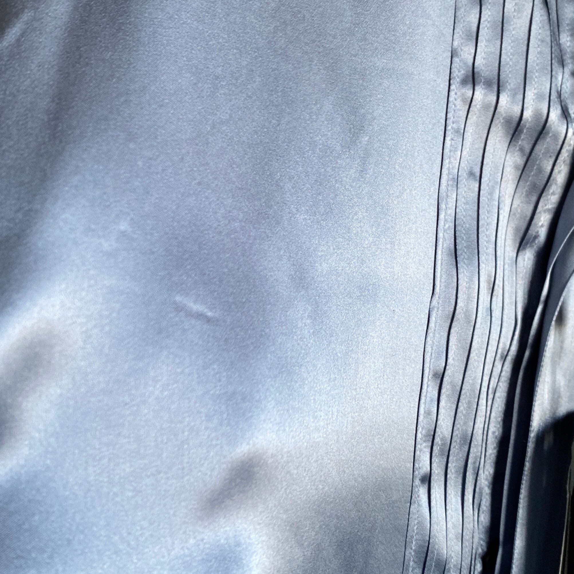 フロントピンタックの比翼仕立てに、チンストがついた個性的なデザイン、ブルーグレー系の上品な色目(全体写真が近いです)、程よく肉厚でとろみのある上質なウォッシャブルシルク、タックの入らないゆったりとしたシルエットが非常に格好良い一着。