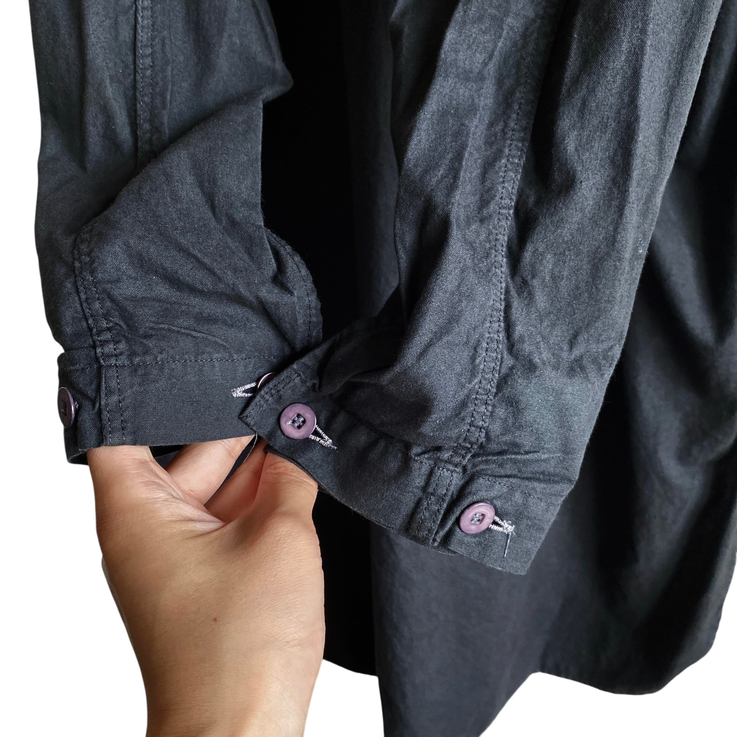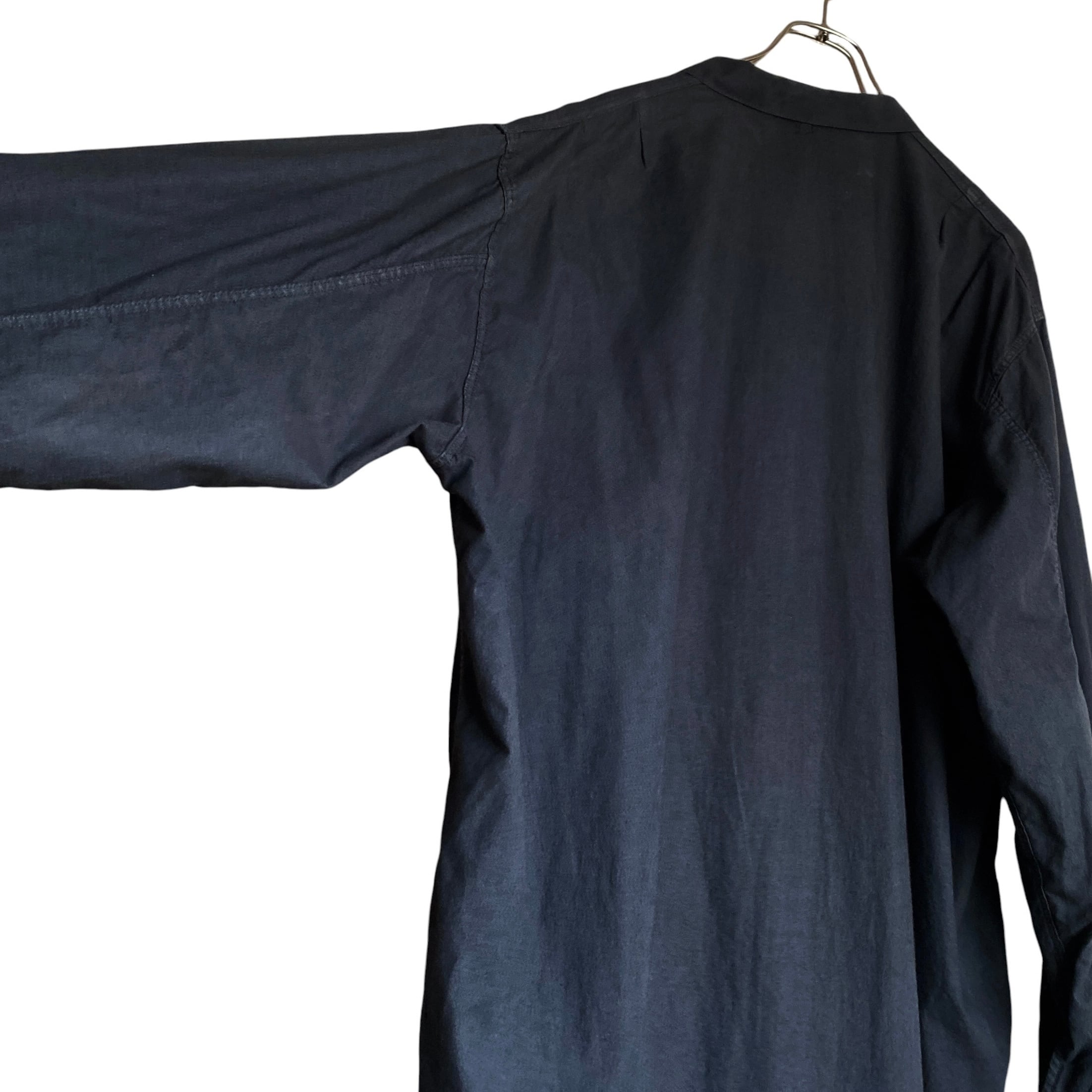 程よくコシはありつつ柔らかい平置きのコットンに、後染めブラックカラーの風合い、ゆったりとしたシルエット、台襟なしでオープンカラーっぽく着られるデザインが非常に格好良い一着。