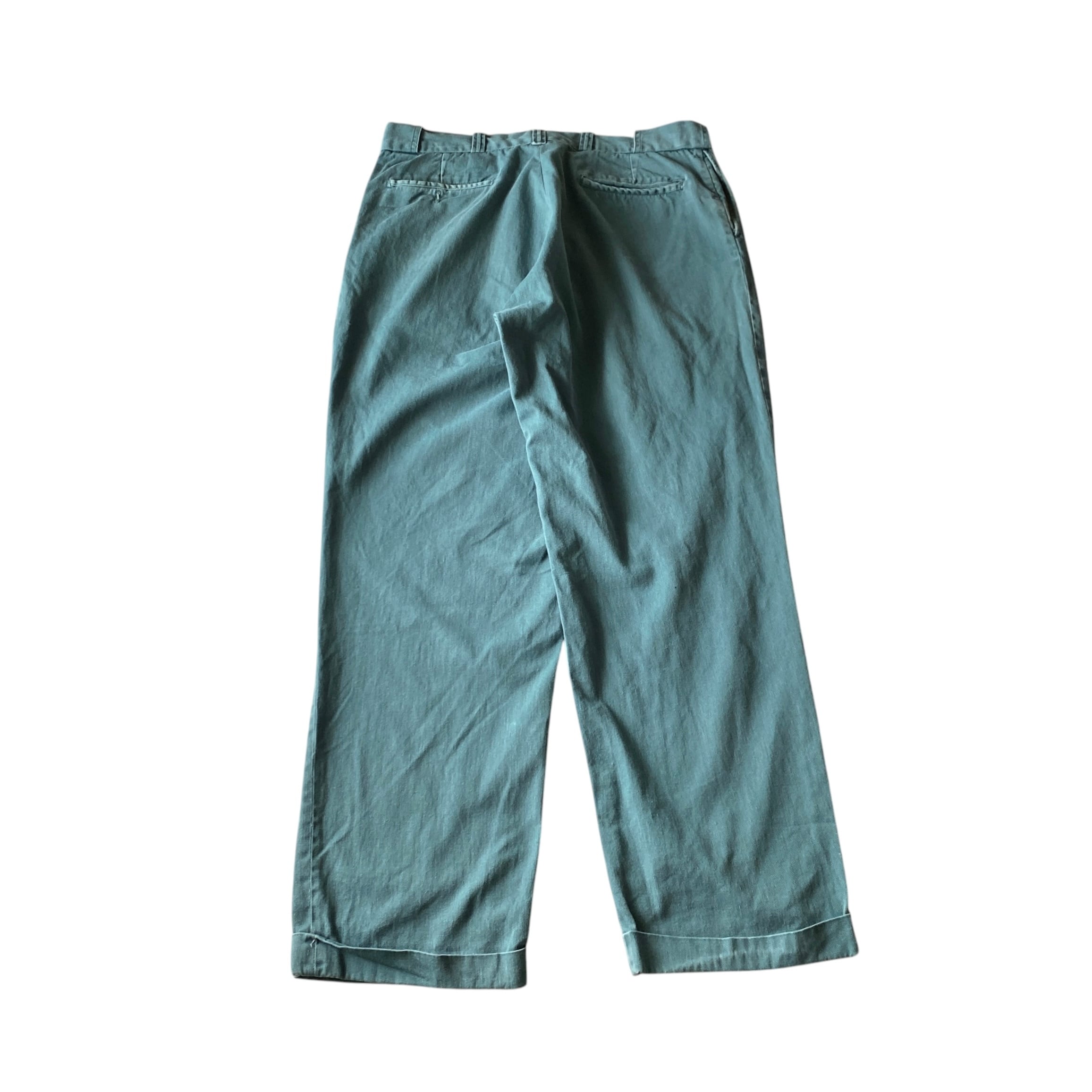 目の詰まった風合いの良いコットンツイルに、dickies874のようなベーシックなストレートシルエット、リンカーングリーン系の綺麗な色目が格好良い一着。