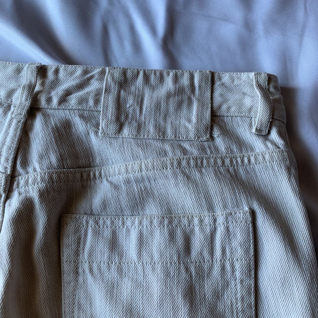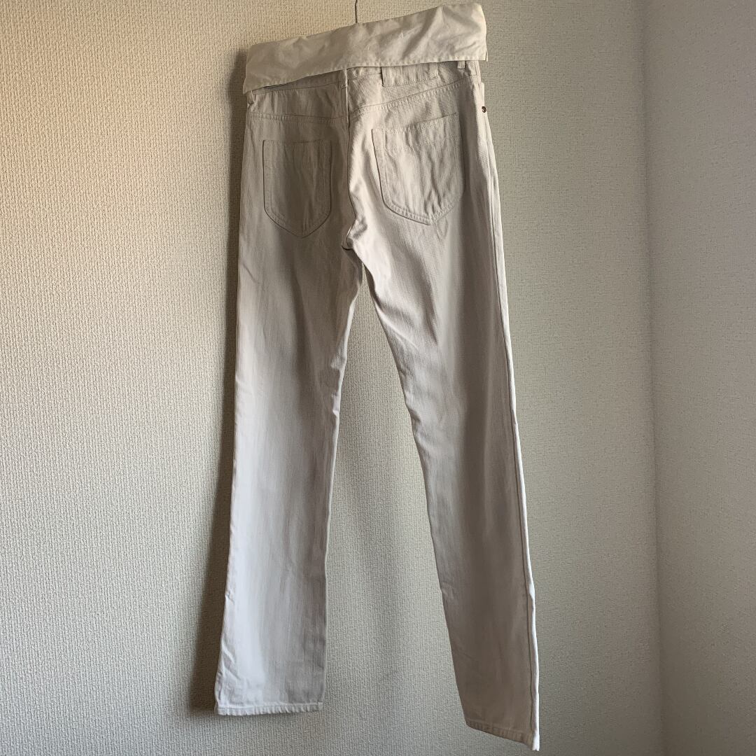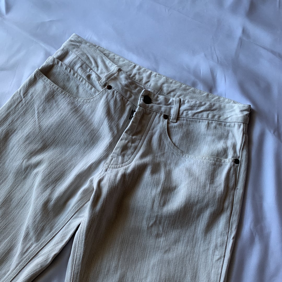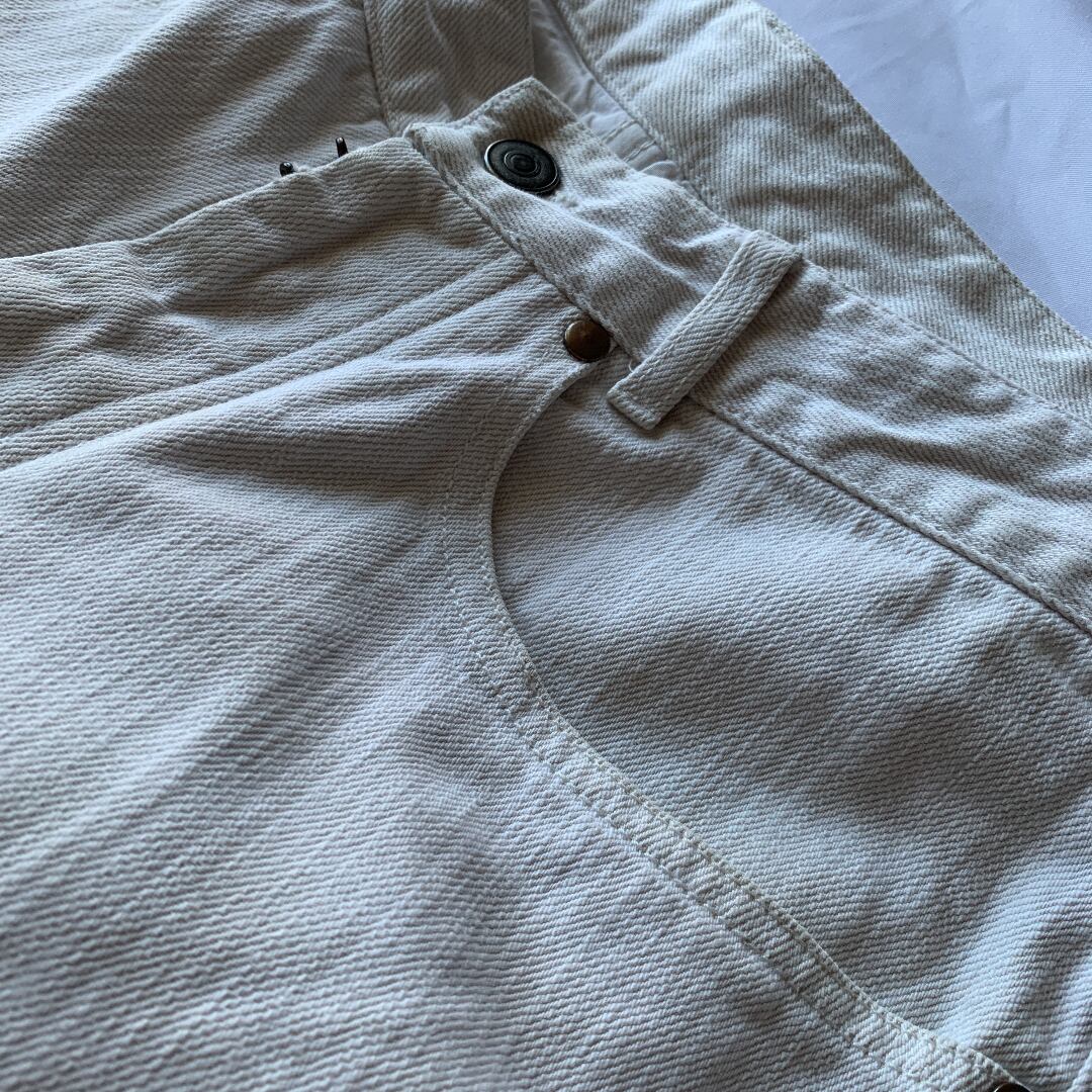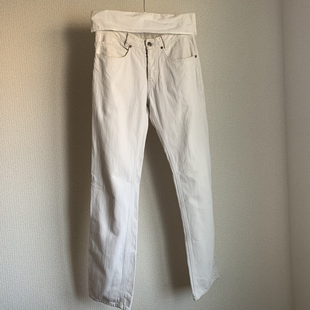 一見するとただのホワイトデニムでありながら、縦糸にホワイト、横糸にベージュを使うことで、ただの単色ホワイトとは違った奥行きのある色目となっており、ストレートのやや野暮なシルエットと相まってホワイトデニム特有のキザっぽさをうまく消しています。