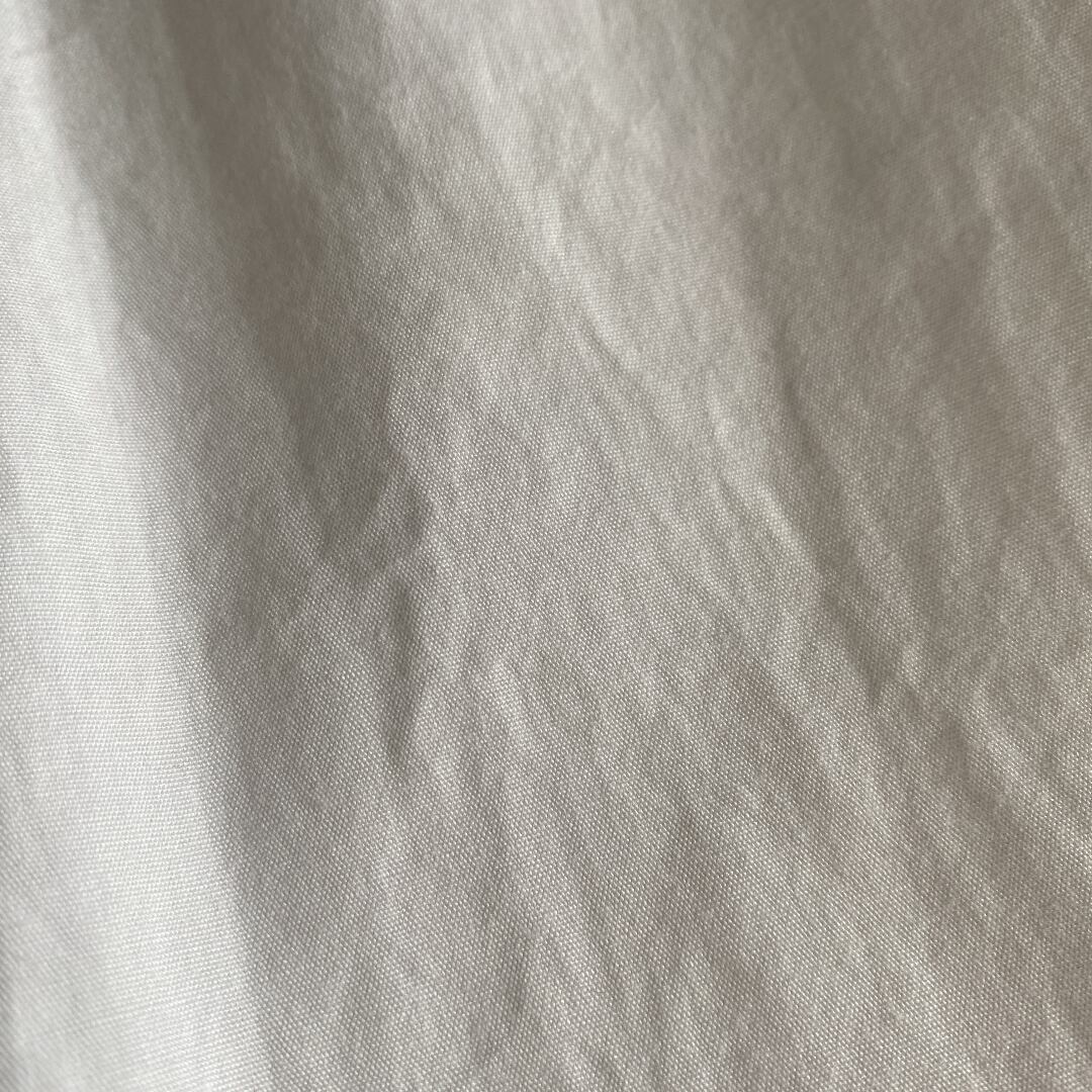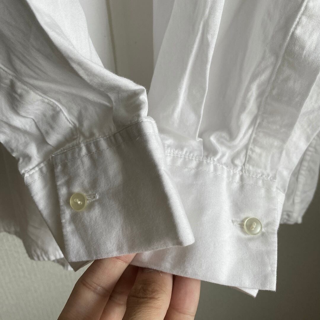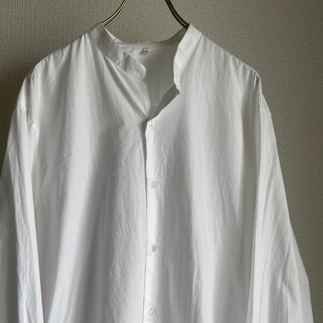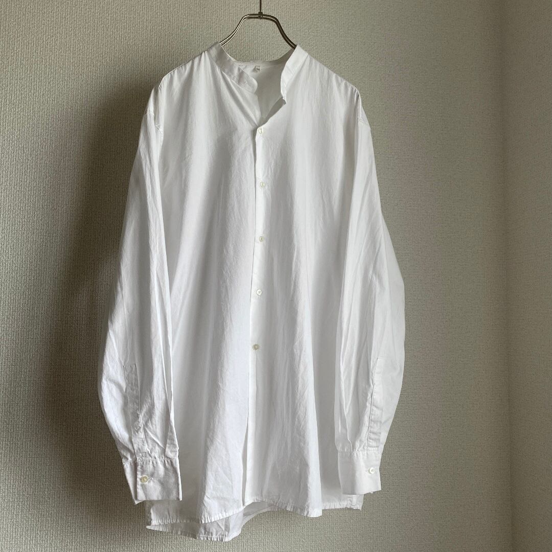 ホワイトの上質なコットンポプリン素材を使用し、スタンドカラーに仕立てられたミリタリーシャツとは思えないほど洗練された一着。