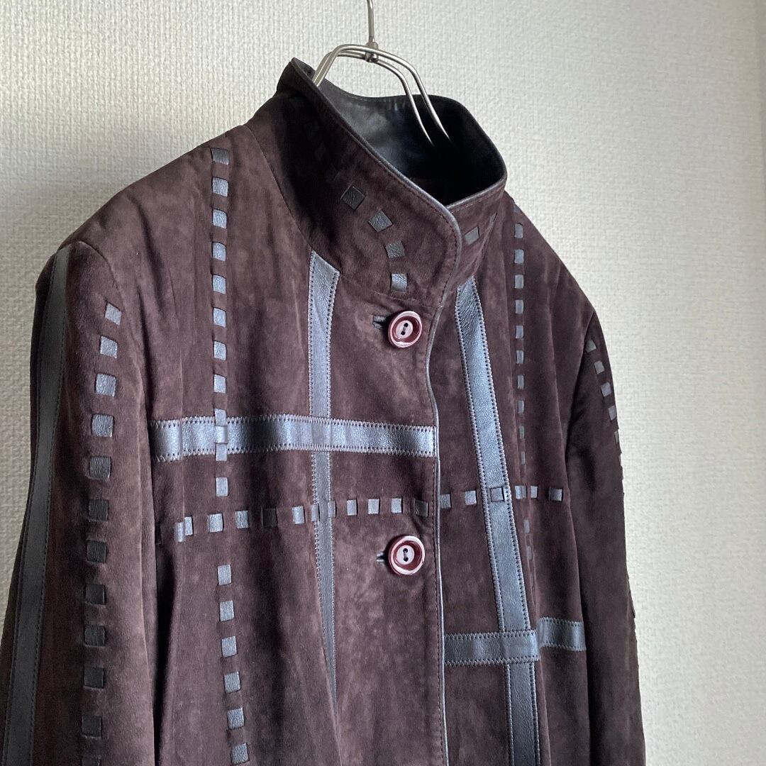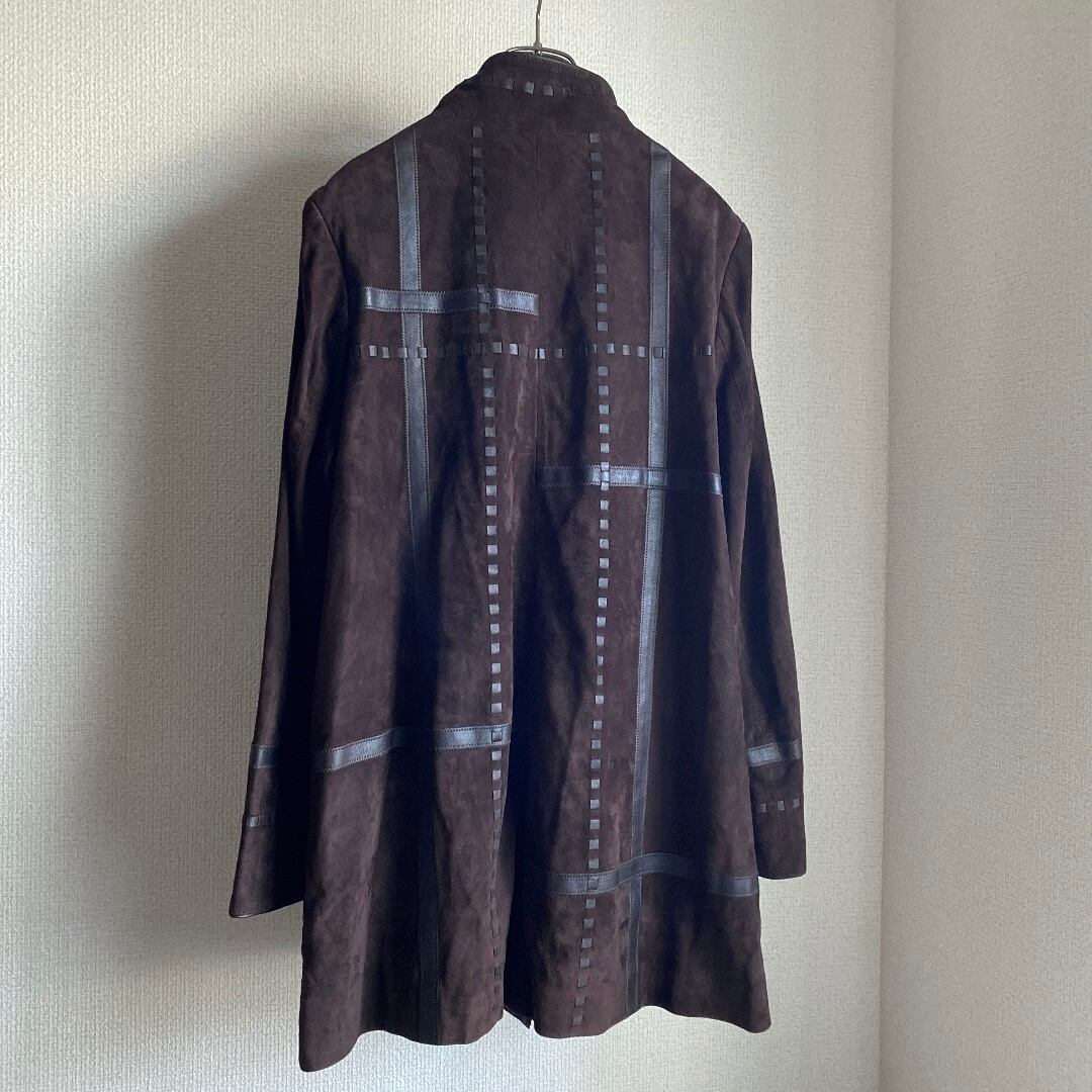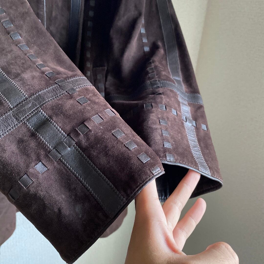 こちらはブラウンの表裏革を編み込ませたようなデザインで、どことなく70sのクラフト感がありつつ、ハイネックなので非常にエレガントな一着。