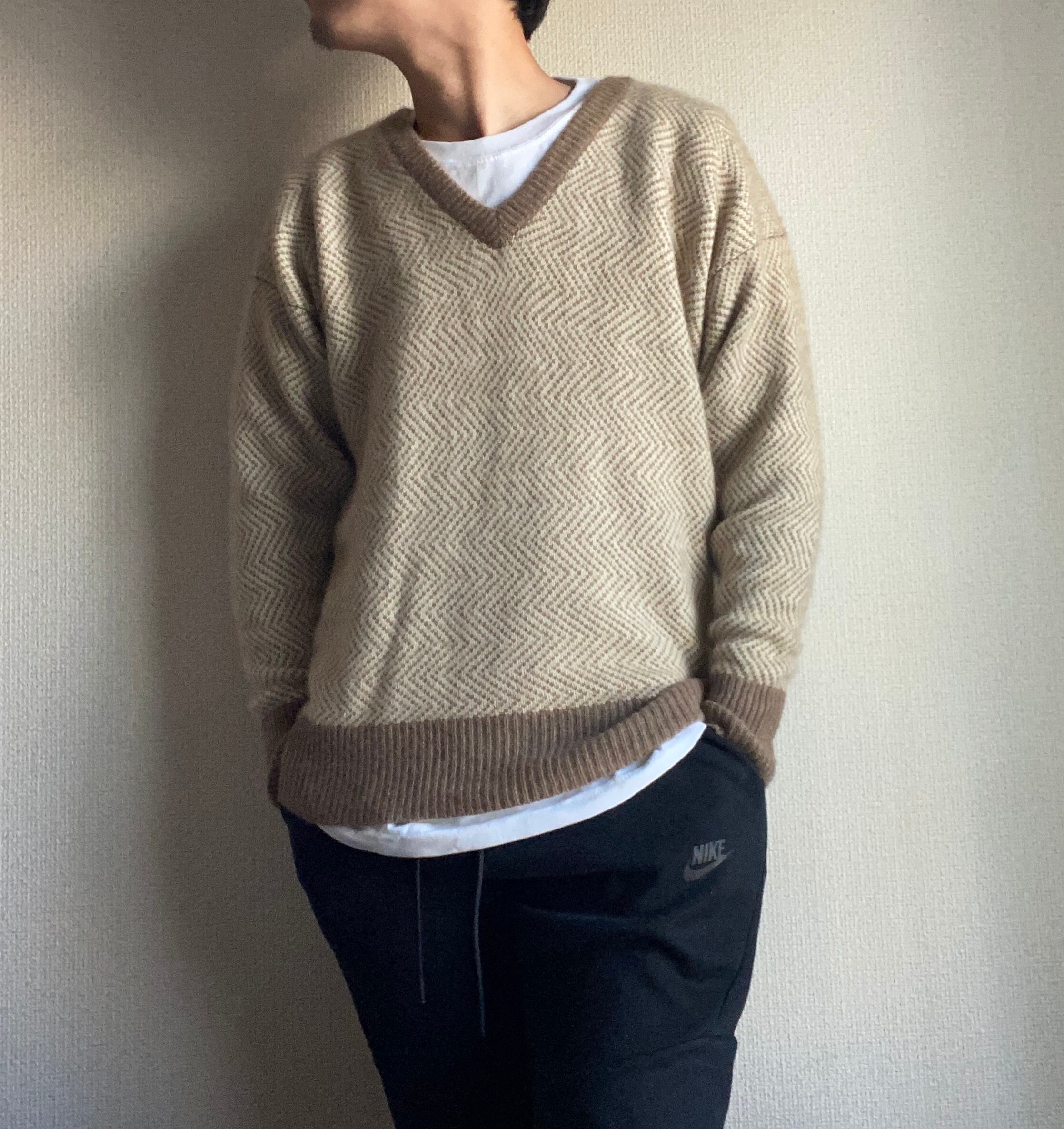 やや深めのVネックですが、ベージュ×ブラウンのかなり優しい配色かつドロップショルダーですので、決めすぎたような雰囲気には一切ならず、上品でありながらやや抜けのある印象です。