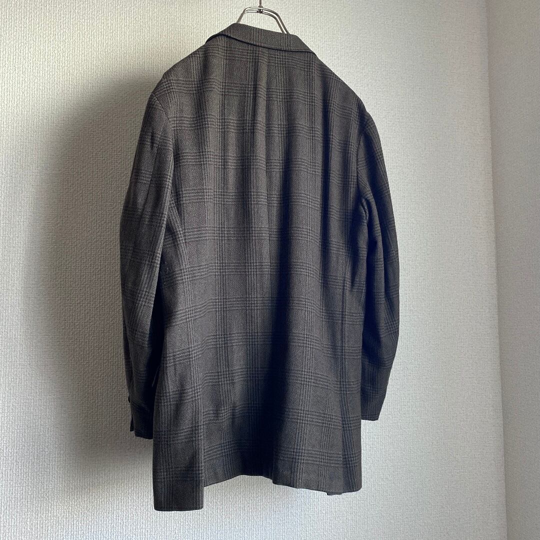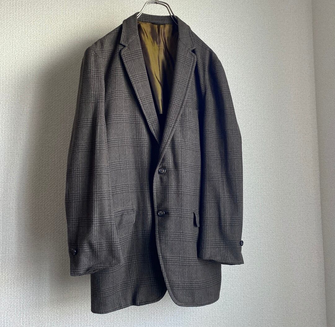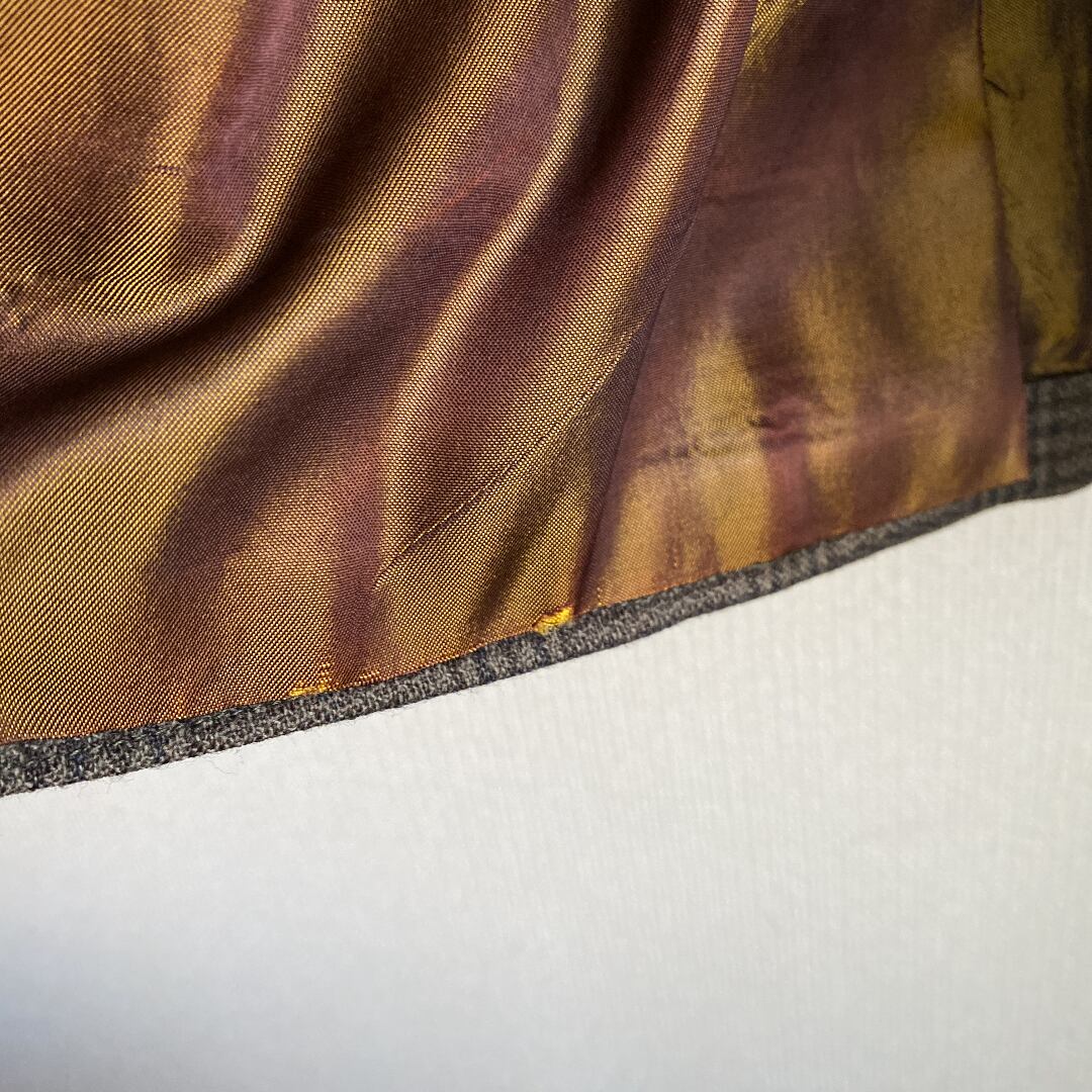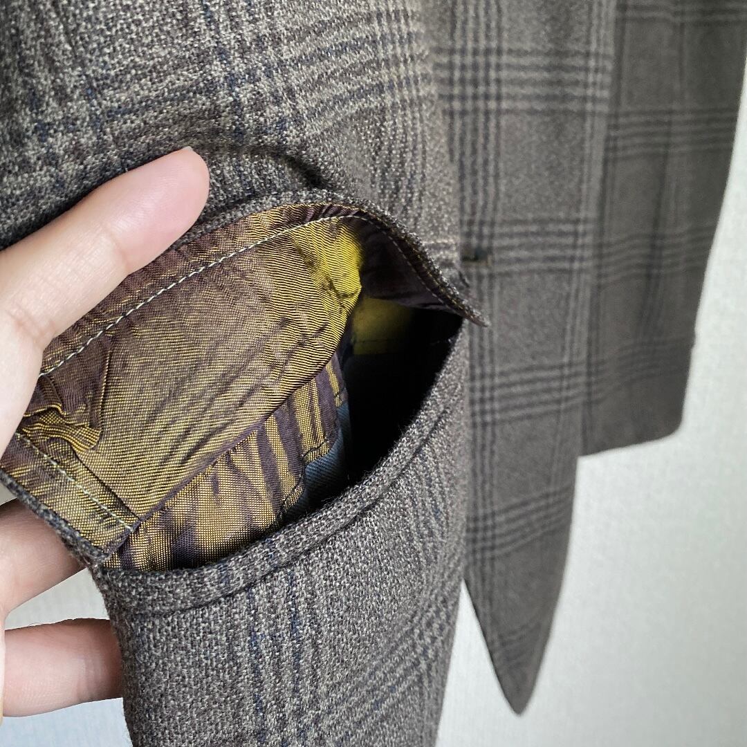 もちっとしたウールボディに、グレーブラウン系の同色チェック柄、鈍い玉虫ゴールドの裏地が非常に格好良く雰囲気の良い一着。