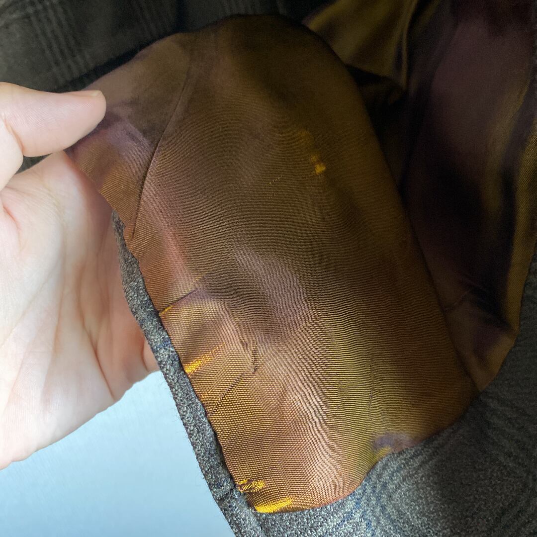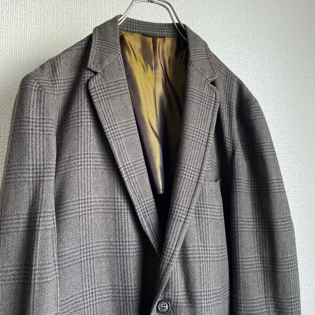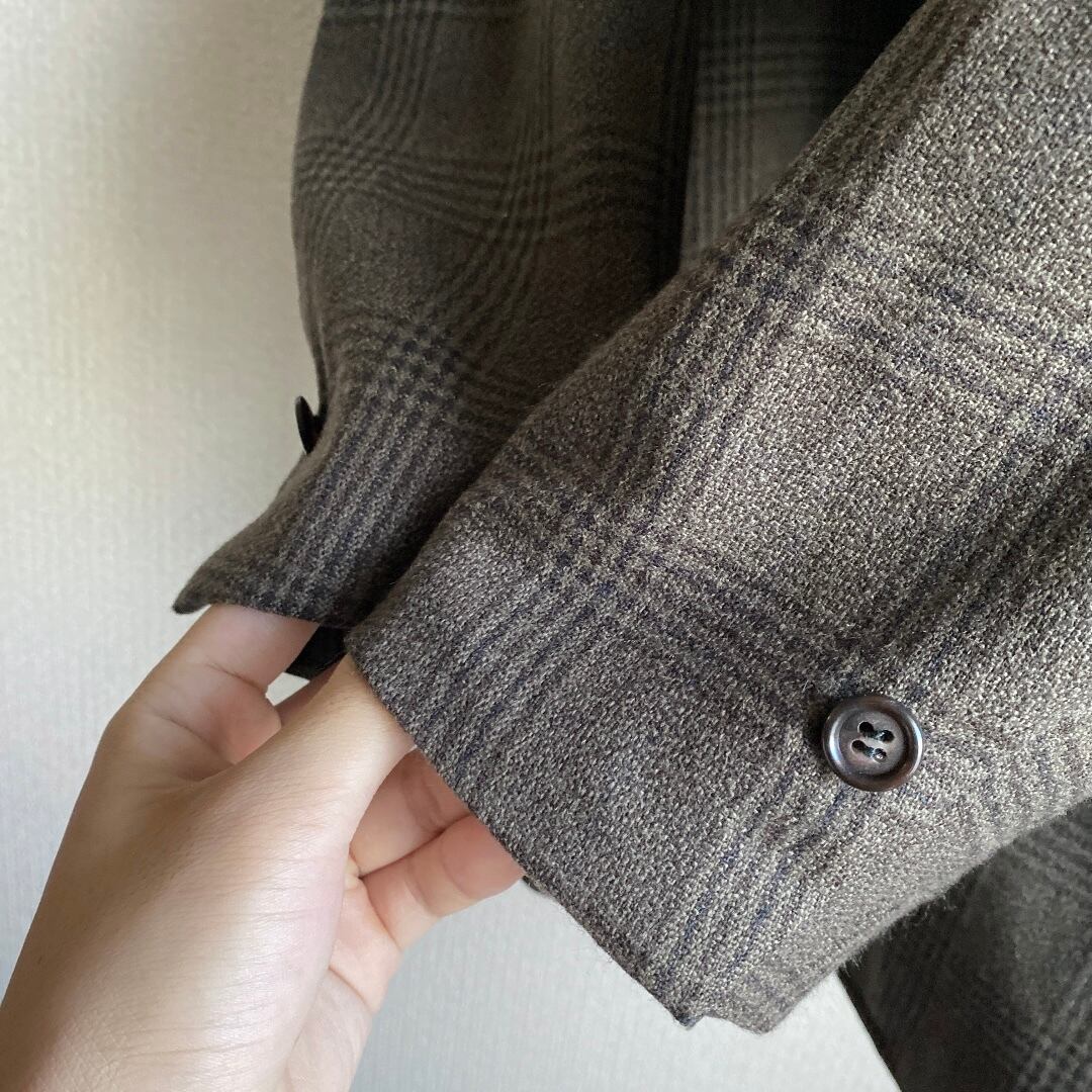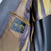 もちっとしたウールボディに、グレーブラウン系の同色チェック柄、鈍い玉虫ゴールドの裏地が非常に格好良く雰囲気の良い一着。