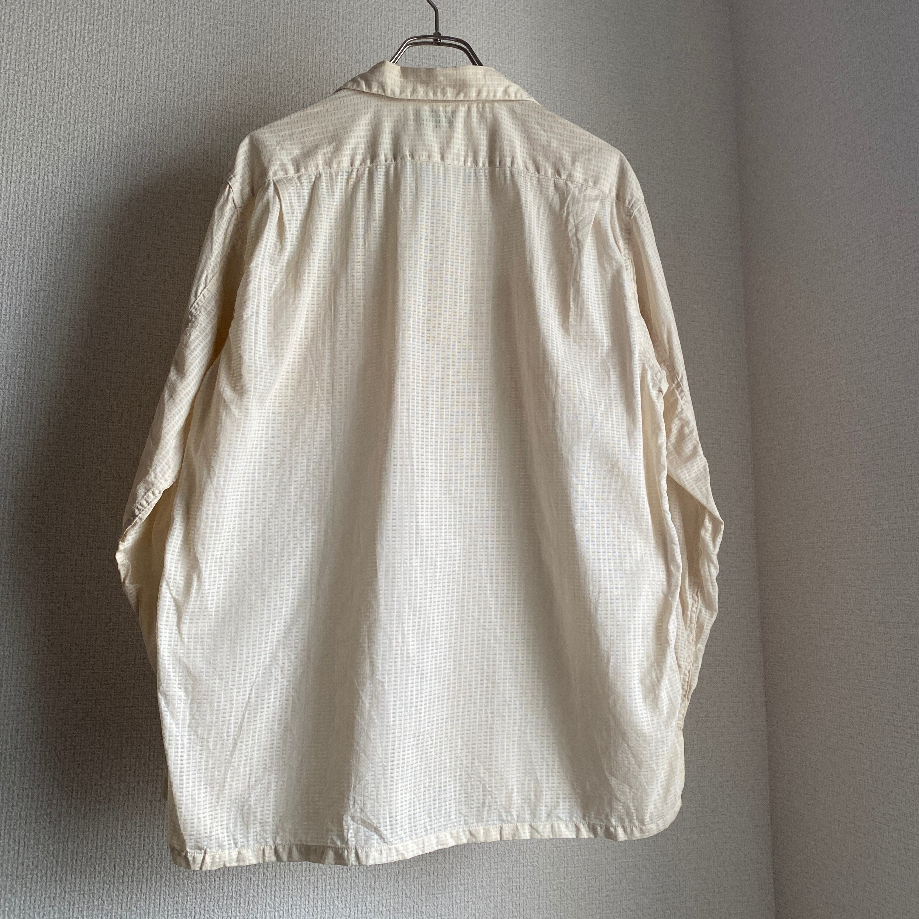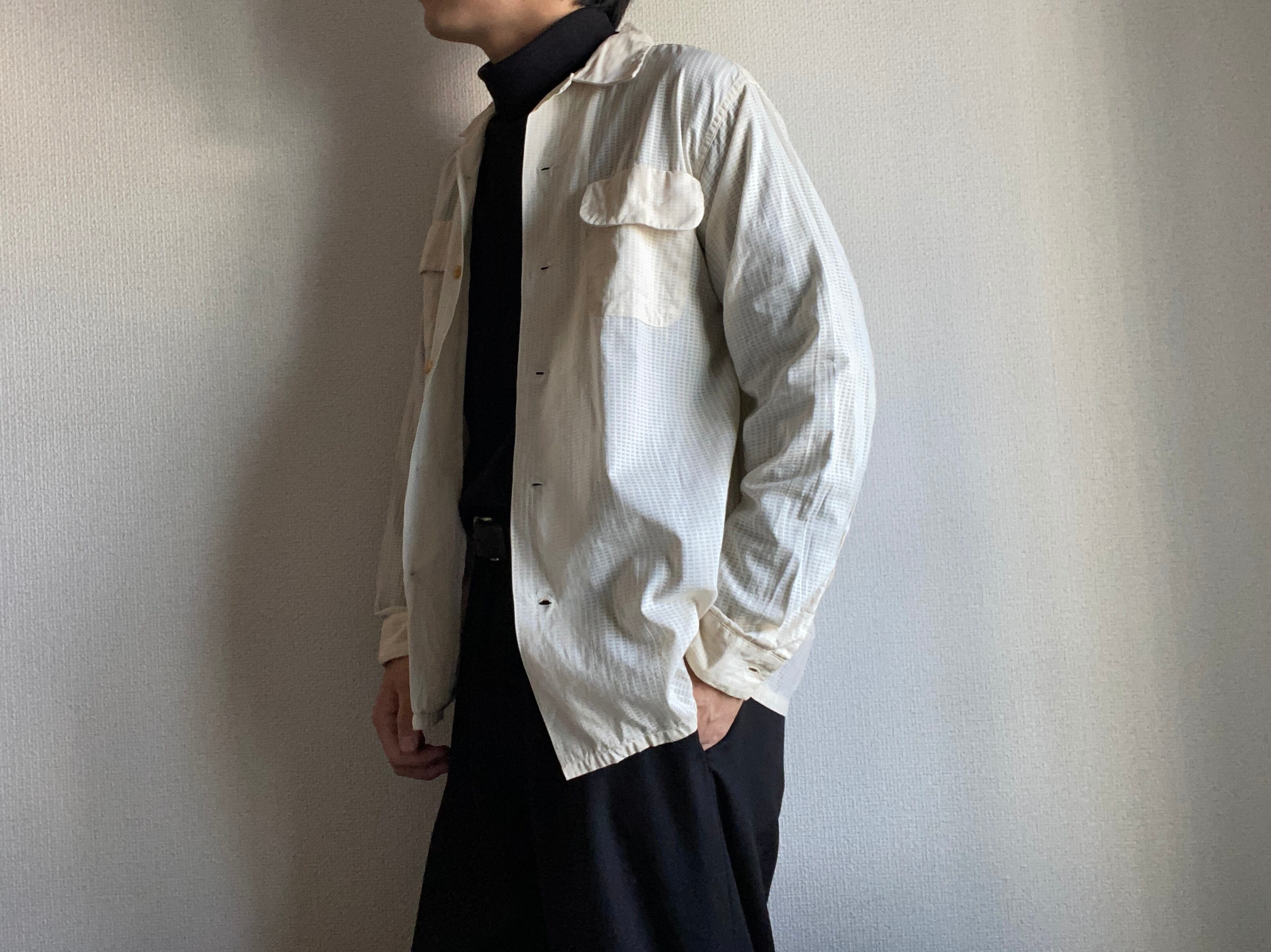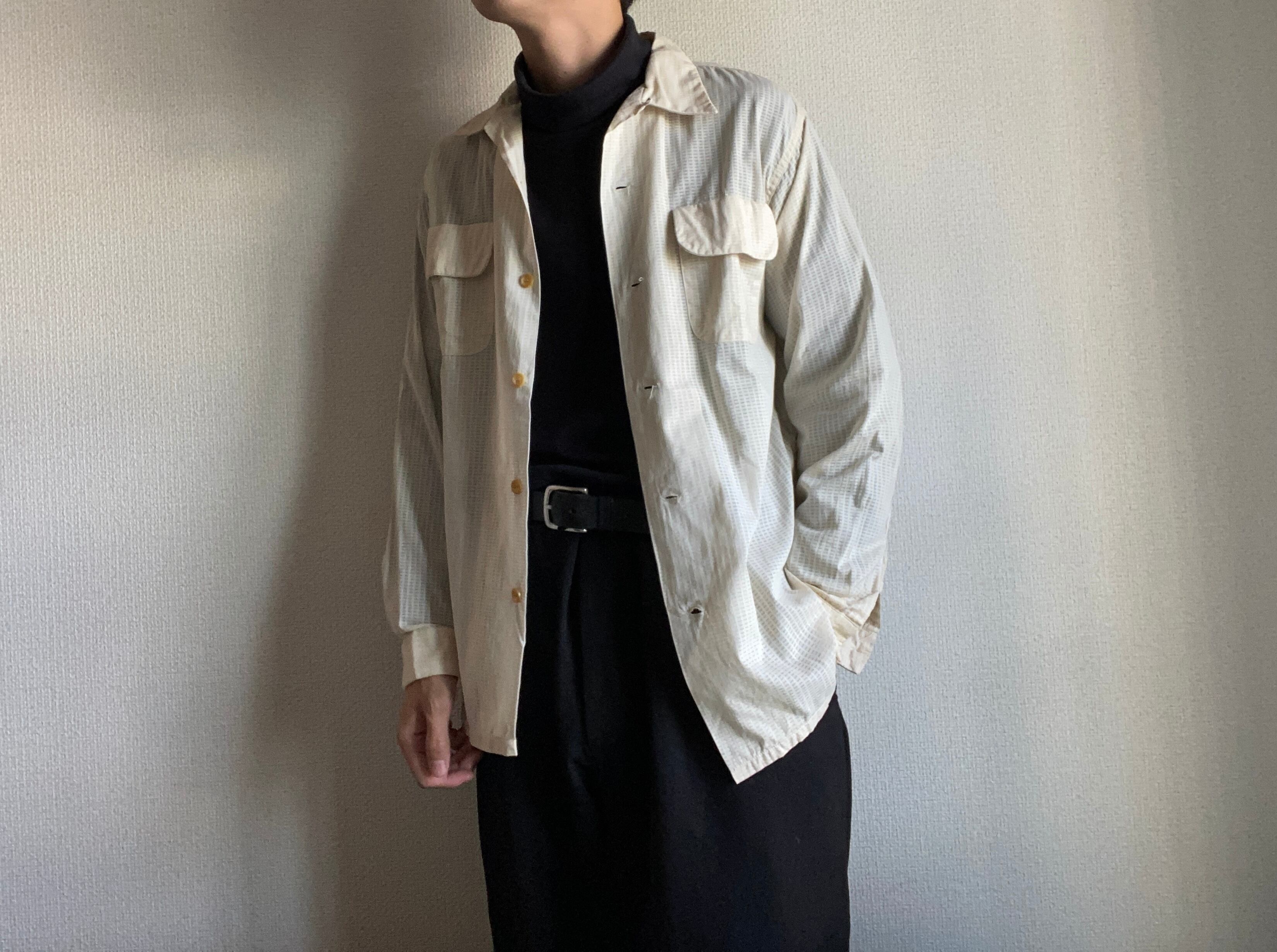 この年代では定番の、フラップポケット付きのボックスシルエットの開襟シャツですが、こちらはメッシュコットンのボディを使用した珍しい一着。