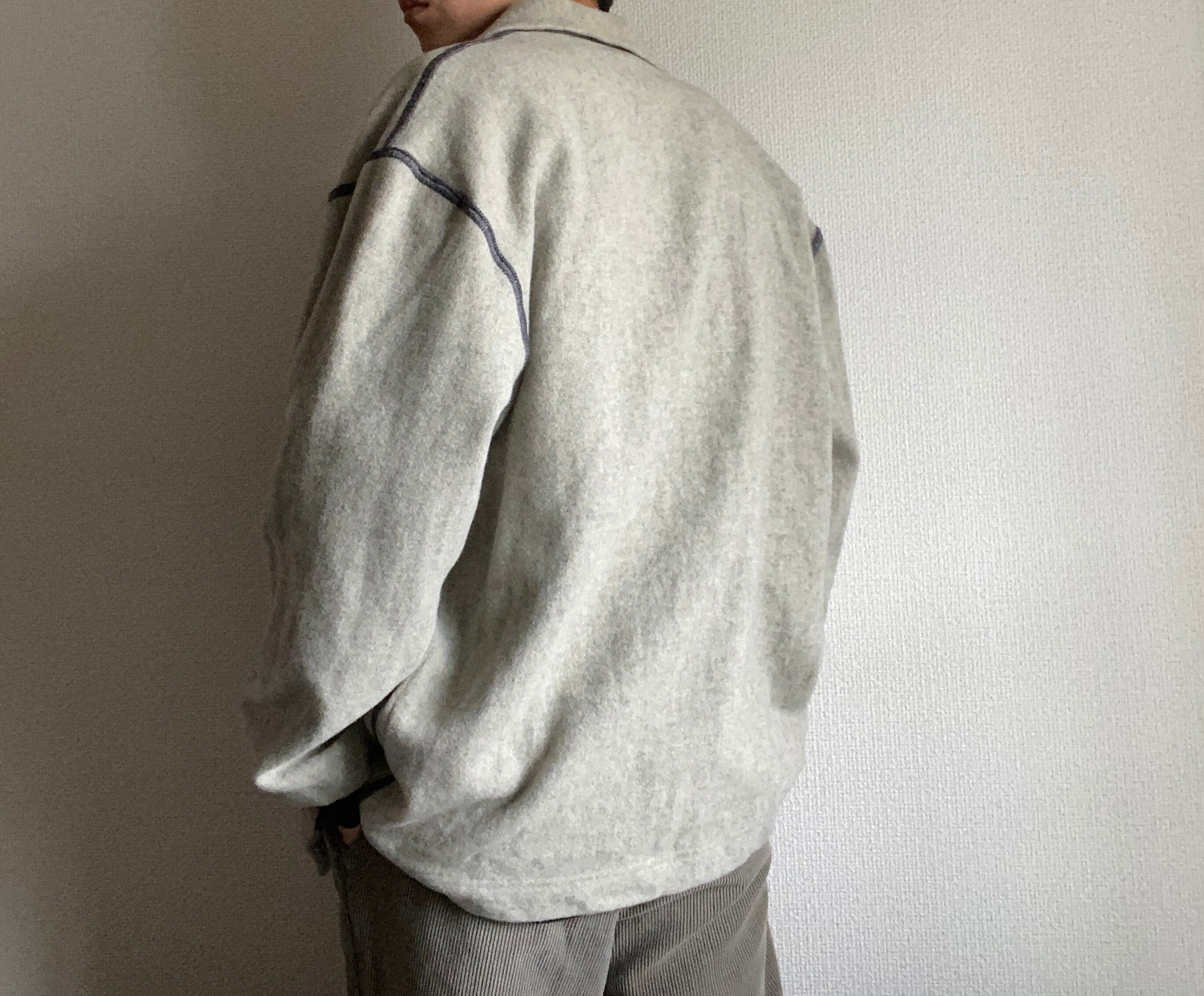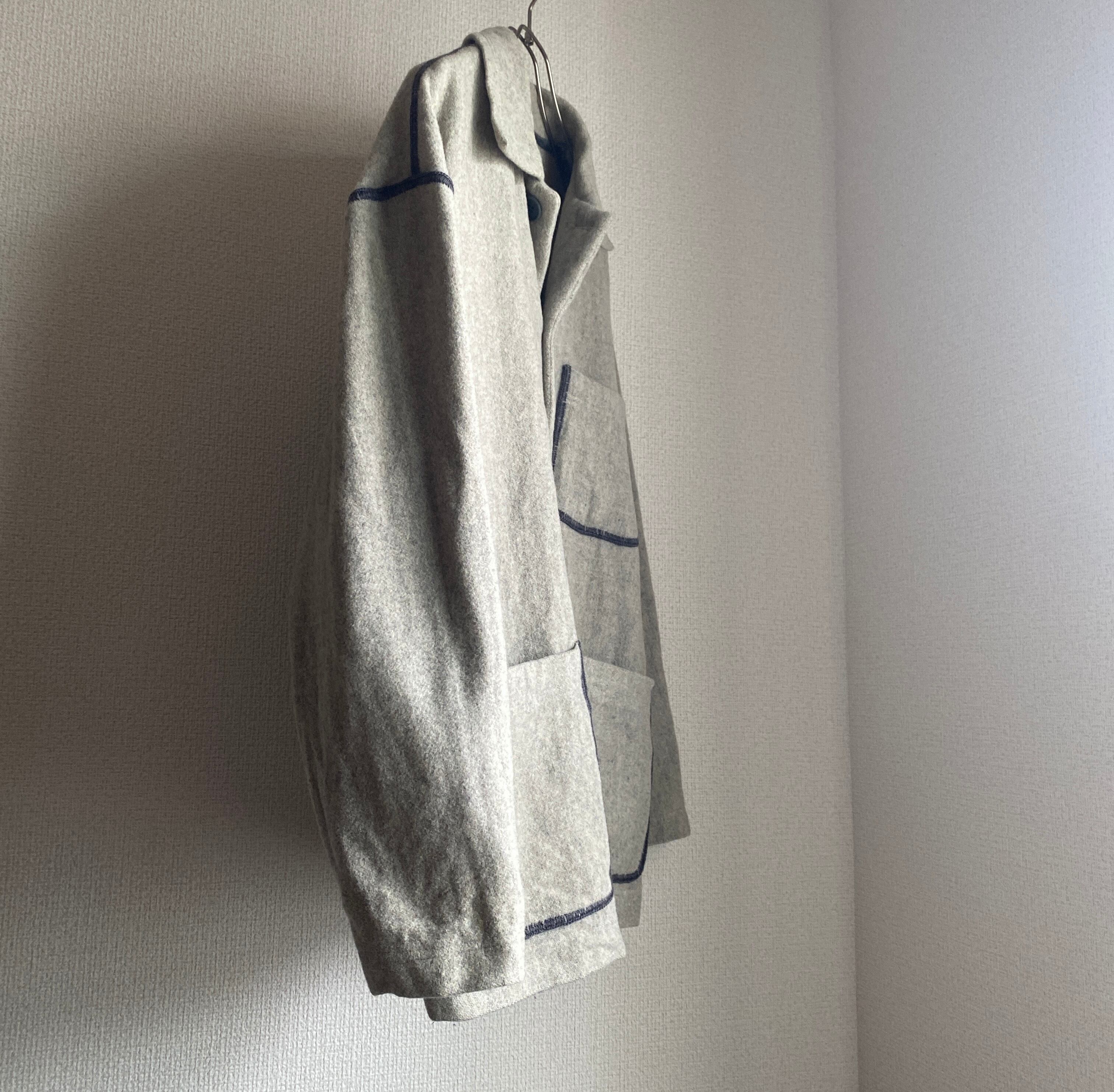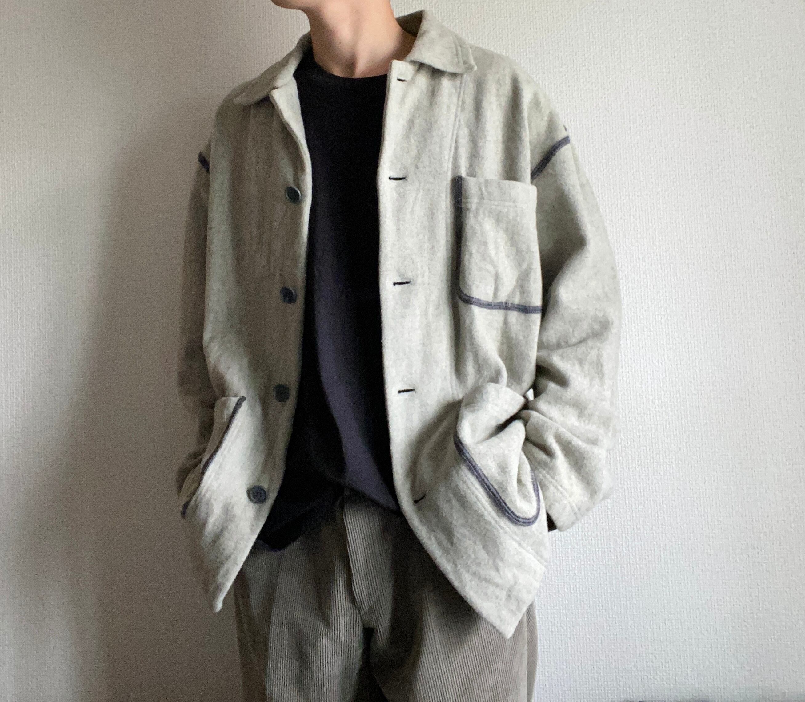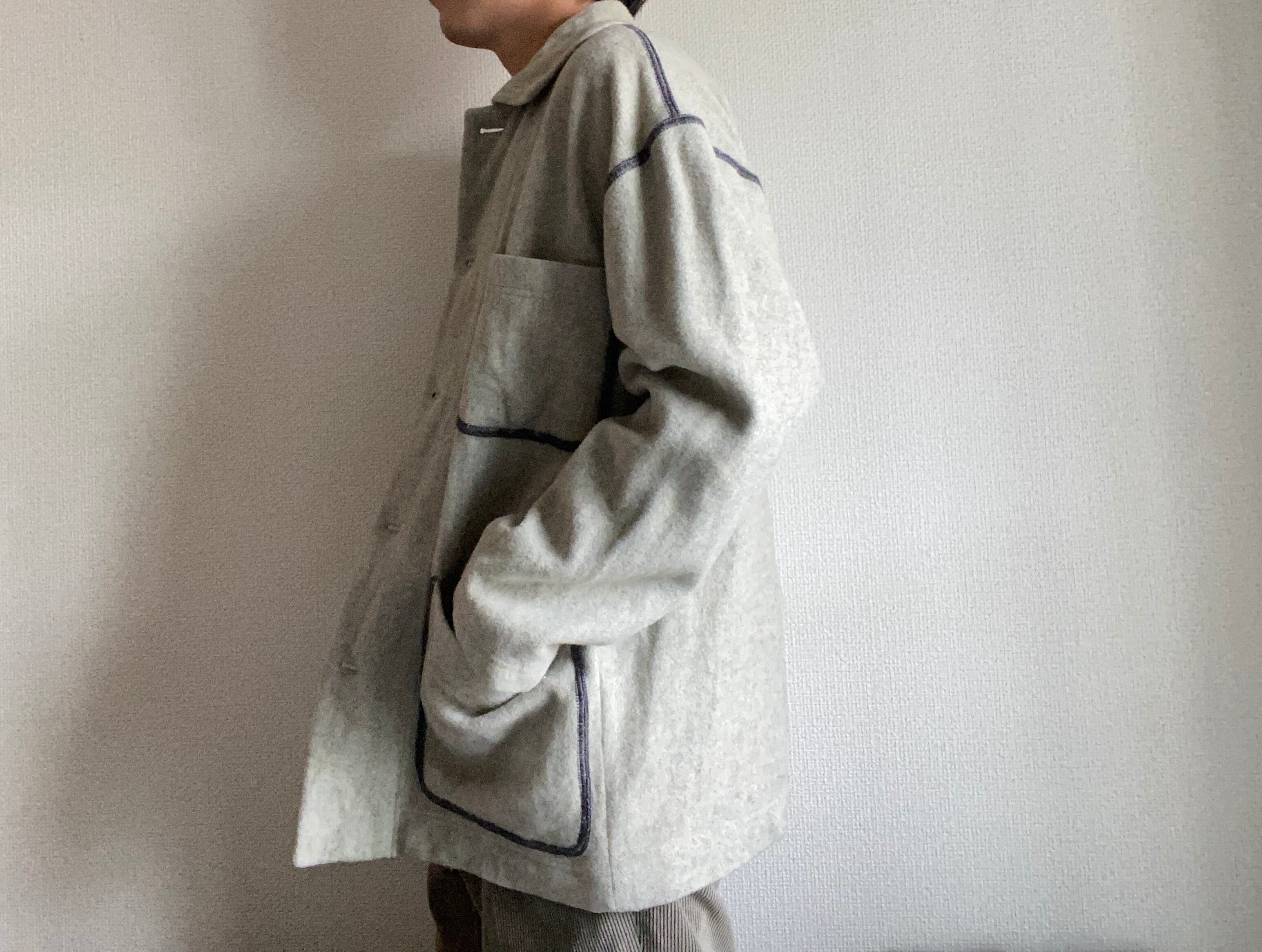 淡いグレーベージュ系の絶妙な色目に、柔らかなメルトン質感、ステッチ部分のアクセントや今風のルーズなシルエットが非常に素晴らしい一着。
