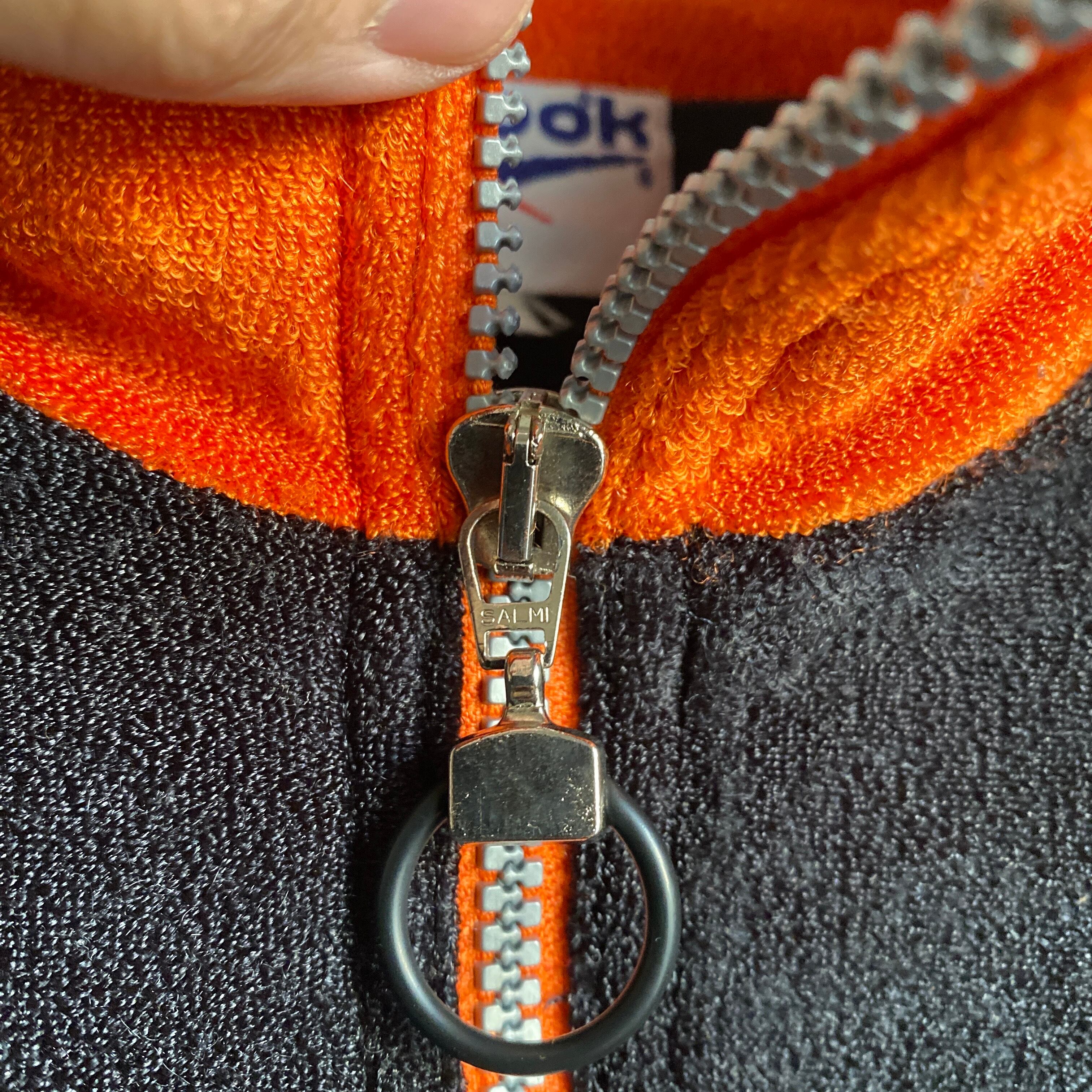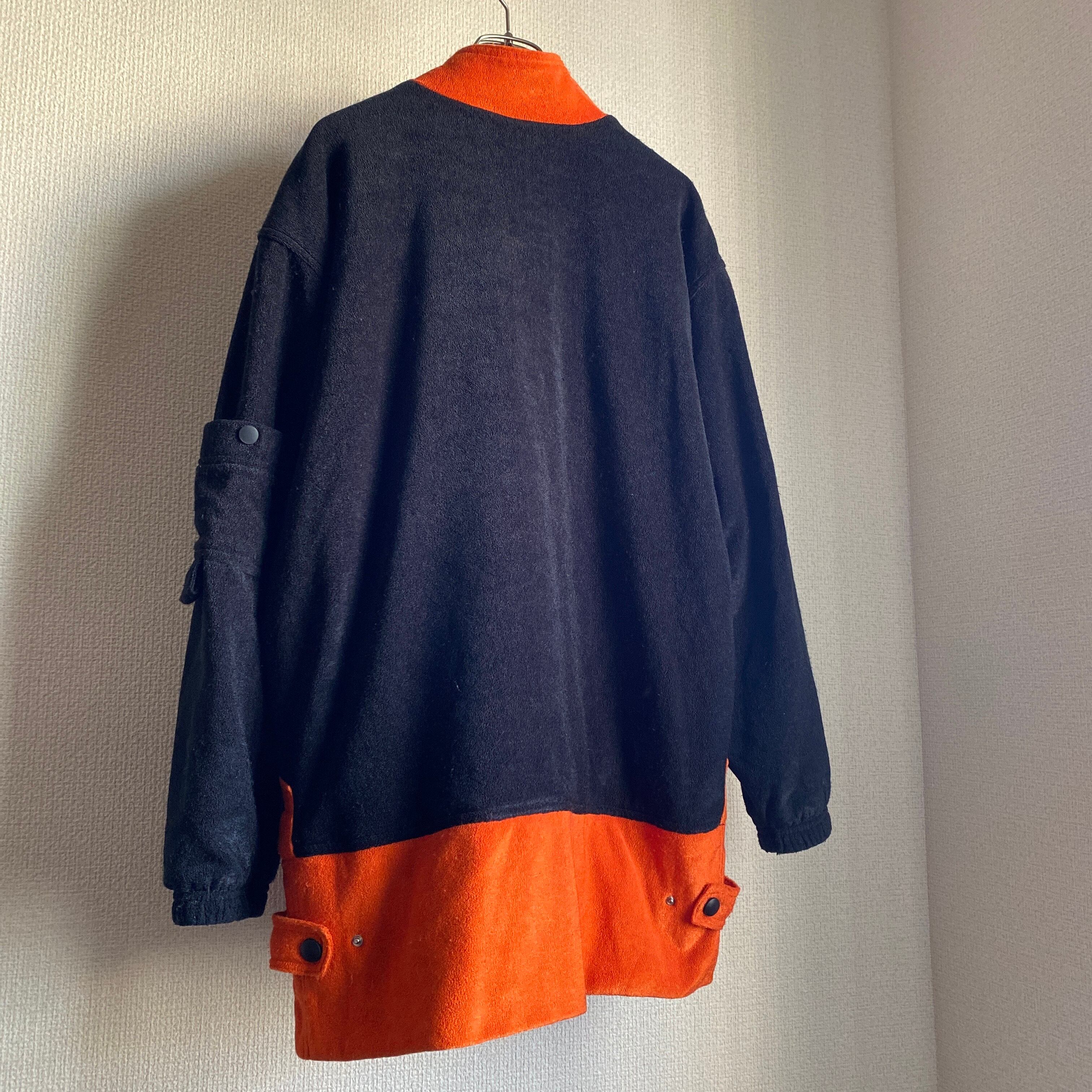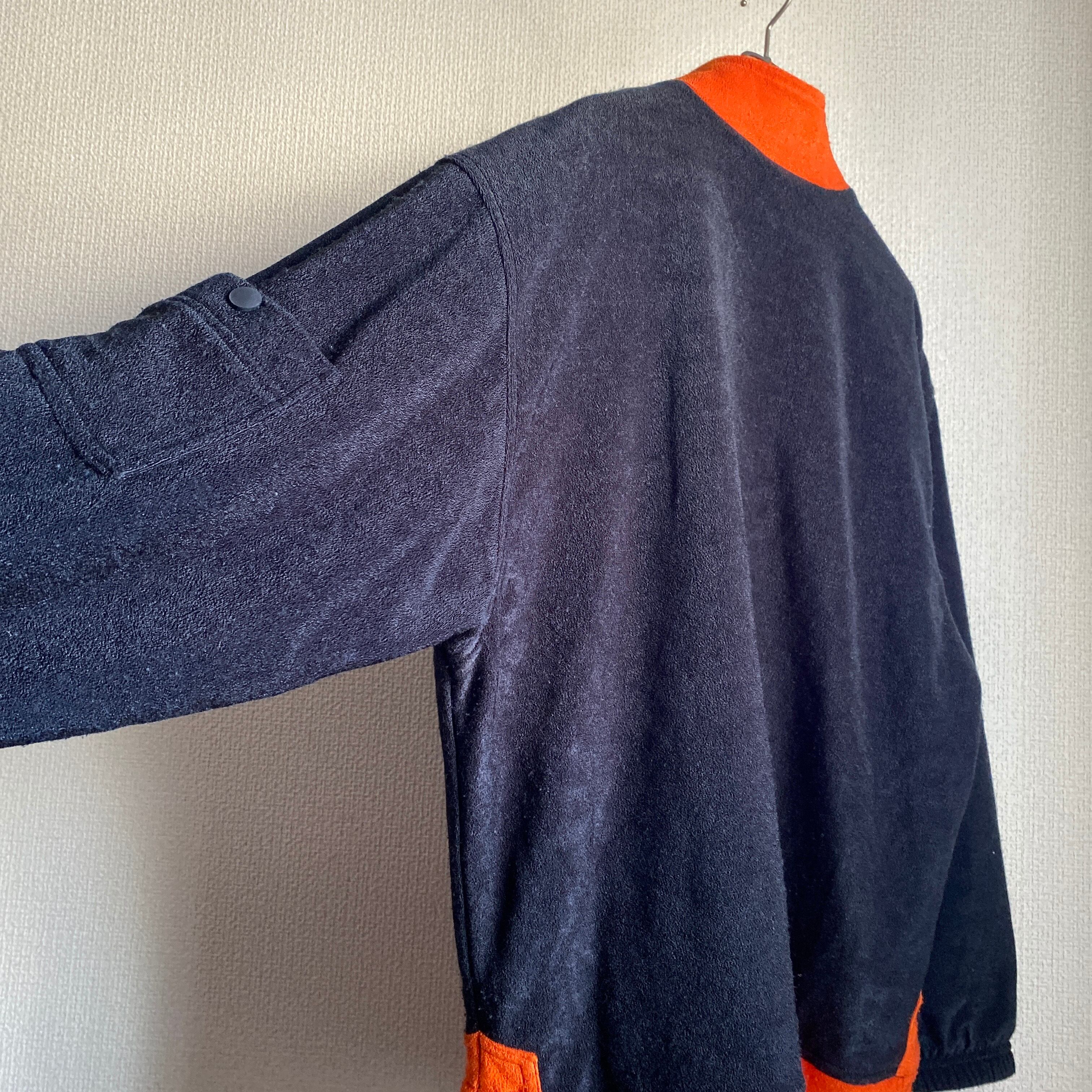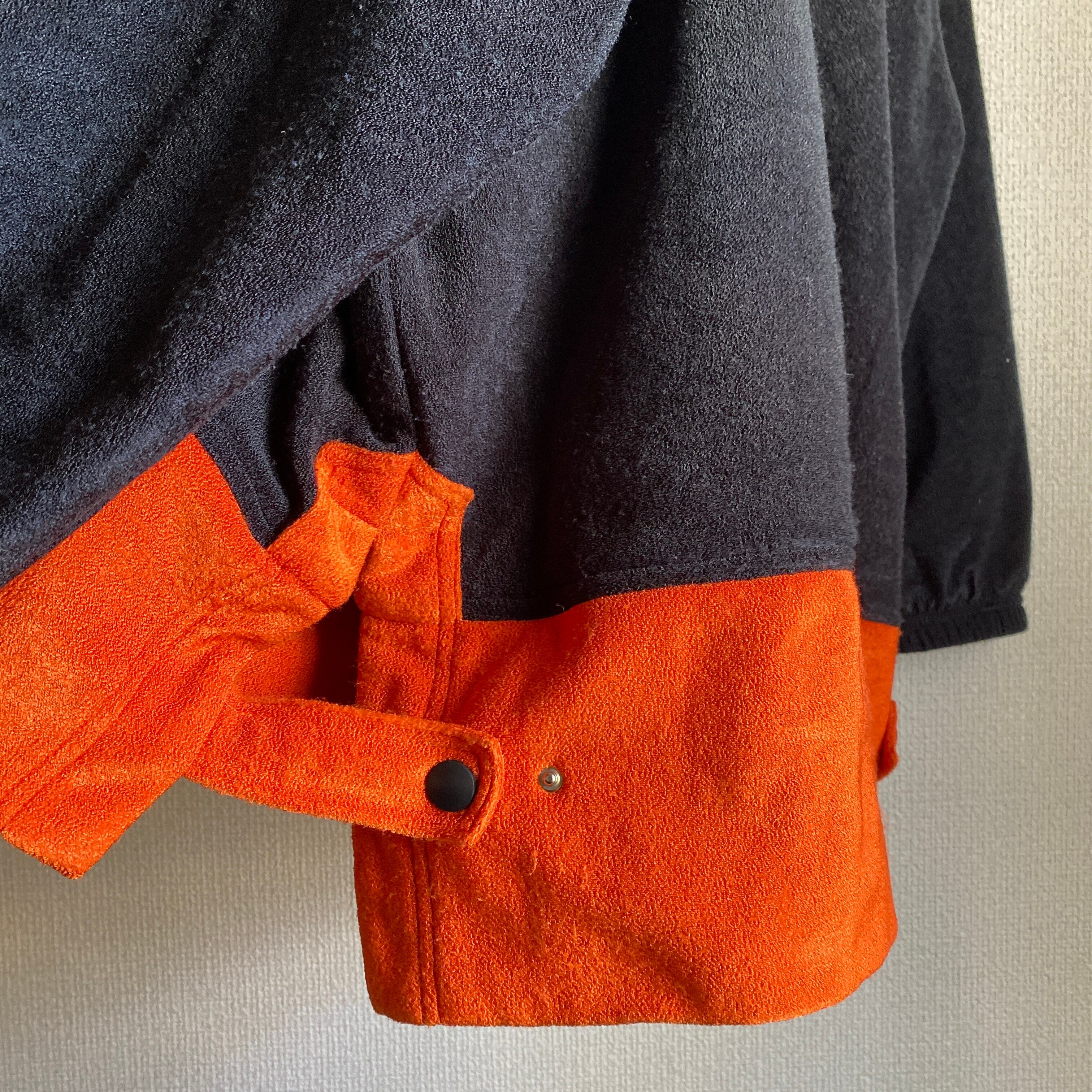 ブラックとオレンジのツートンカラーに、パイル編みの独特な素材感が目を惹く一着。