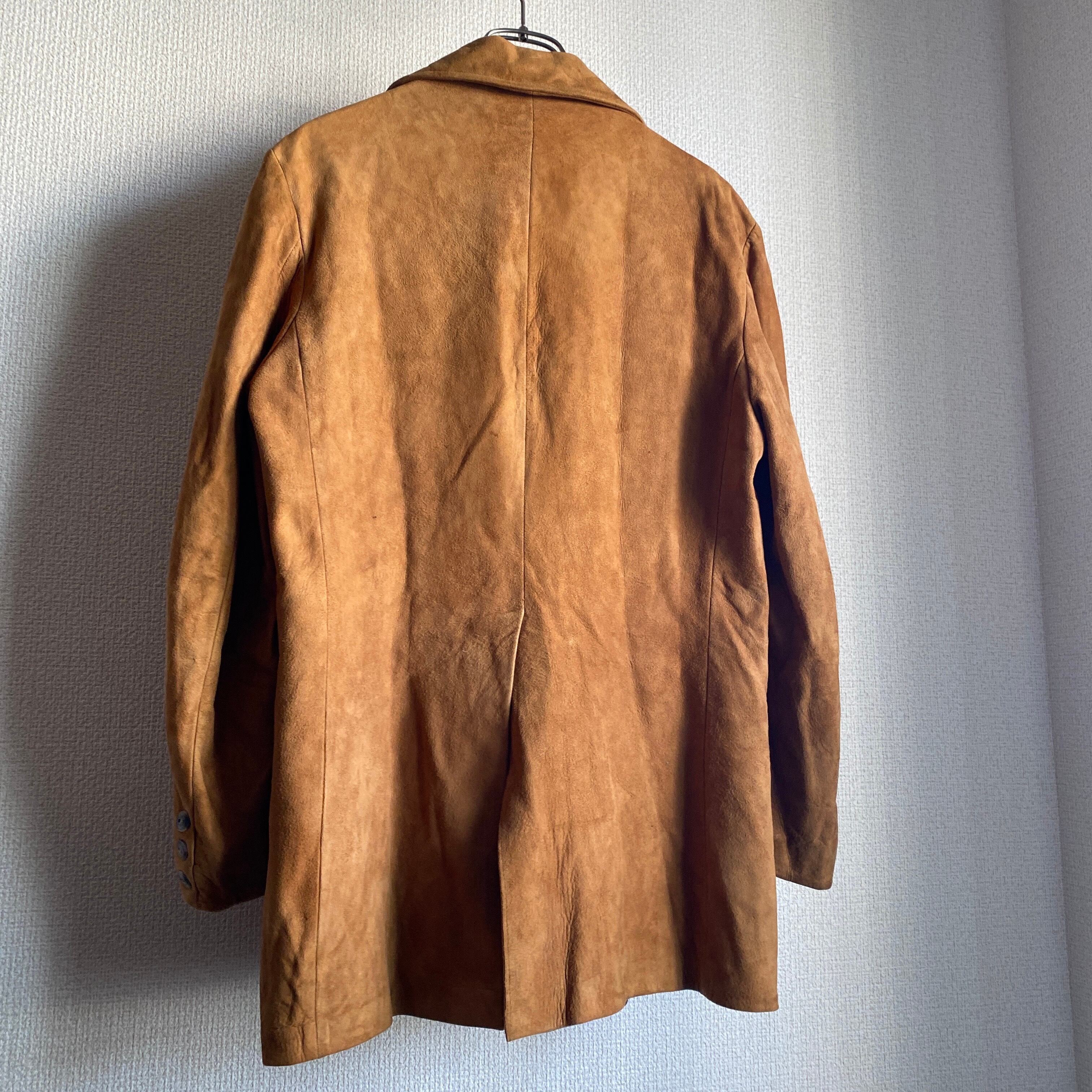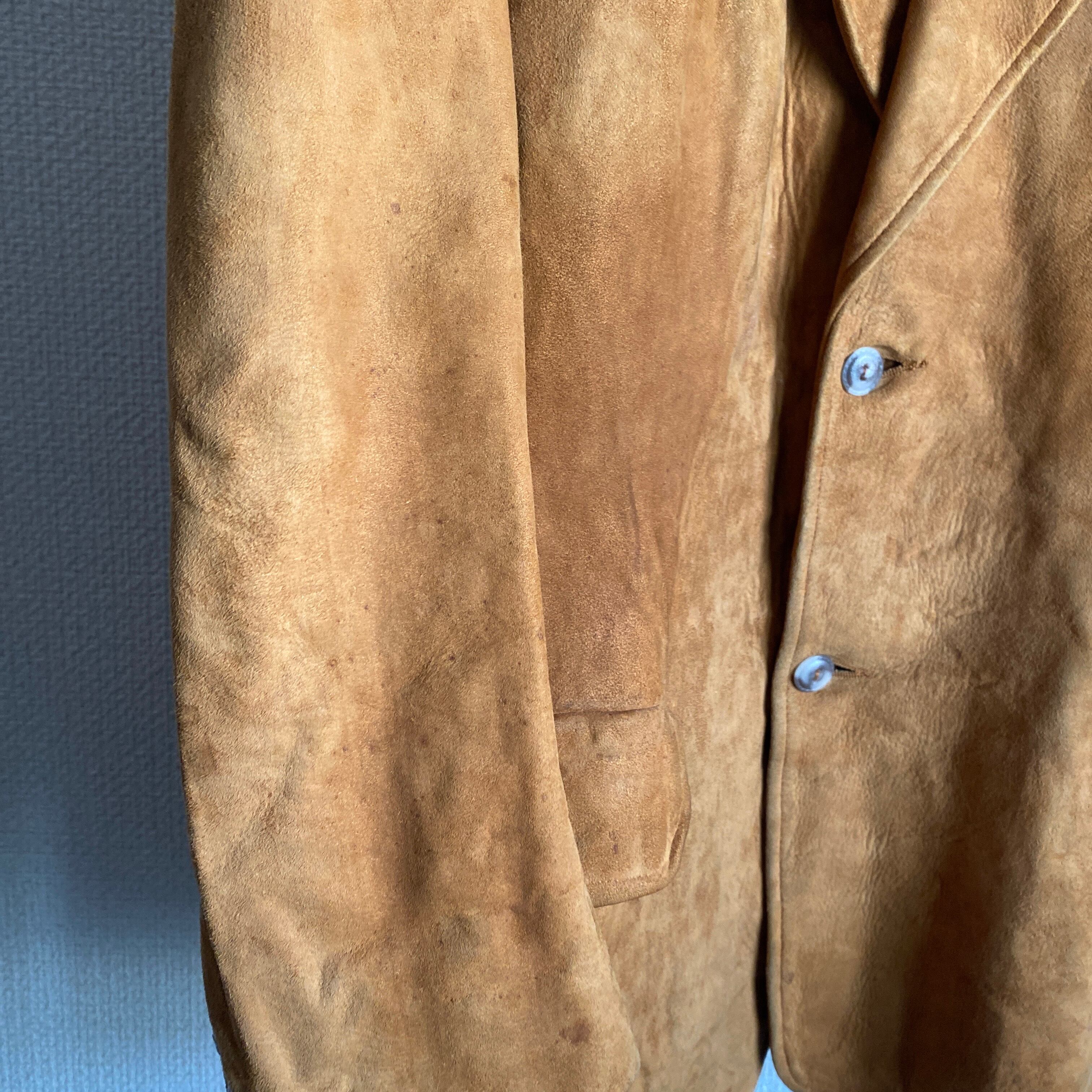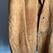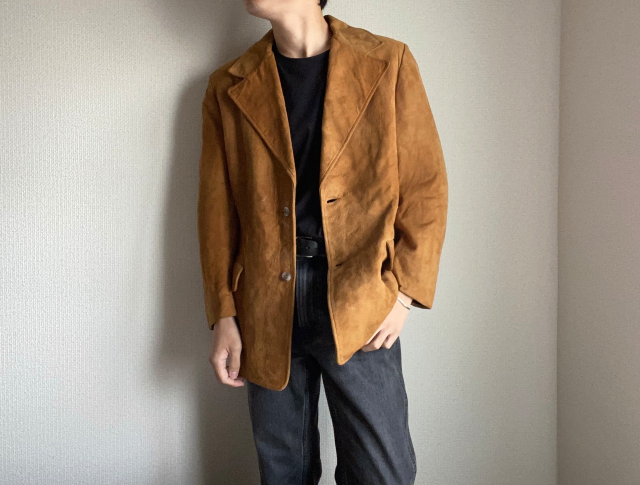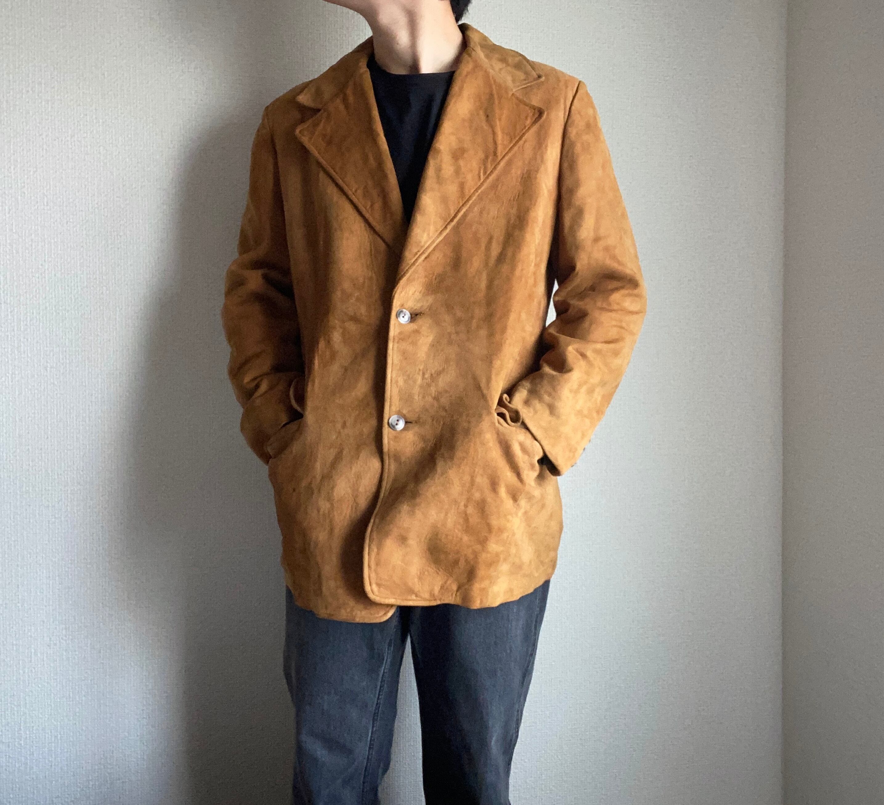 触った瞬間から上質だとわかるぐらい、肉厚でモチモチのスエード生地(おそらくディアスキン)に、大きめのラペルや程よくコンパクト目なサイズ感が非常に素晴らしい一着。