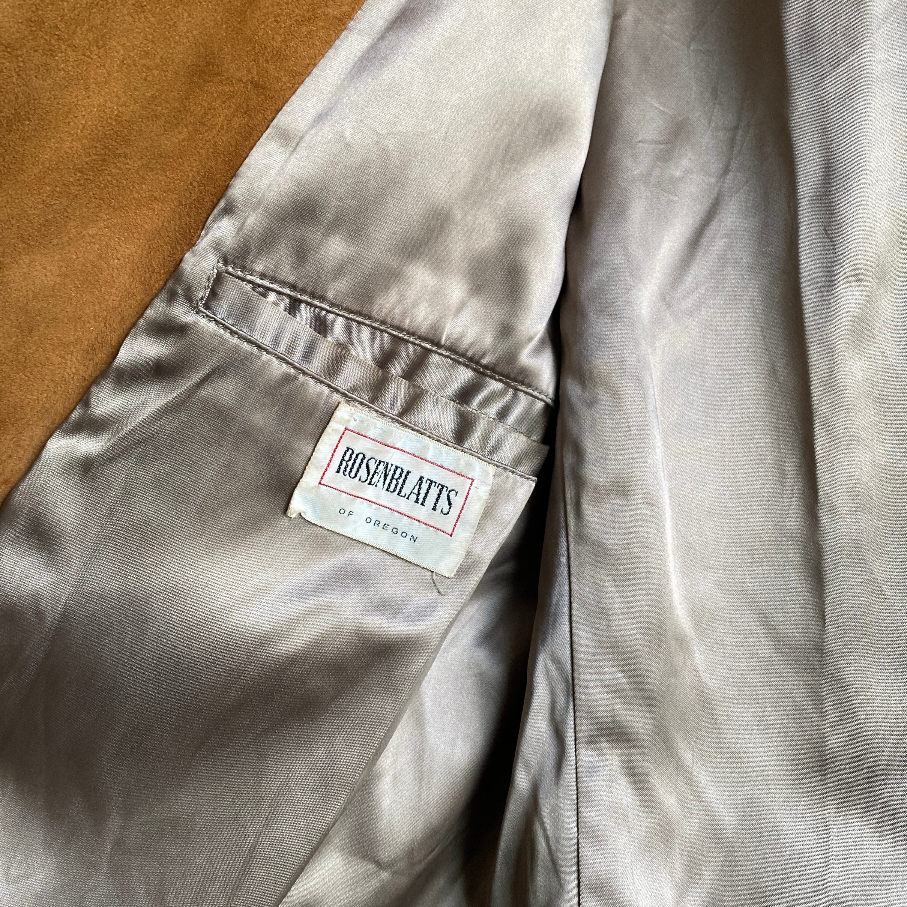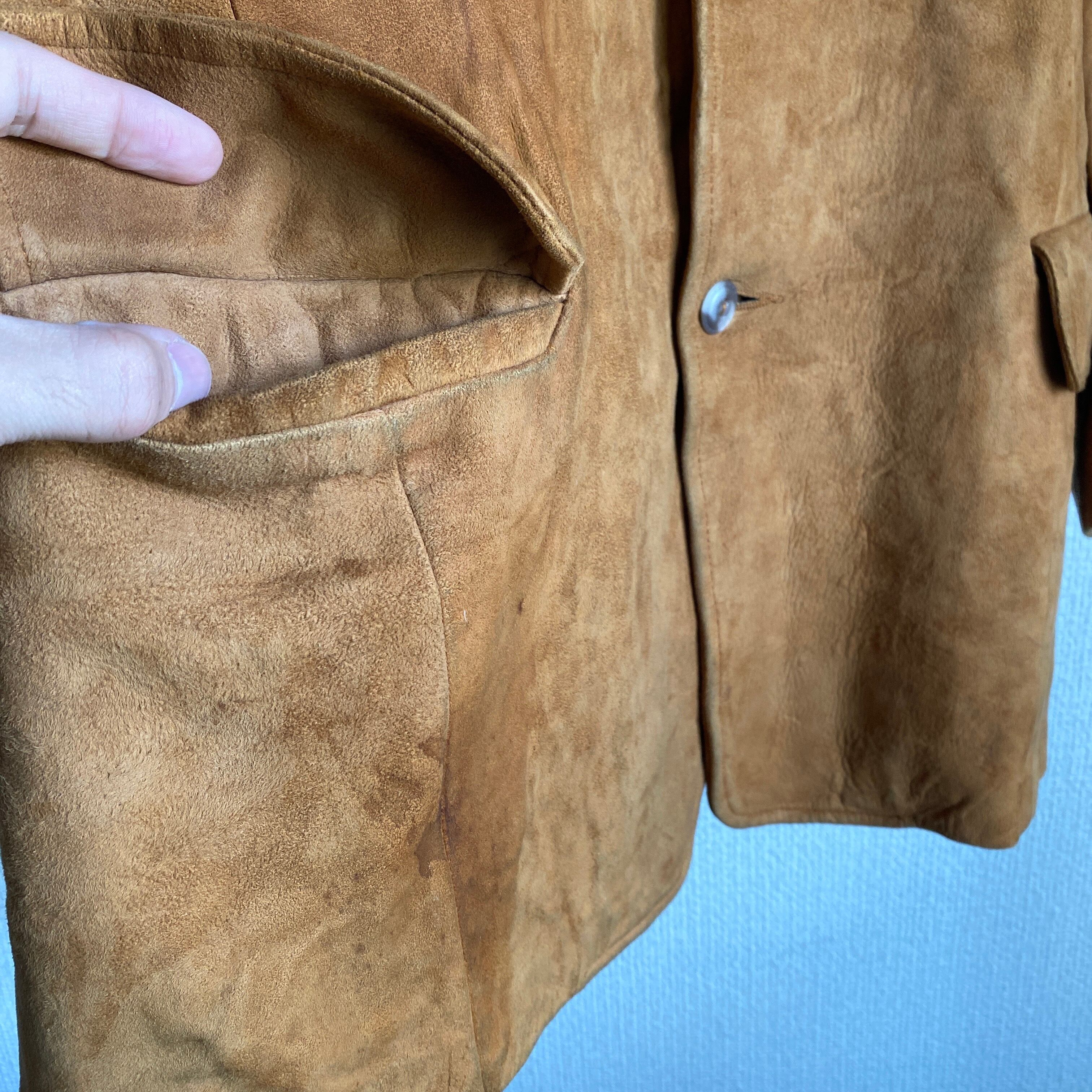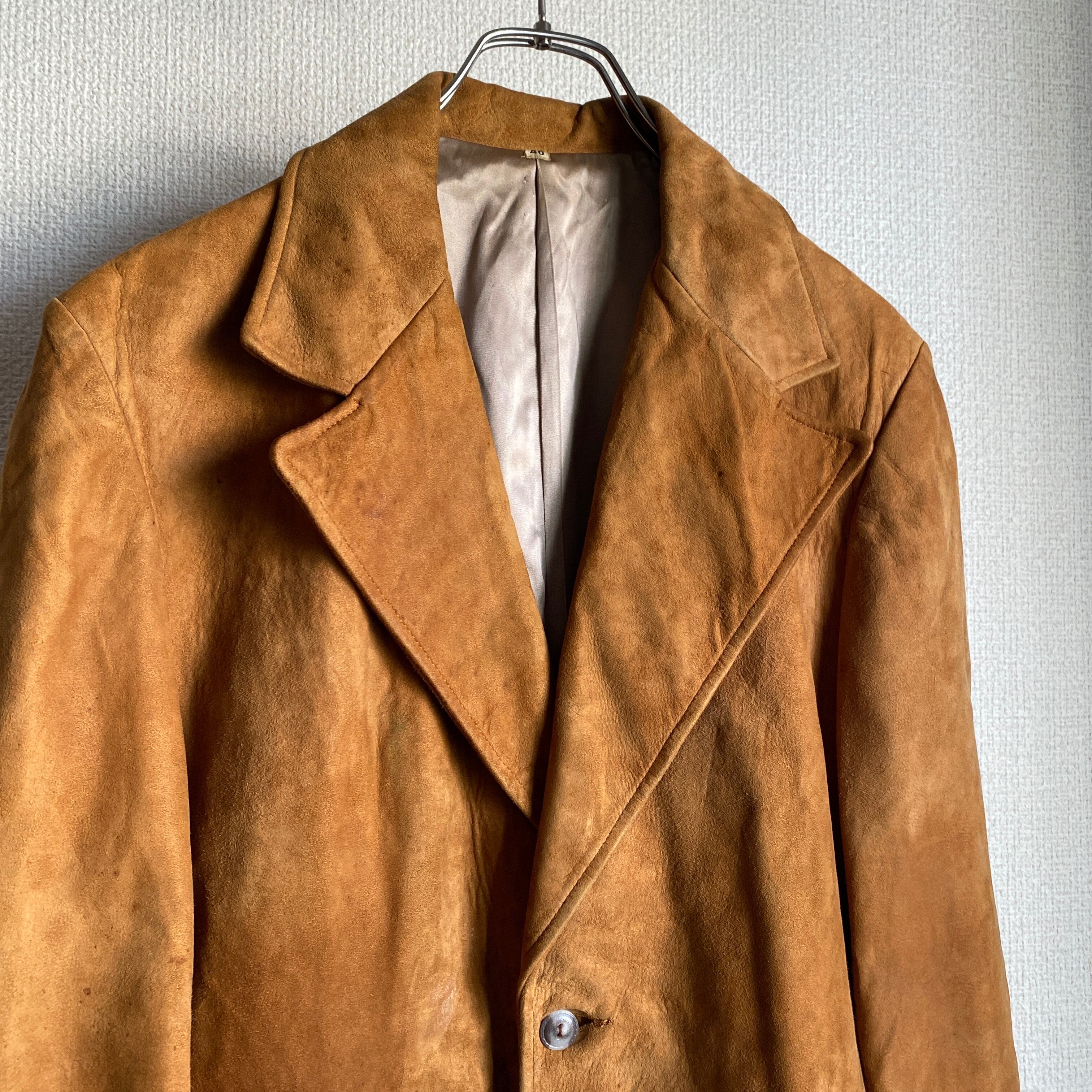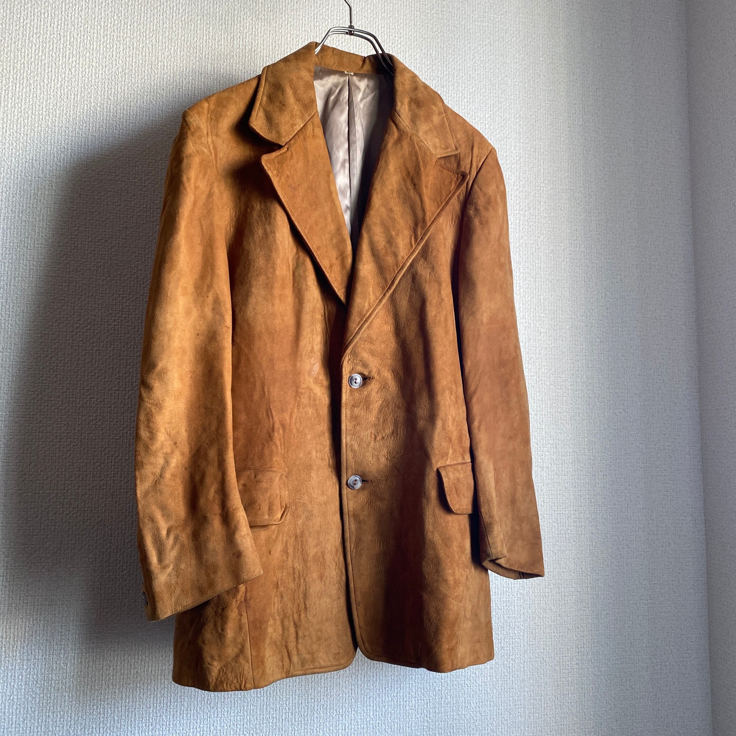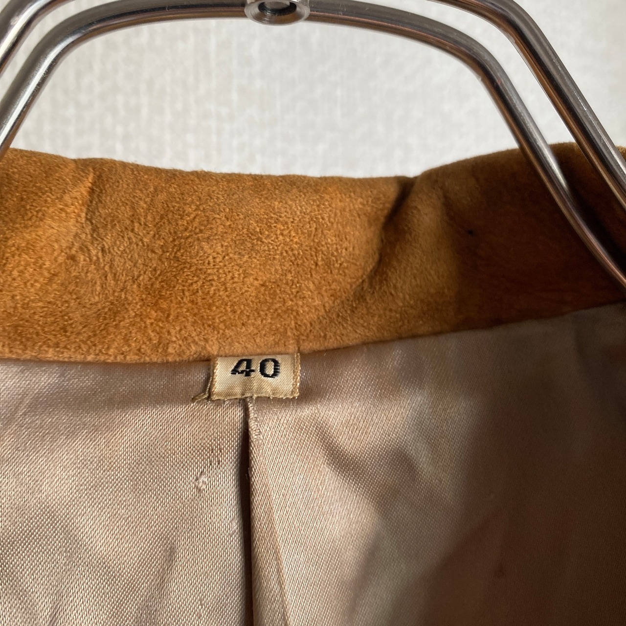 触った瞬間から上質だとわかるぐらい、肉厚でモチモチのスエード生地(おそらくディアスキン)に、大きめのラペルや程よくコンパクト目なサイズ感が非常に素晴らしい一着。