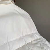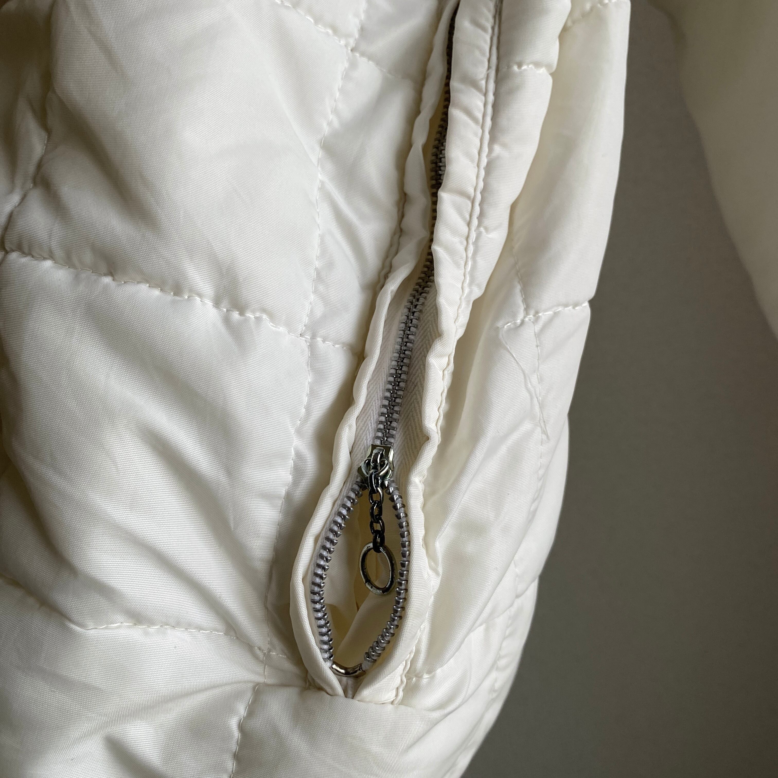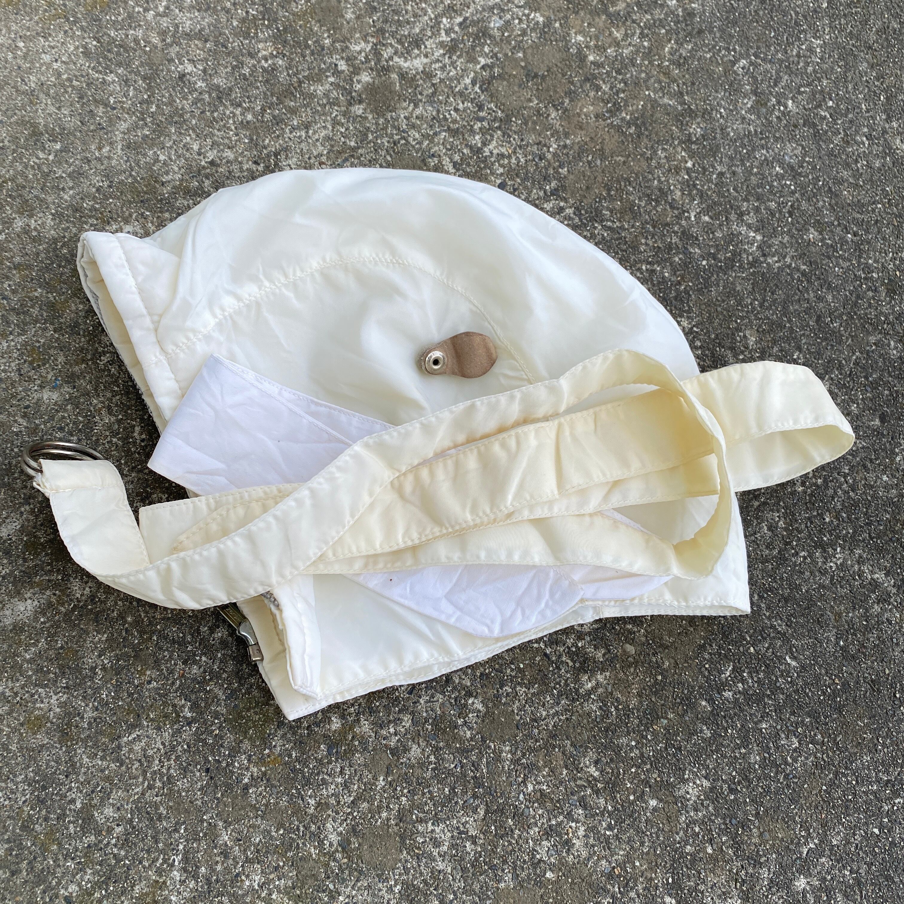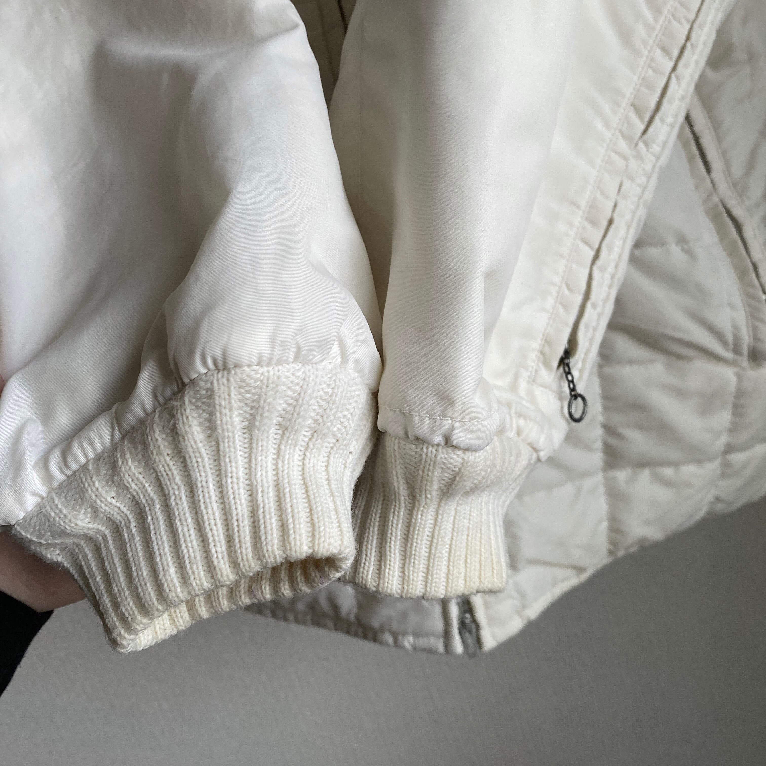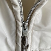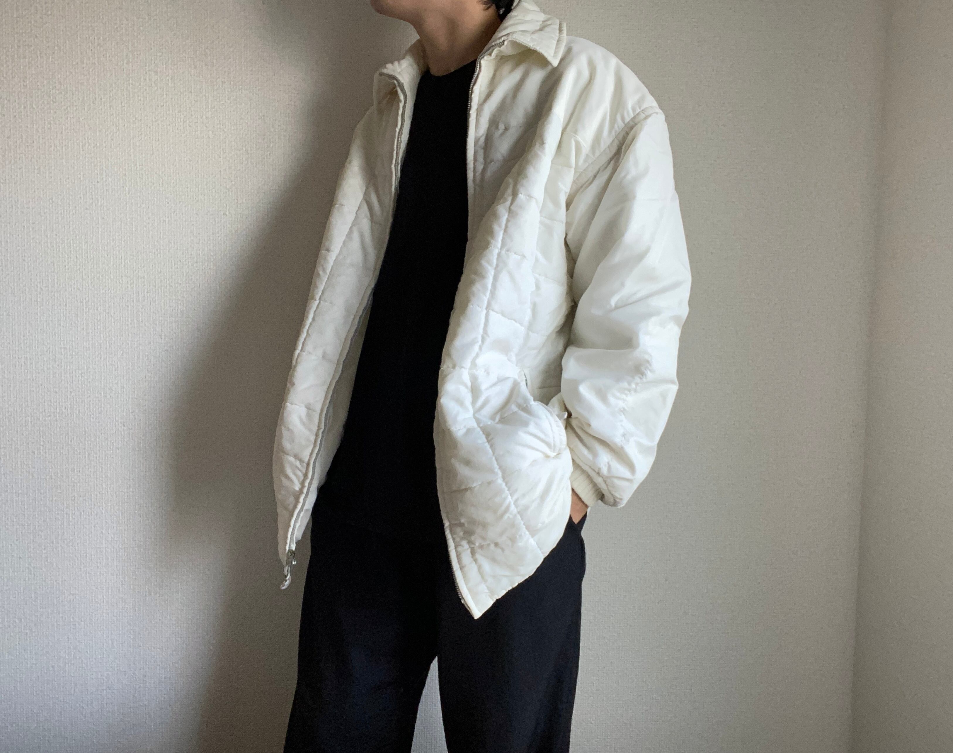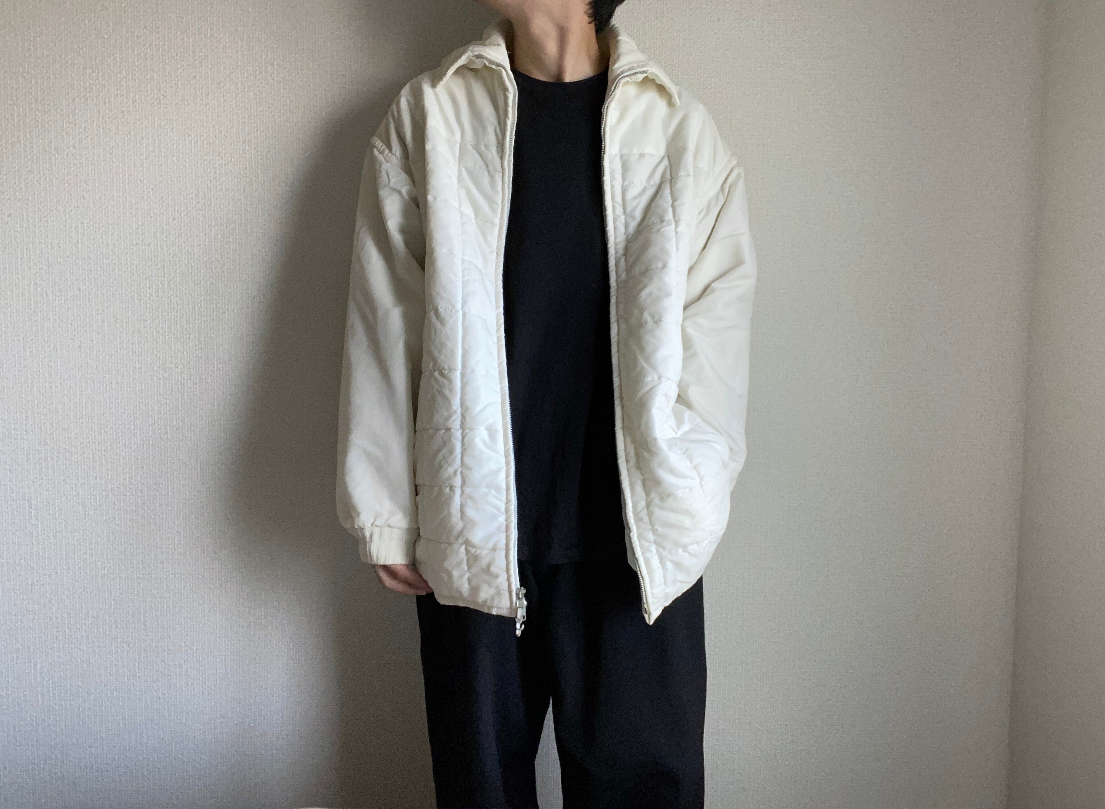 ホワイトのブルゾンというと、ややキザっぽいと言いますか、どことなく往年のお兄系みたいなイメージを持たれる方もいらっしゃるかもしれませんが、やや黄みがかった色目、ゆったりとしたシルエット、袖のリブ、そしてなにより無骨なアルミジッパーが一気にそれを解消してくれています。