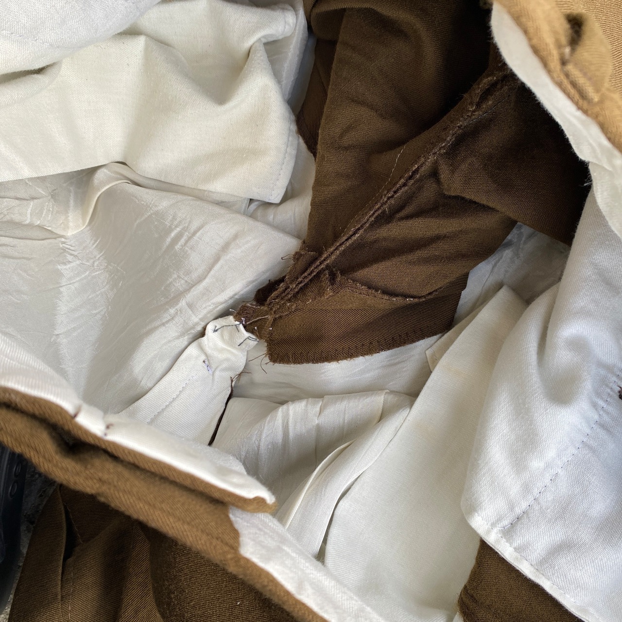 ウエスト、ワタリ付近のゆとりのあるパターン、生地のとろみから生まれる歩いた時のドレープ、美しいブラウン系の色目は本当に素晴らしいです。