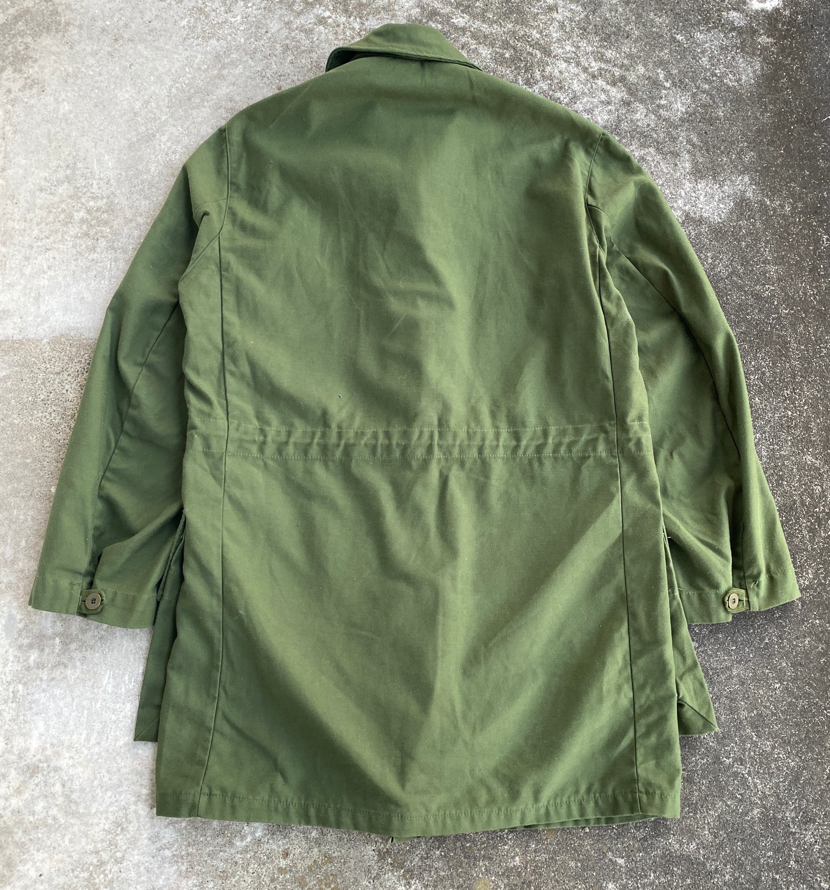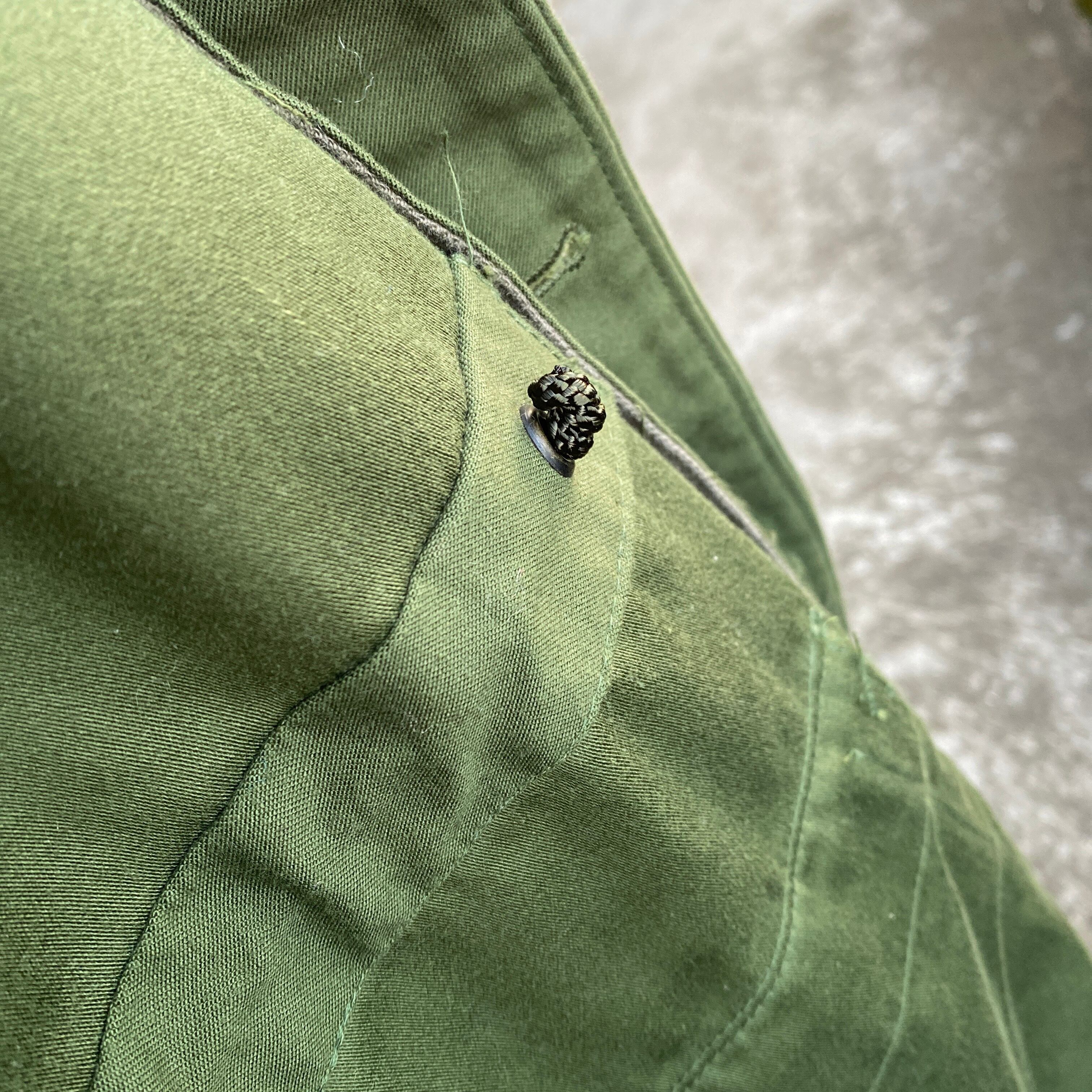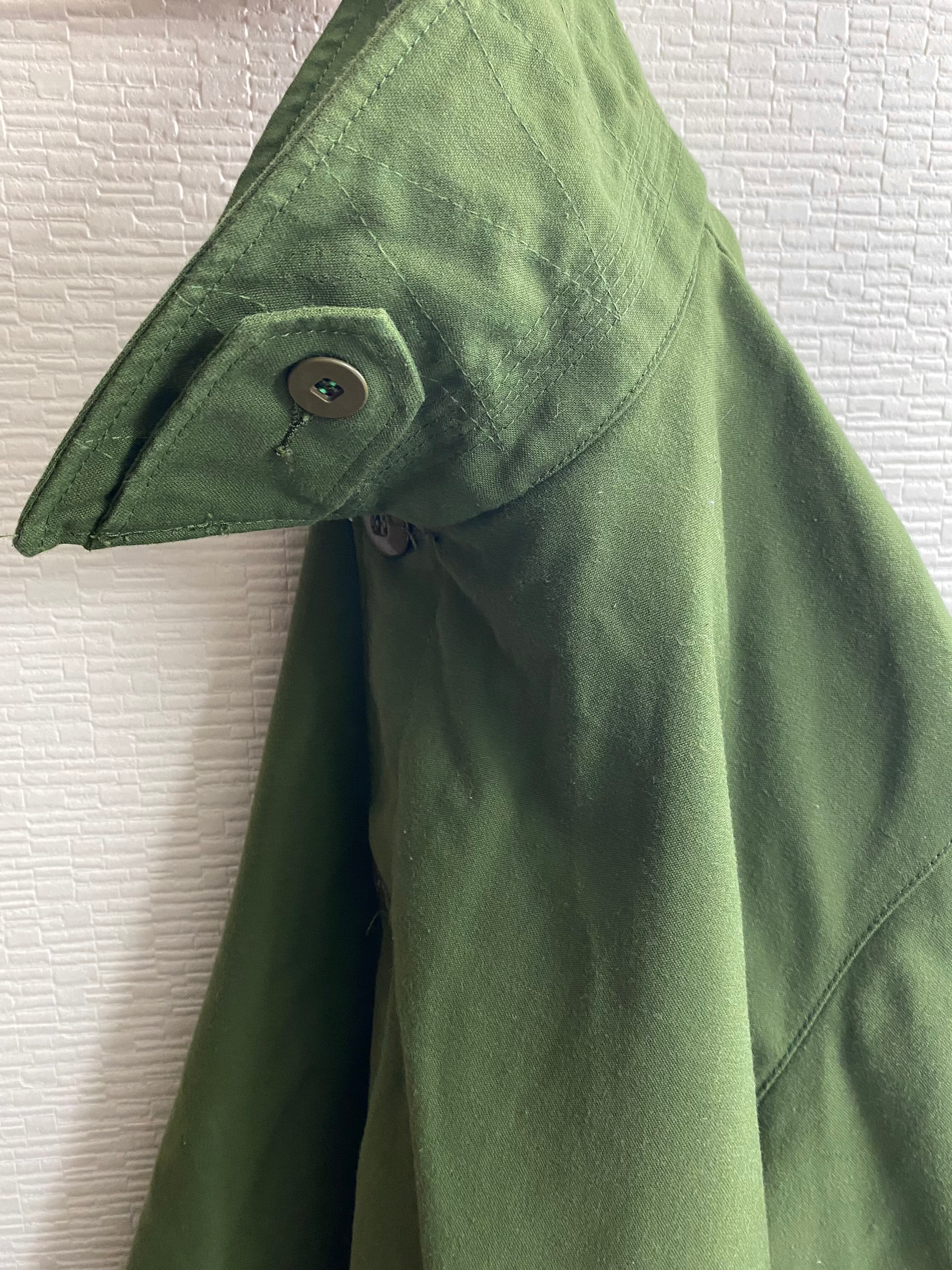 比較的近代ものではありますが、高密度に織られた程よい厚みのコットンボディに、程よくAライン気味な綺麗なシルエットはとても格好良く、色目もキツさのないナチュラルなオリーブカラーなので何でも合わせやすく重宝します。