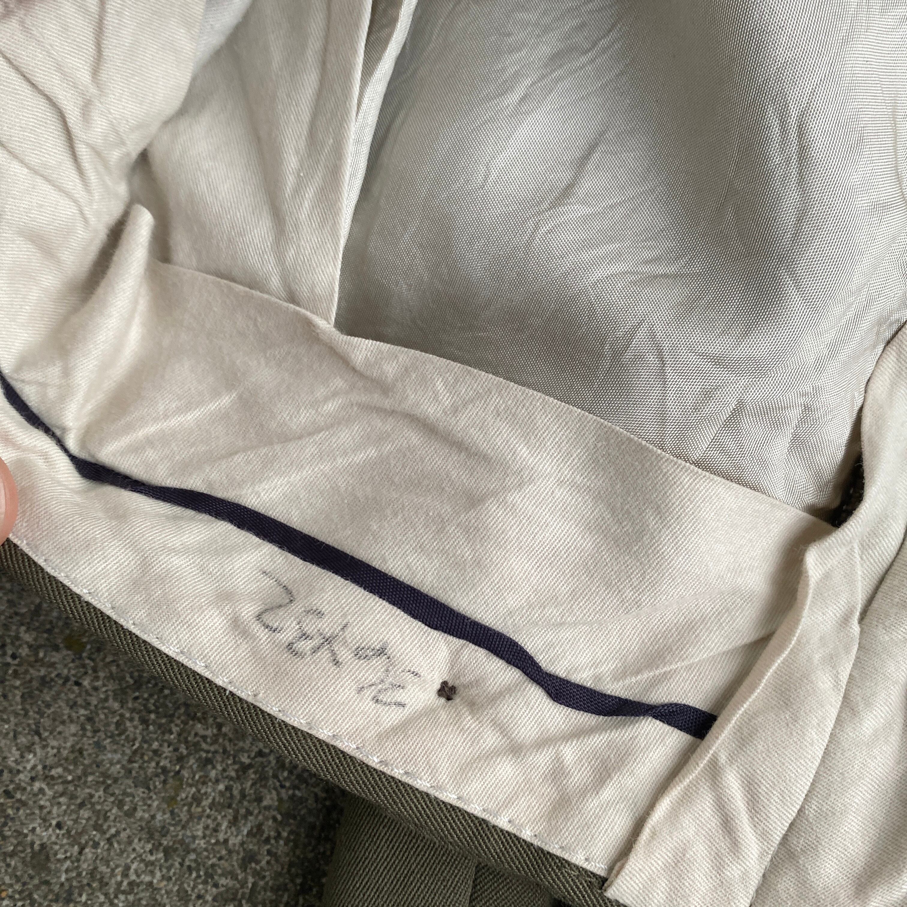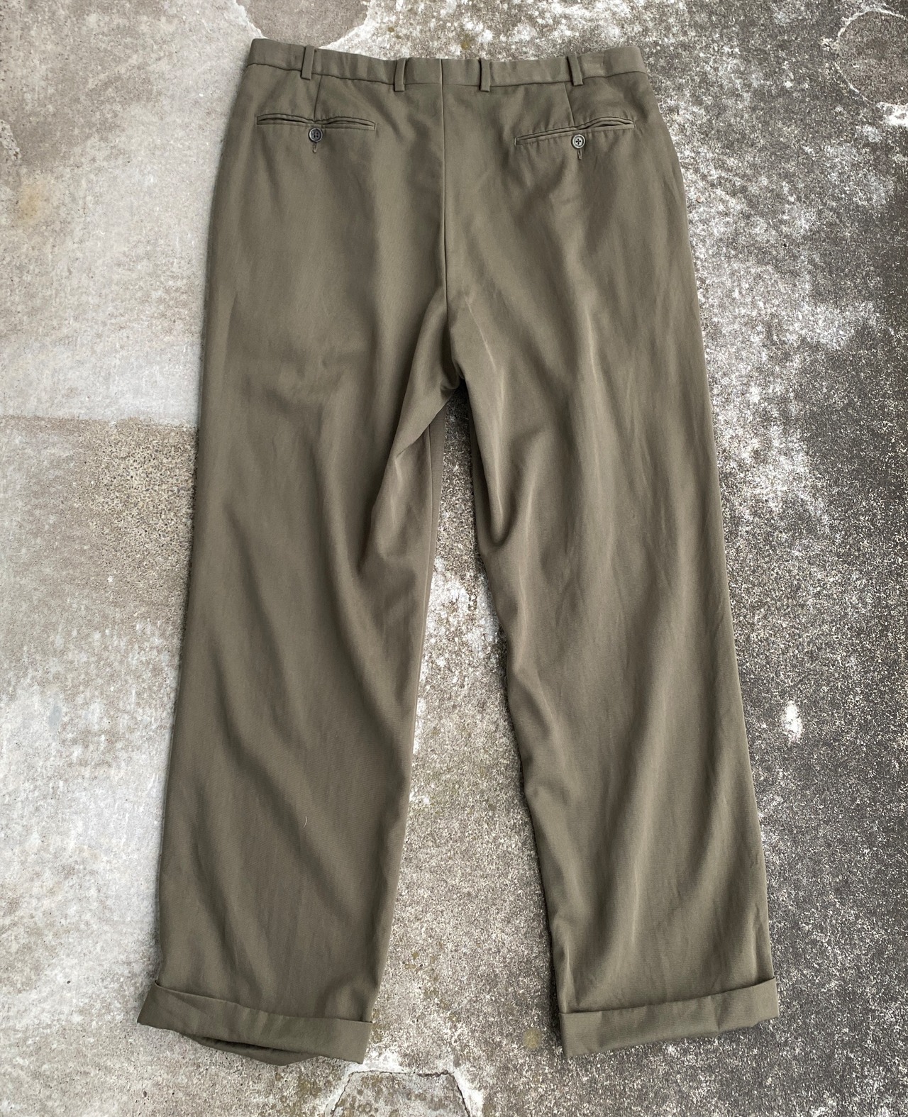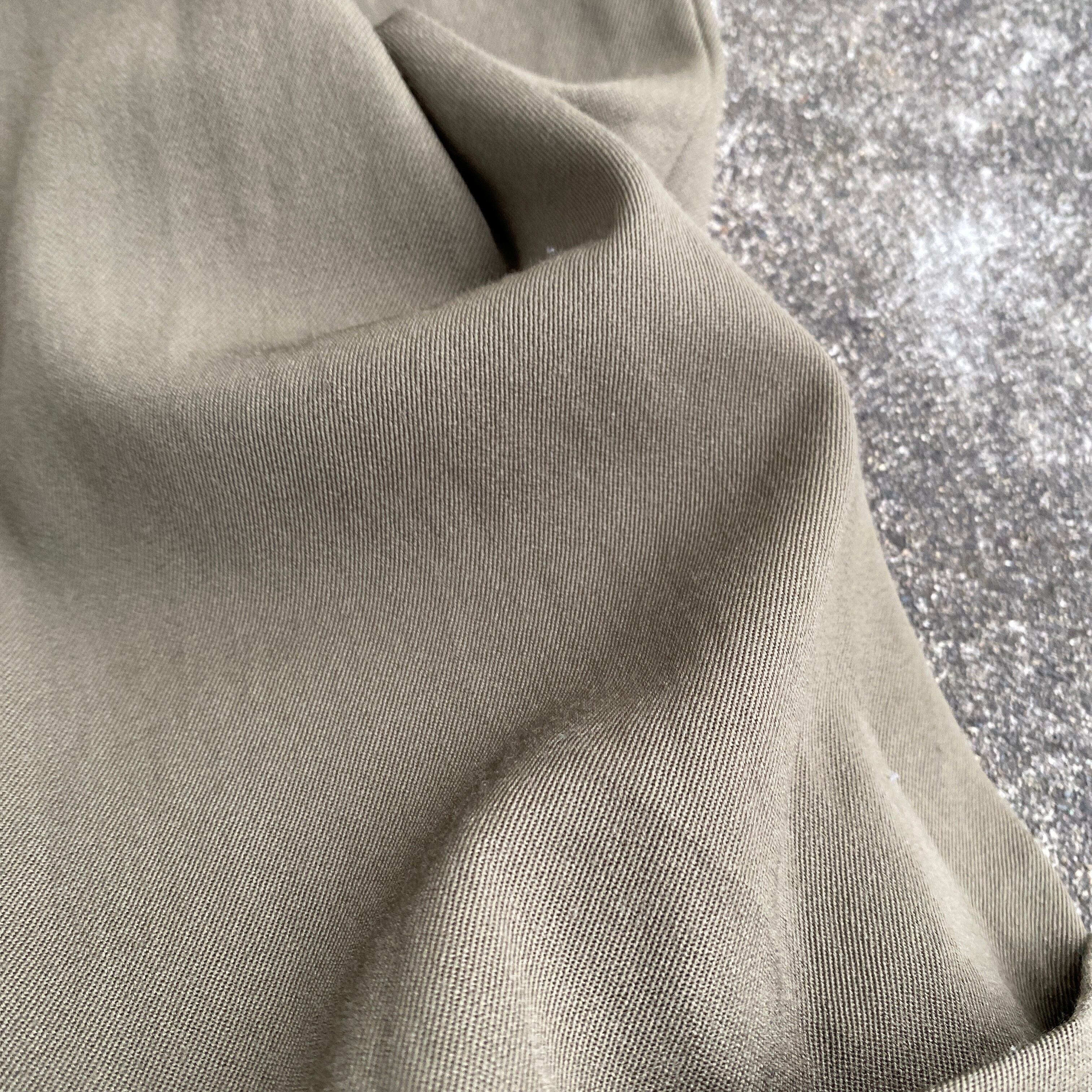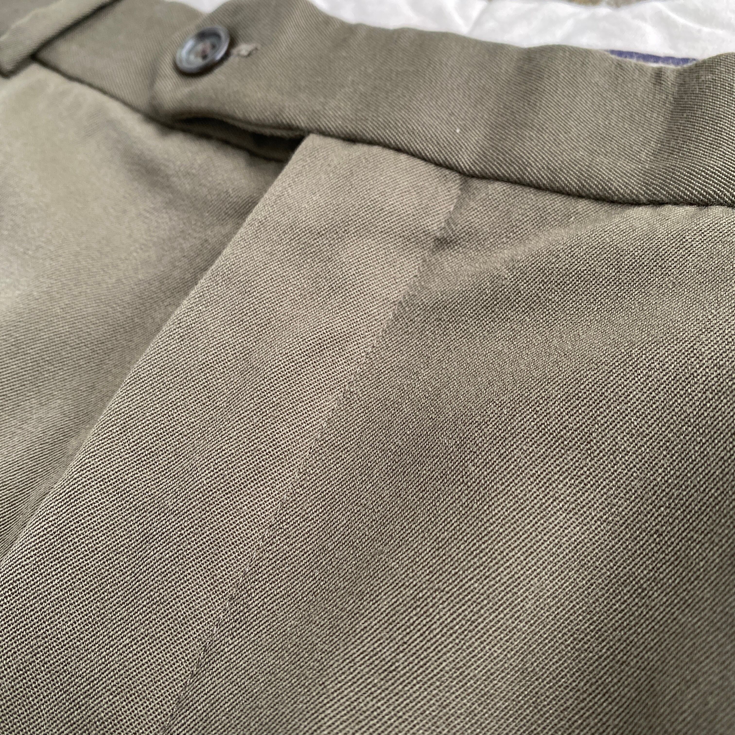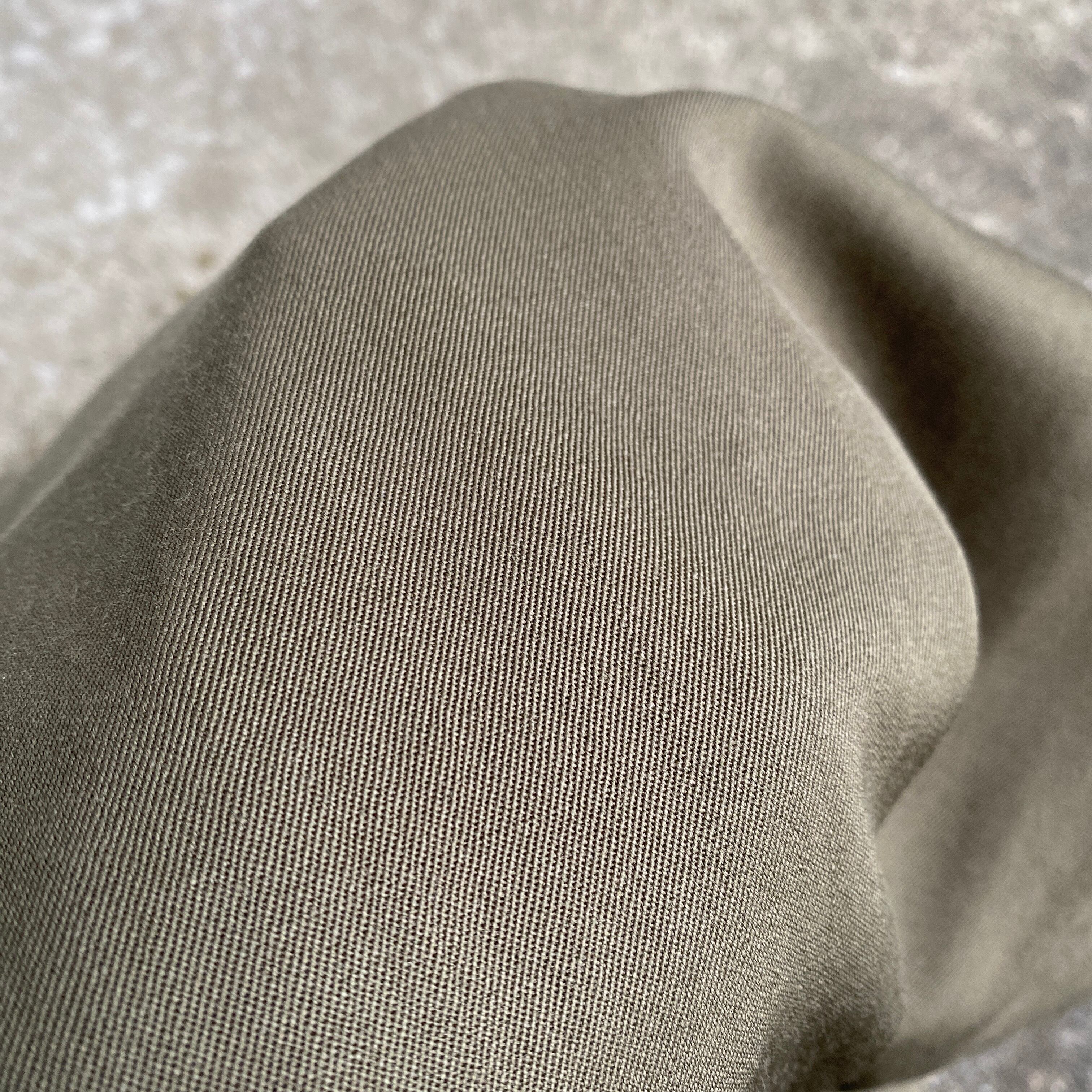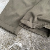 ウエスト、ワタリ付近のゆとりのあるパターン、生地のとろみから生まれる歩いた時のドレープ、美しいオリーブグレー系の色目は本当に素晴らしいです。
