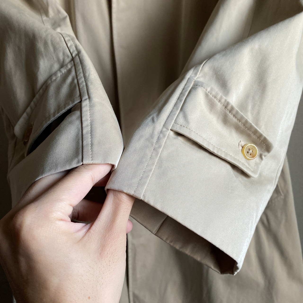 高密度に織られた鈍い光沢のコットンギャバジン地に、定番のベージュカラーは最高に格好良いです。