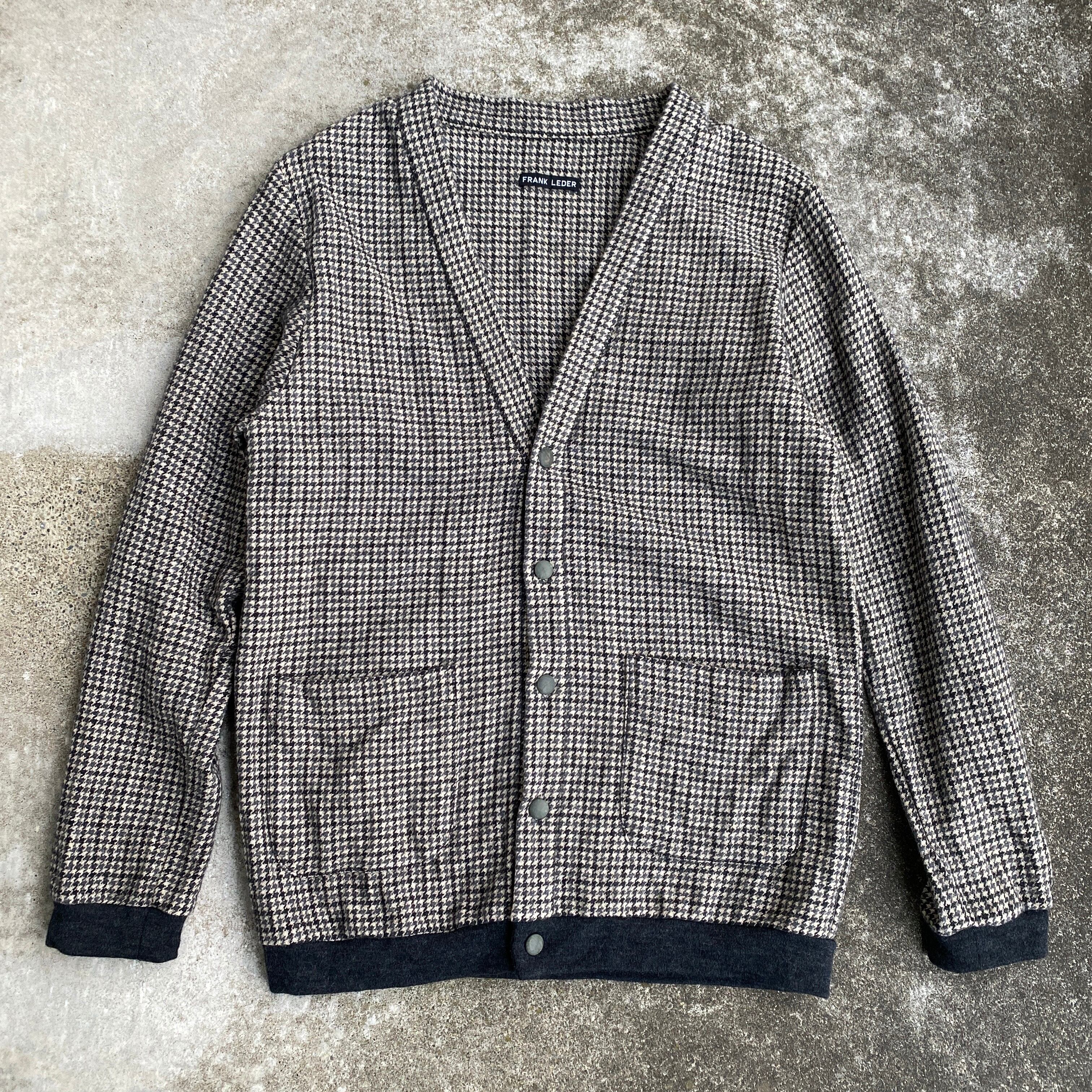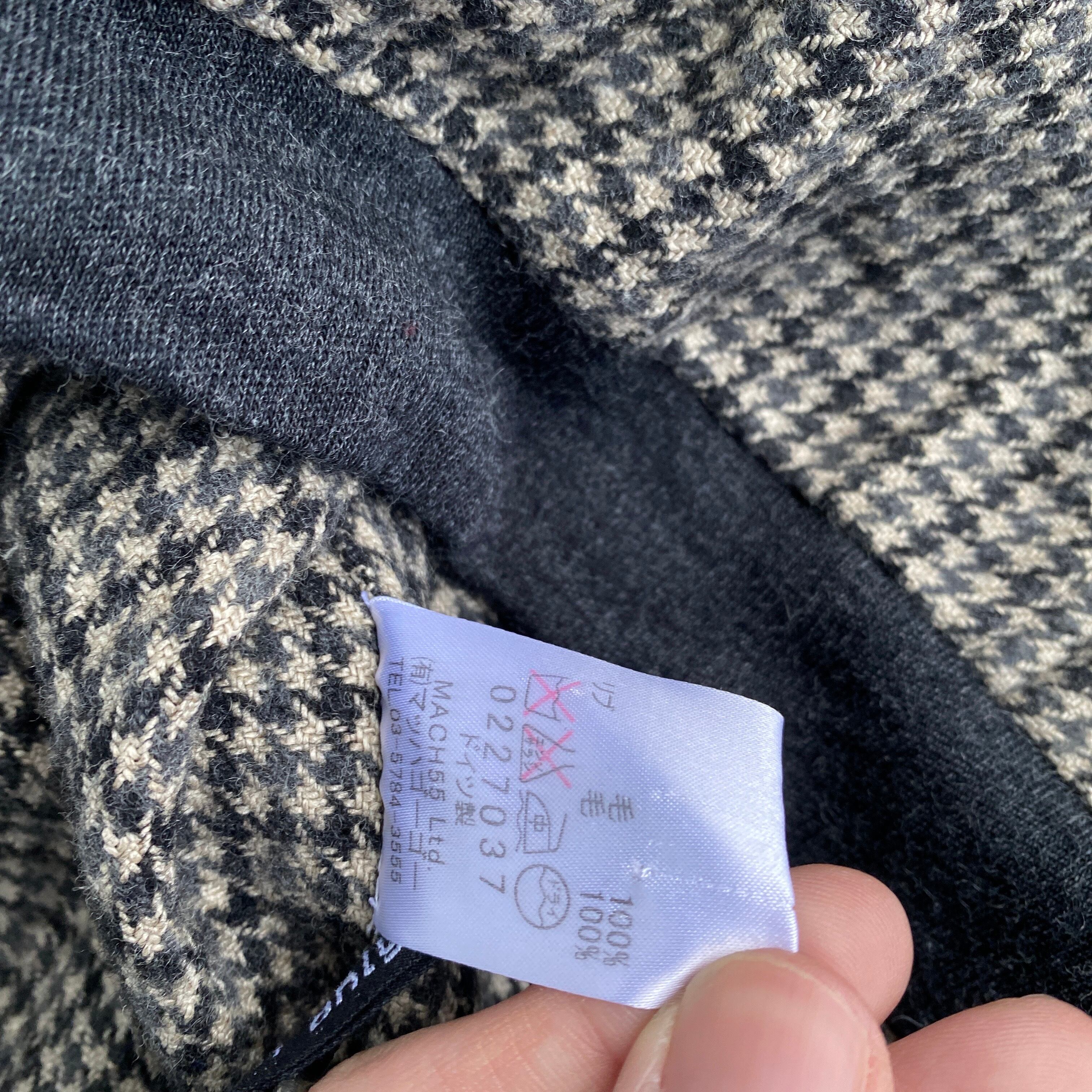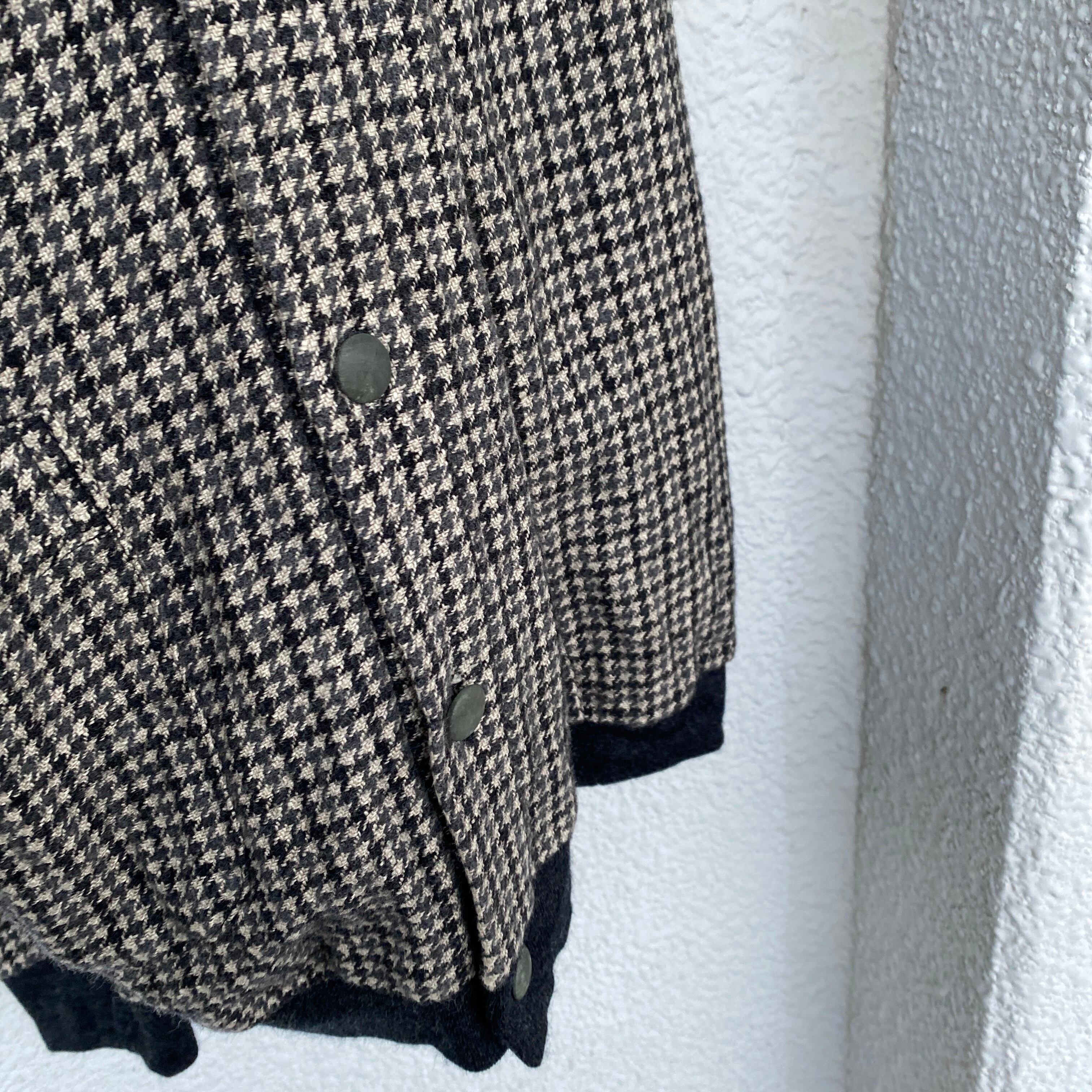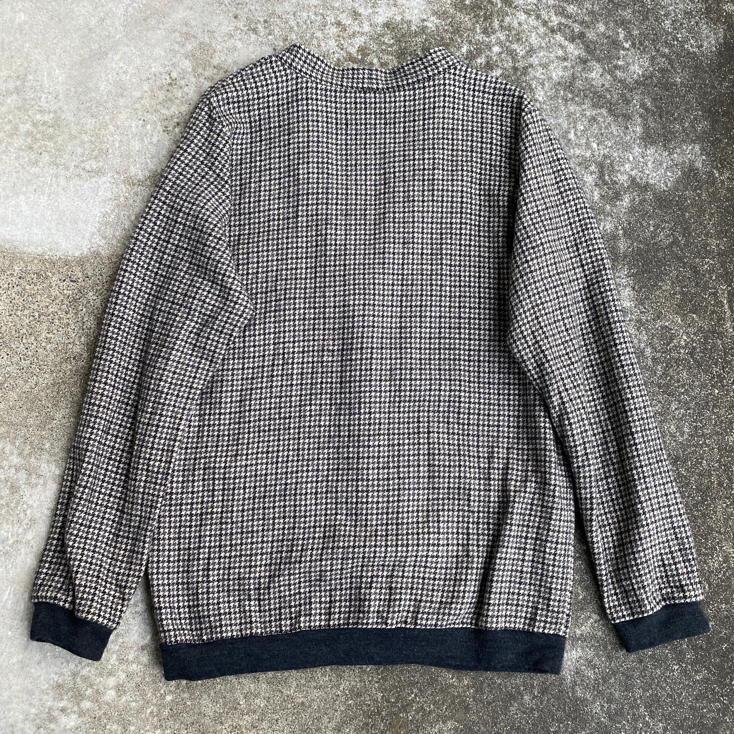 上質な梳毛ウールのハイゲージニットに、ブラック×グレー×ベージュの落ち着いた千鳥柄、ヴィンテージボタンの雰囲気が非常にかわいい一着。