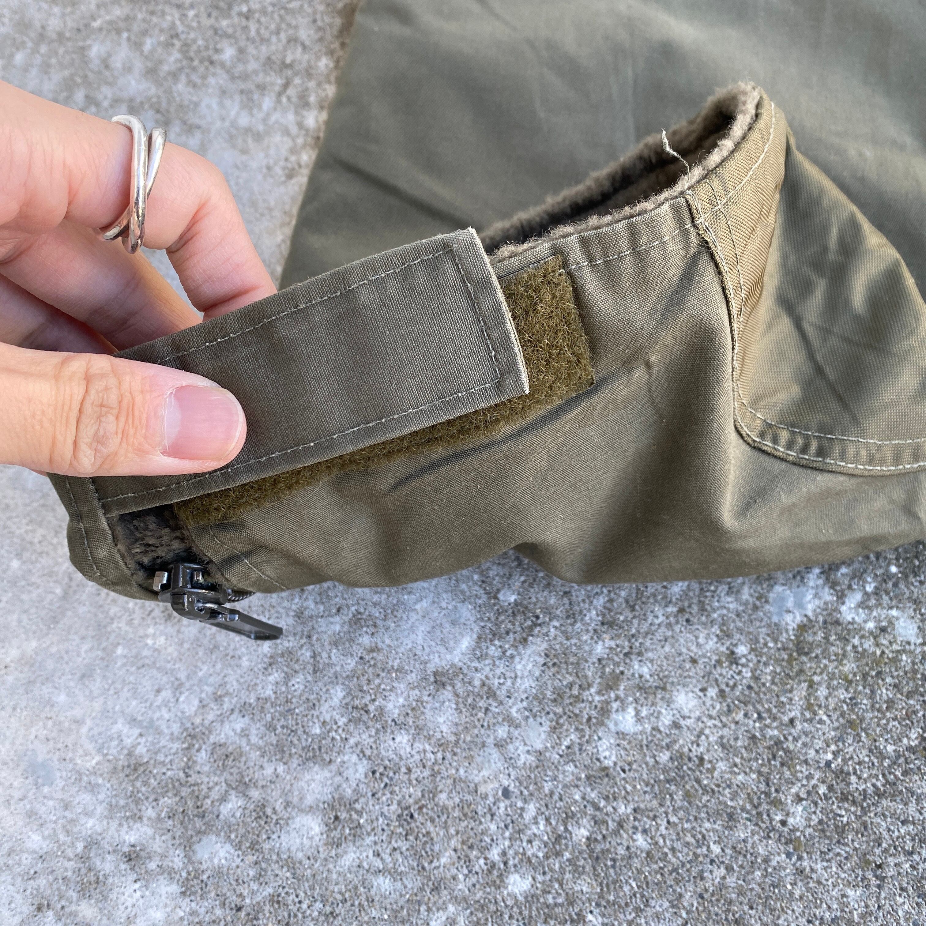 コットンナイロンのハリ感のある表地で防風性があり、裏が総ボアになっているため非常に暖かく、バイクや自転車を乗る方には最高です。