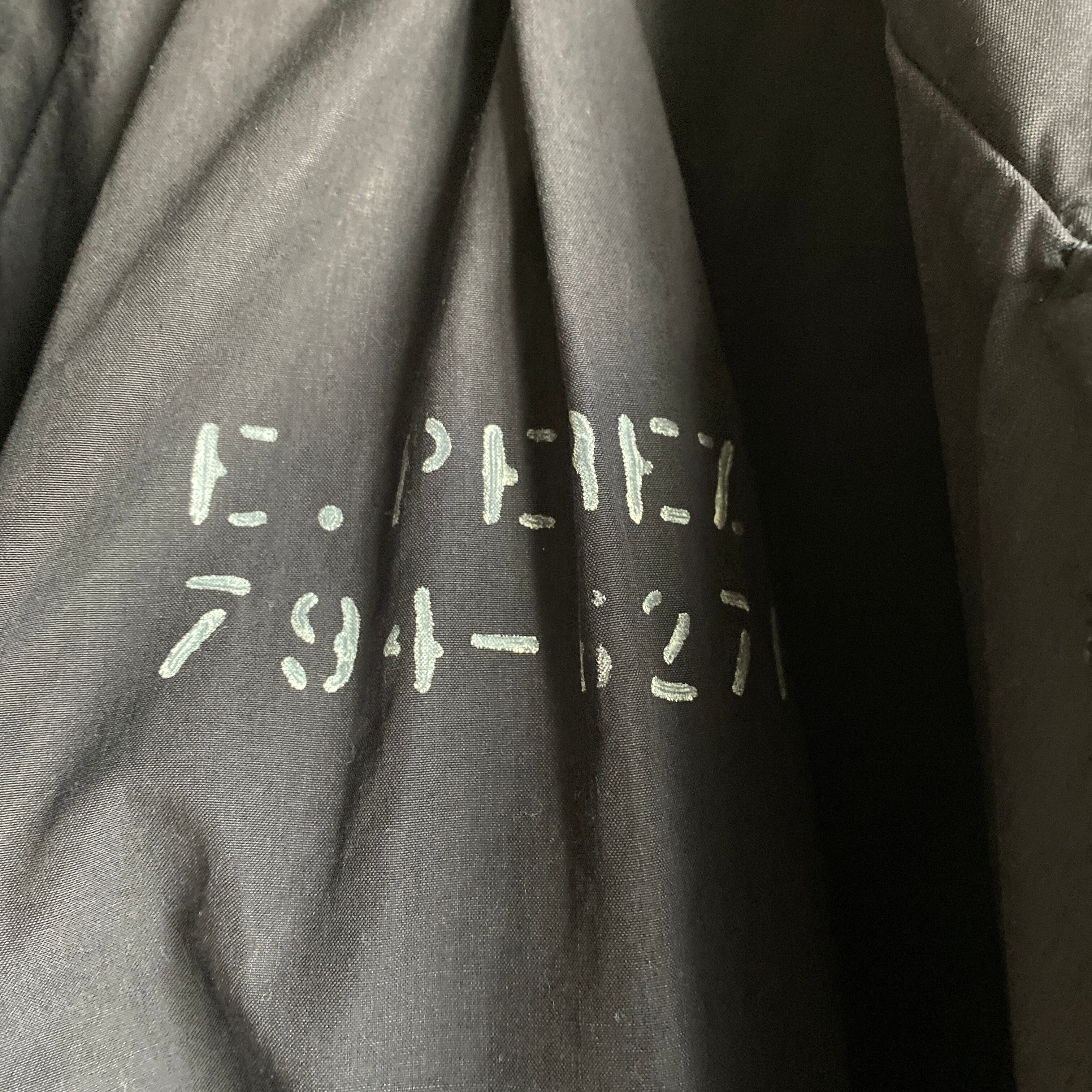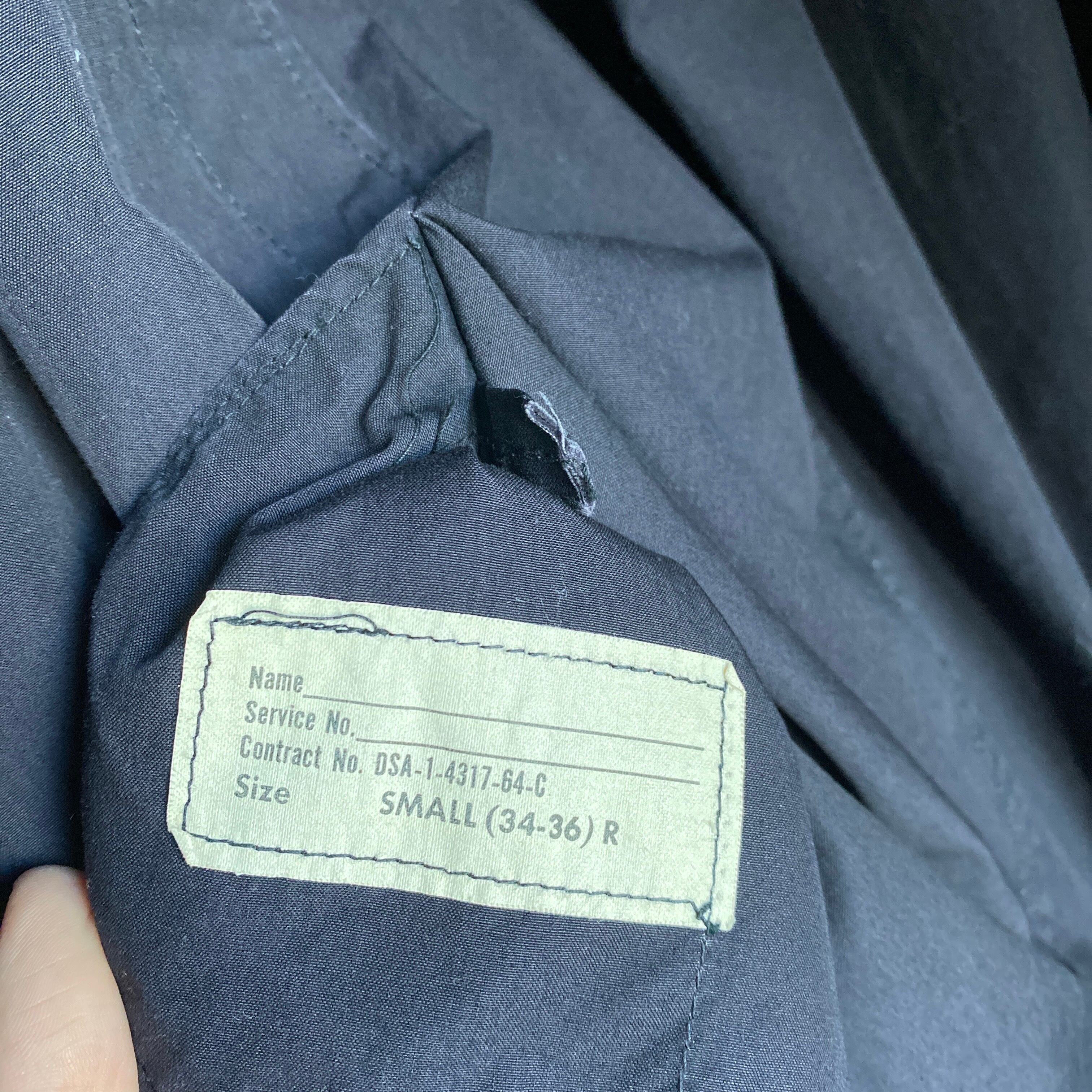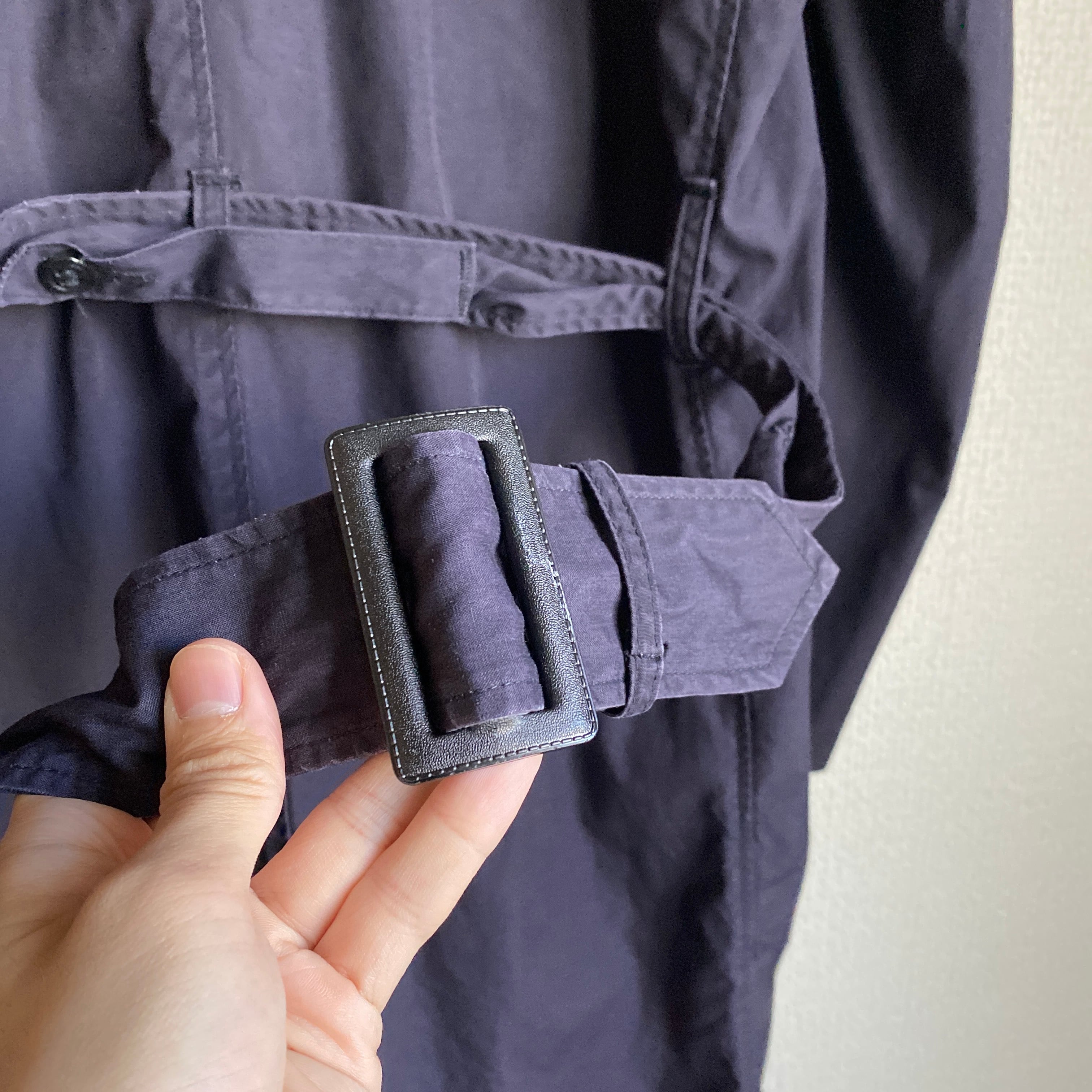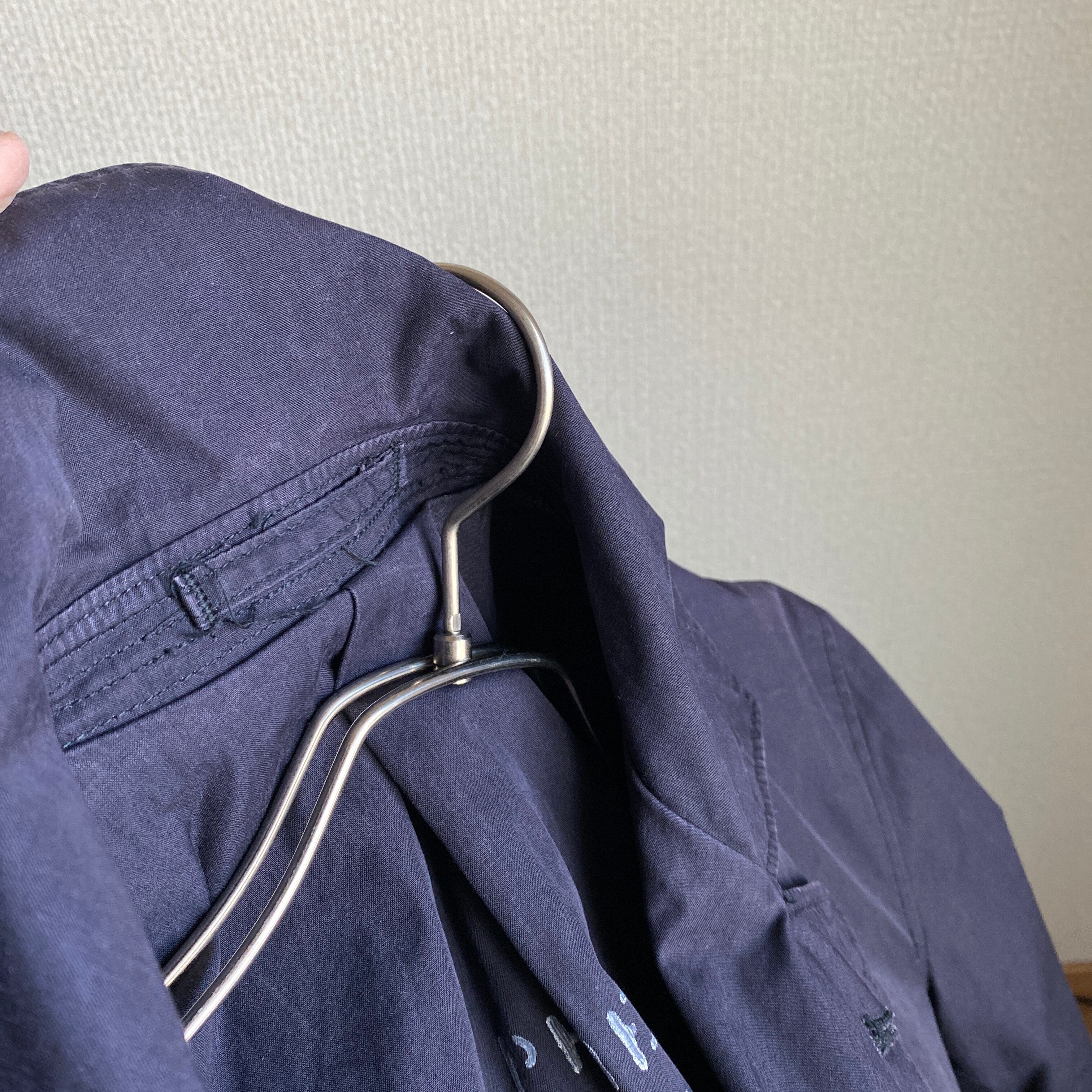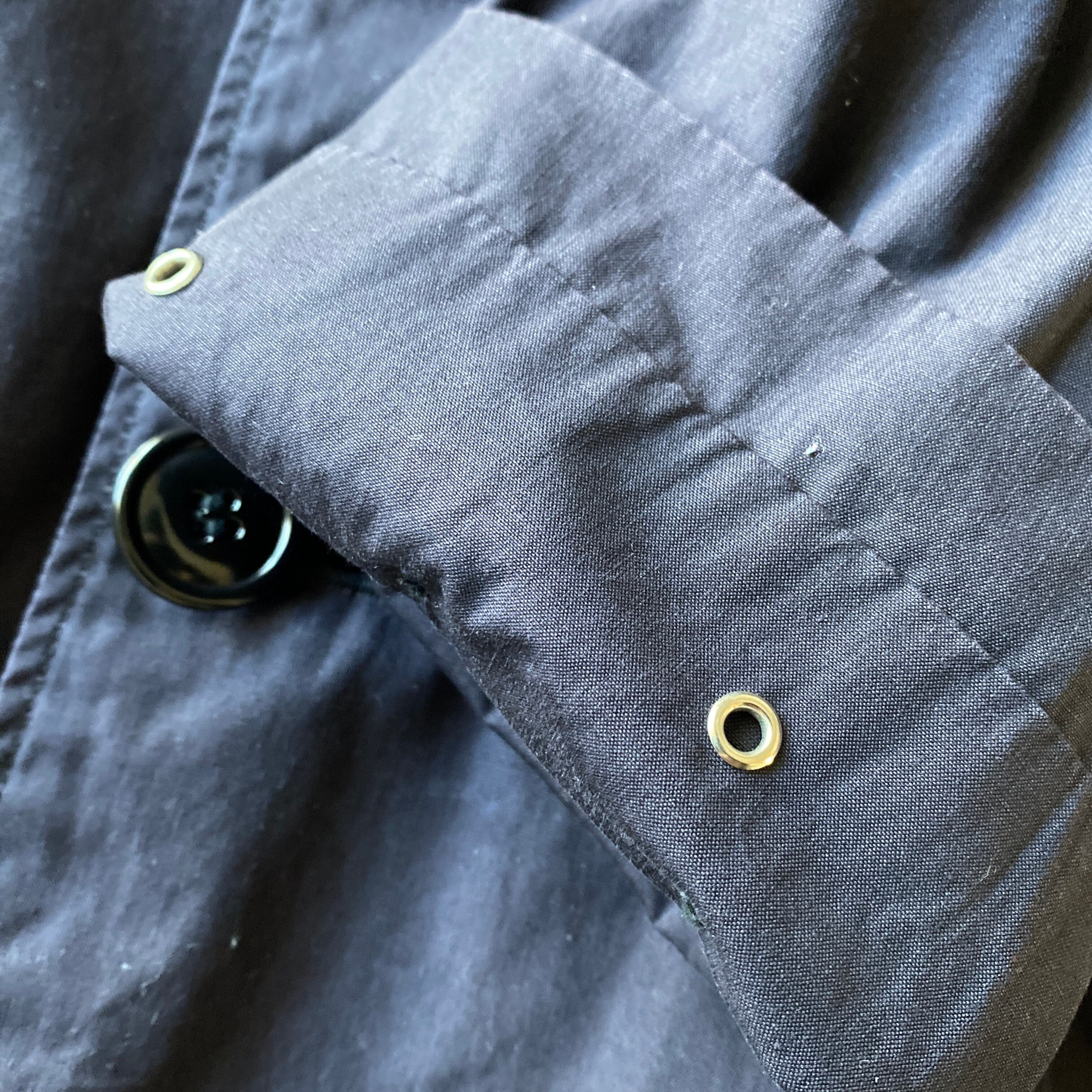 打ち込みの強いベンタイルのようなコットンポプリン素材、深い茄子紺の色目(画像1参照。ブラックに近いダークネイビーです。)エポレットのつかないミニマルなデザインが非常に格好良い一着。