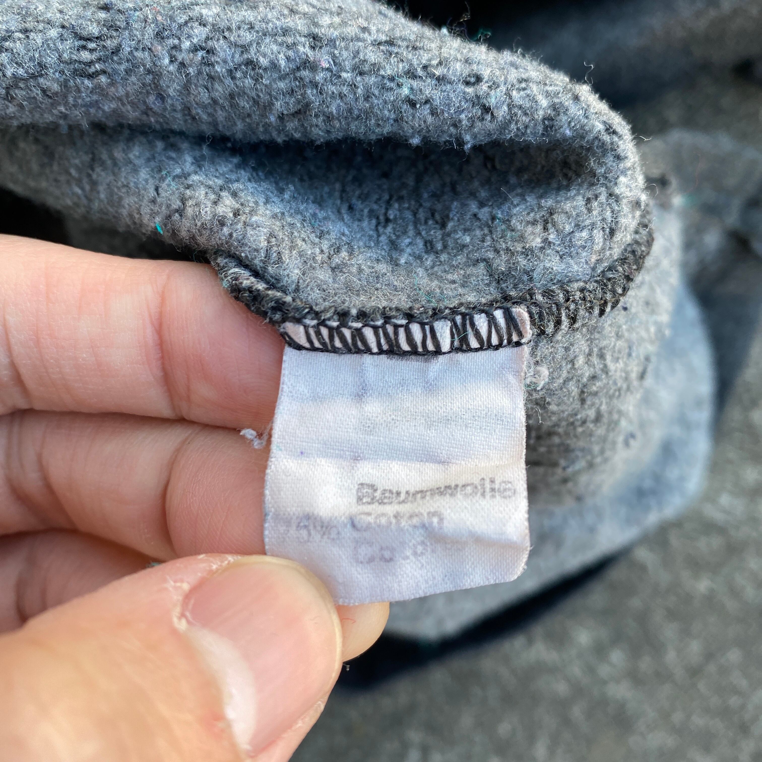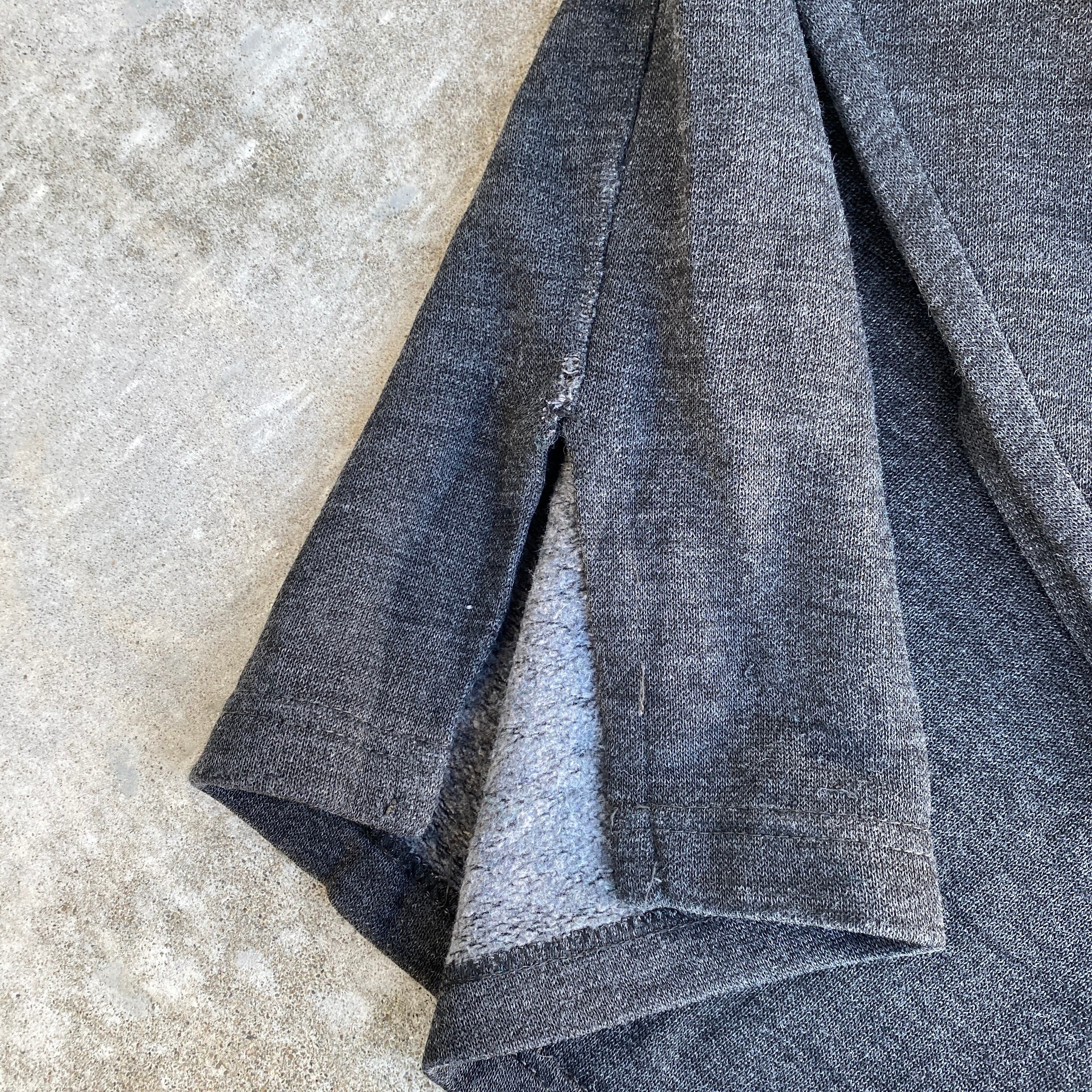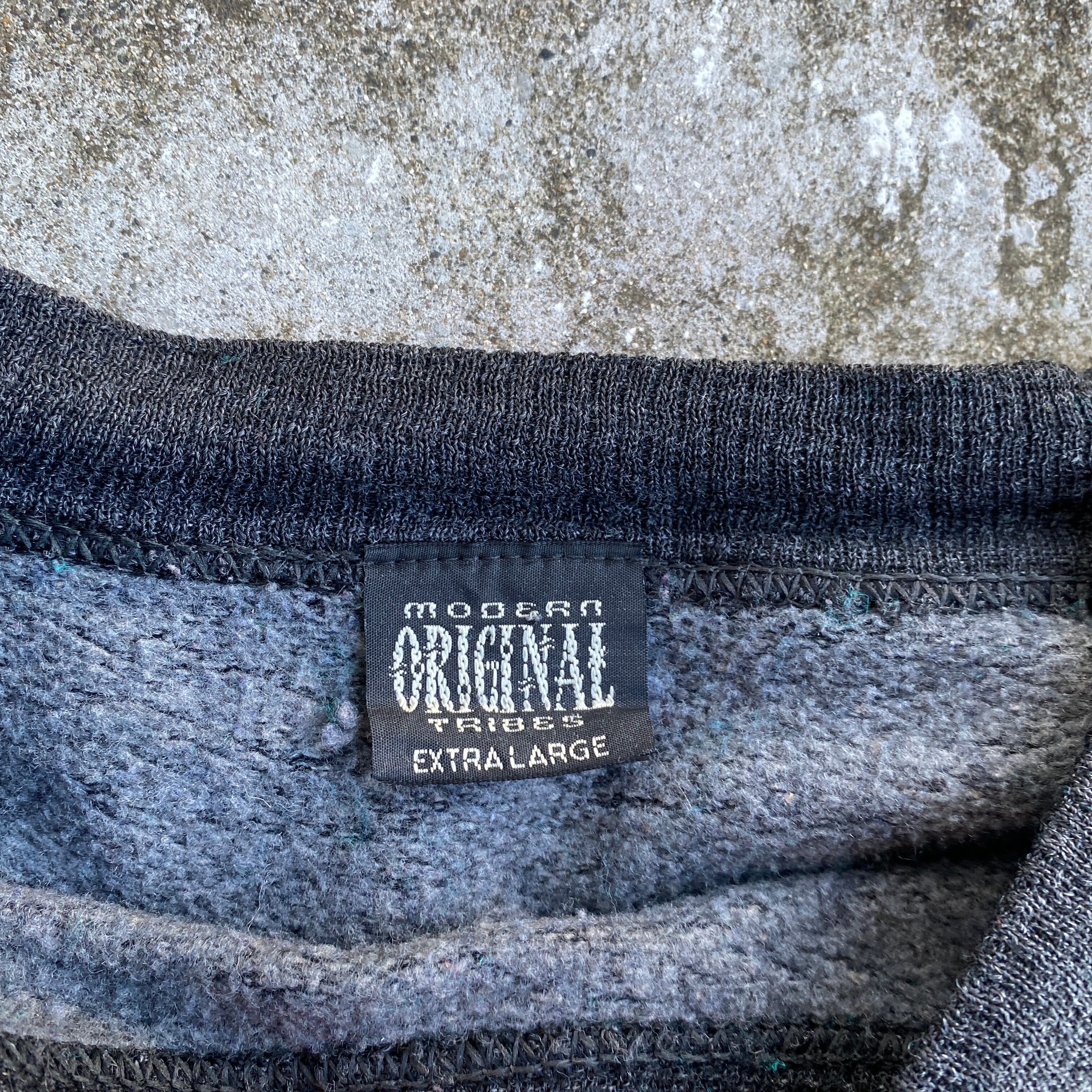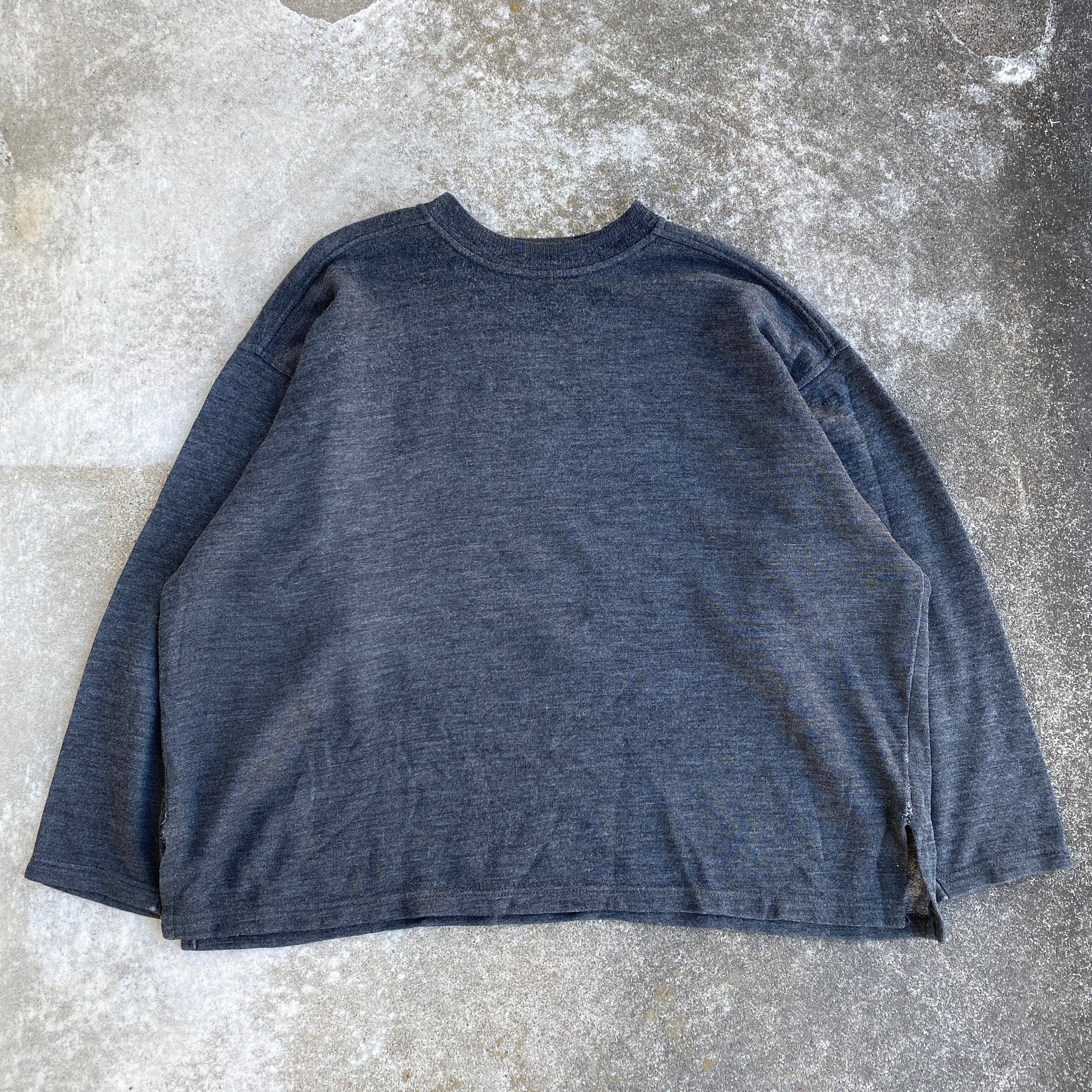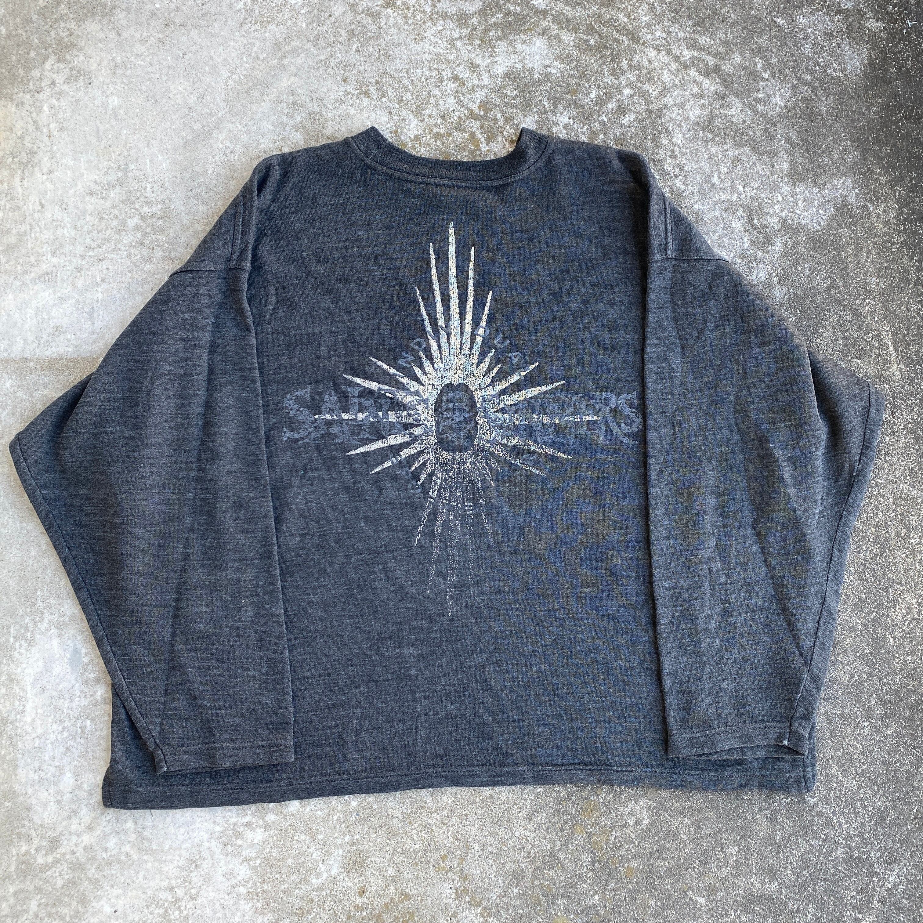プリントにindividual sportswear、内タグの素材表記からユーロのスポーツウェアだと思われますが、ビッグシルエットで80sモードのようなシルエット、saints and sinners(罪と罰)と入ったバッグプリント、コットン75ポリ25の落ち感のある生地感が最高にクールな一着。